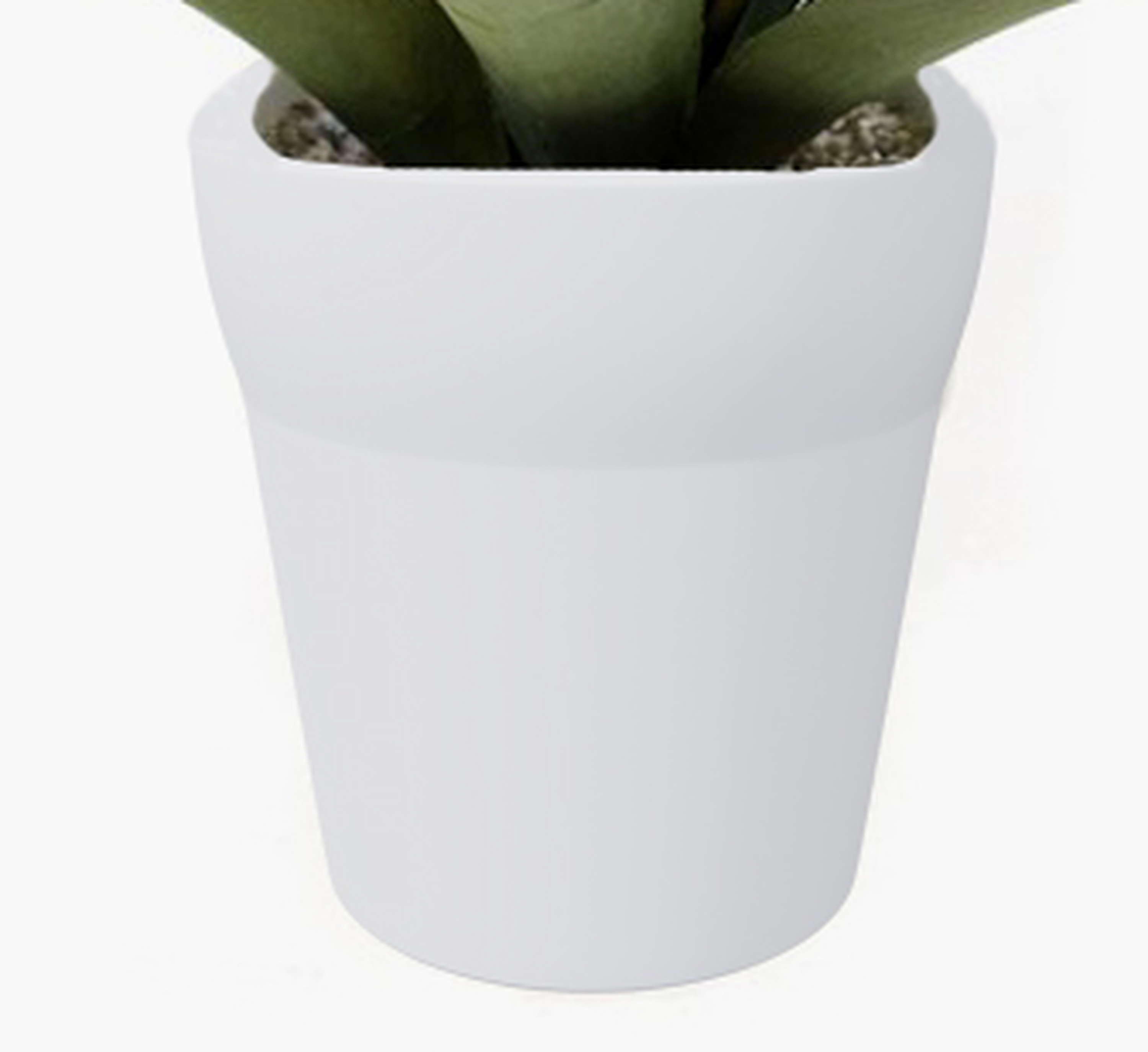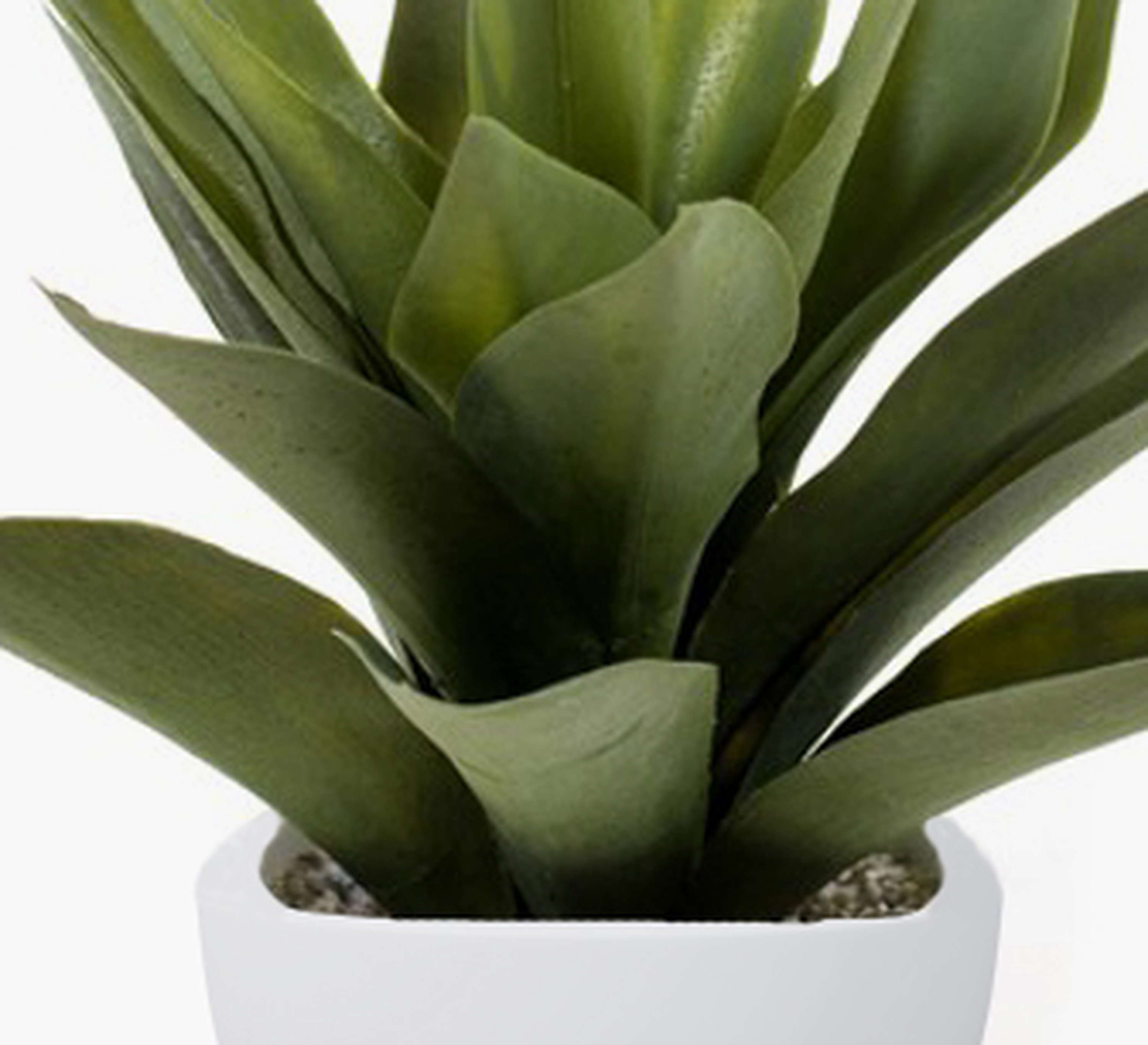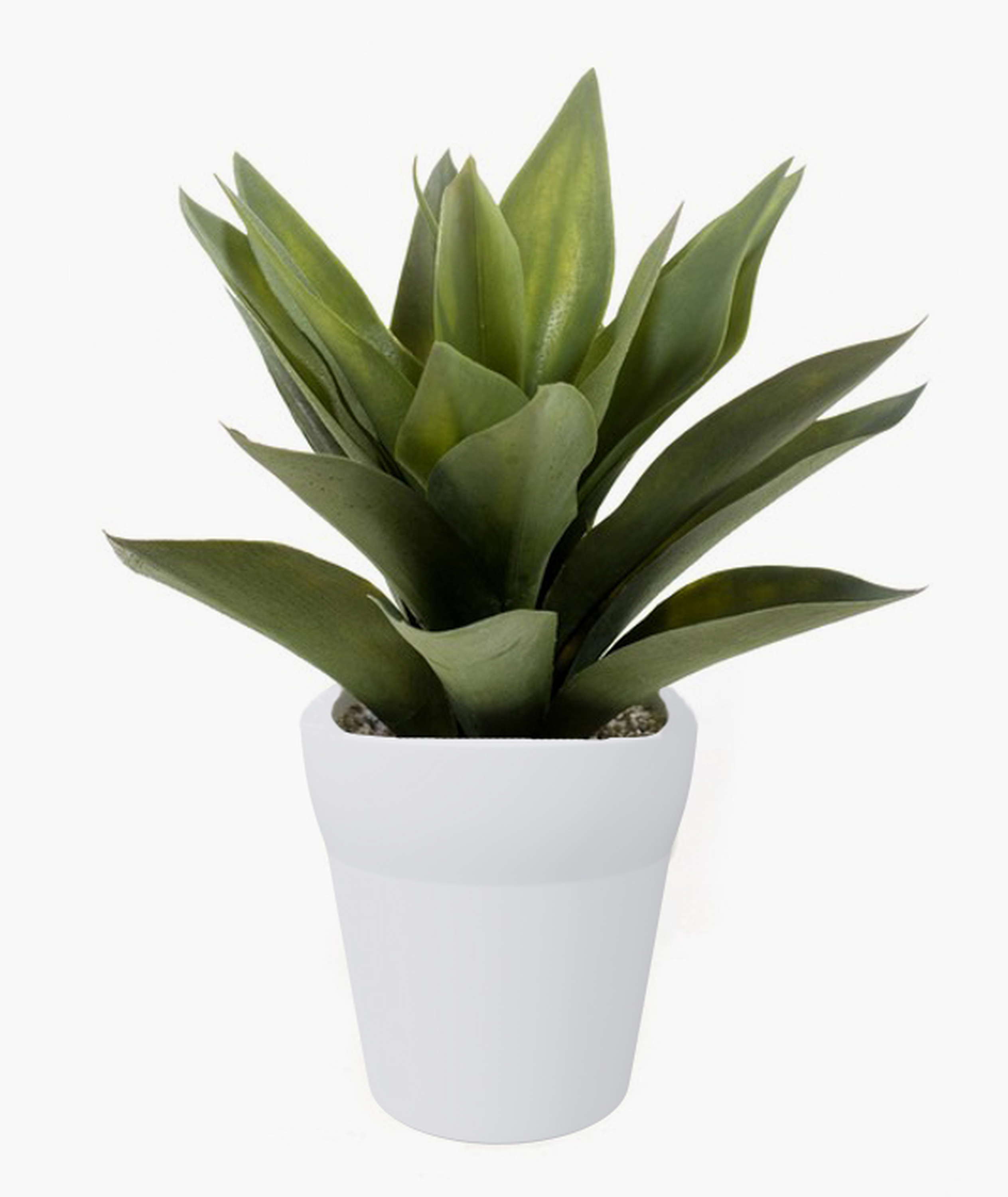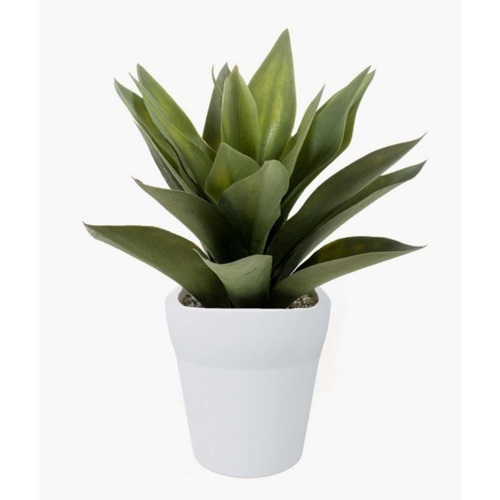 Agave synthétique composé de feuilles vertes. La plante est livrée dans son pot en terre cuite blanc et a une hauteur totale d’environ 30 cm.