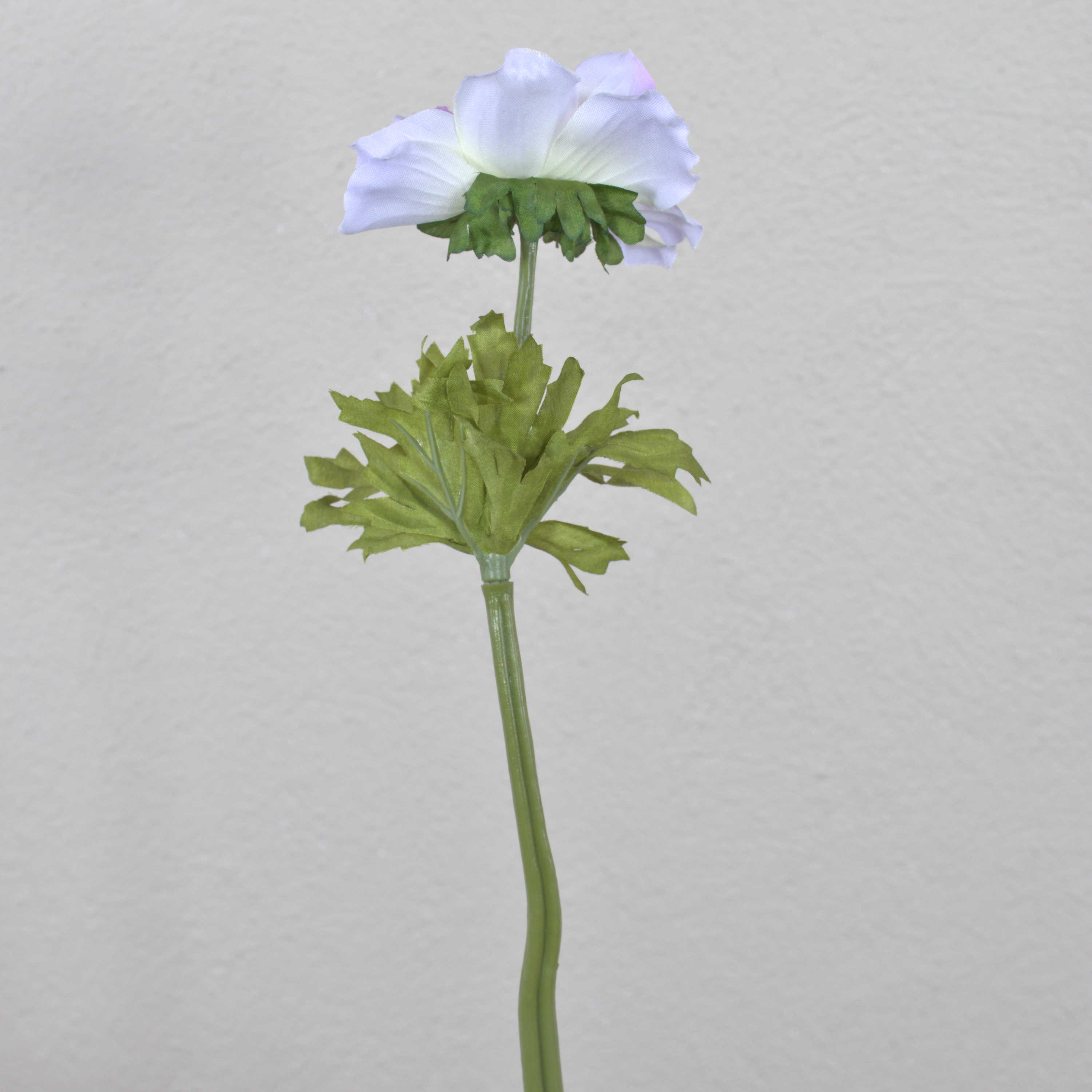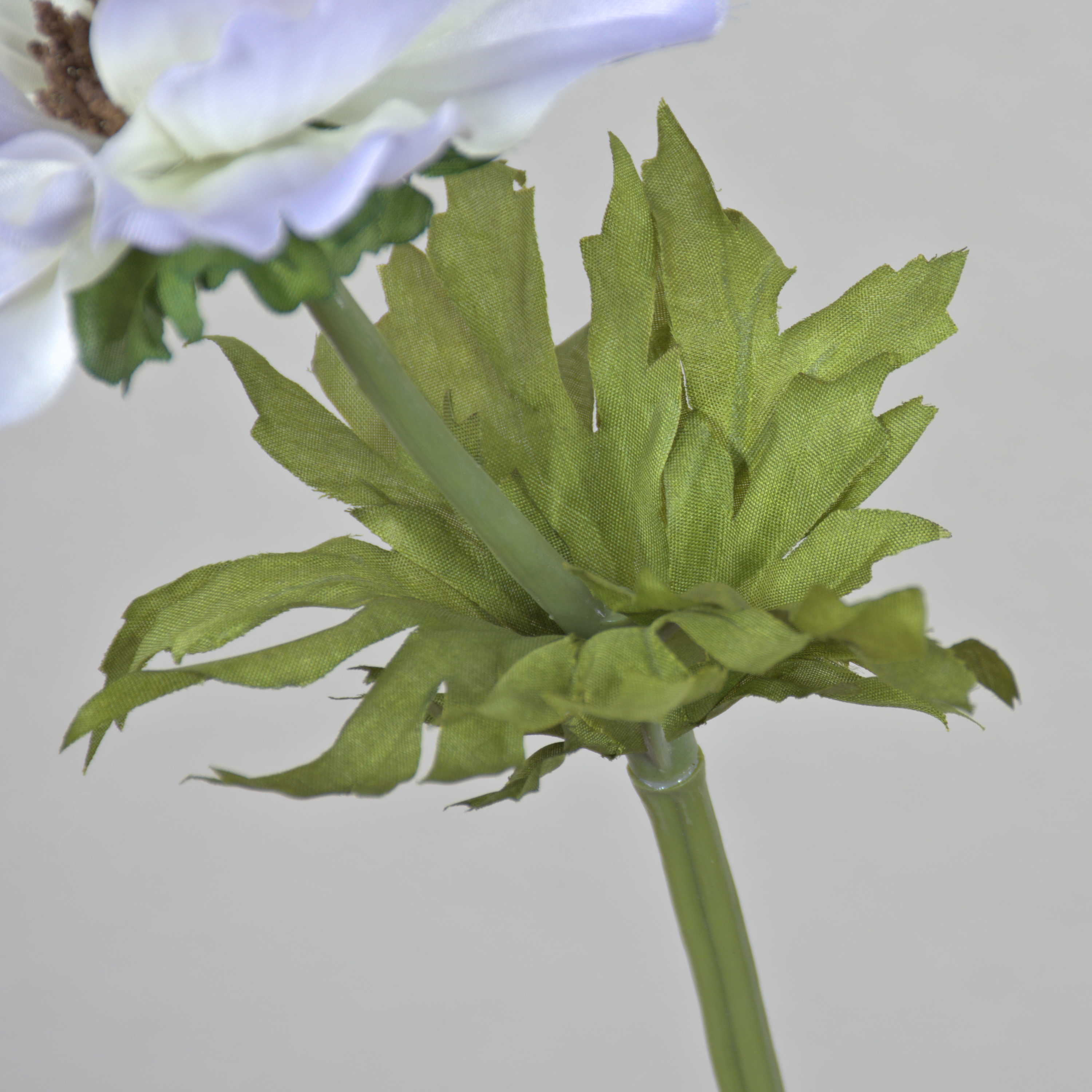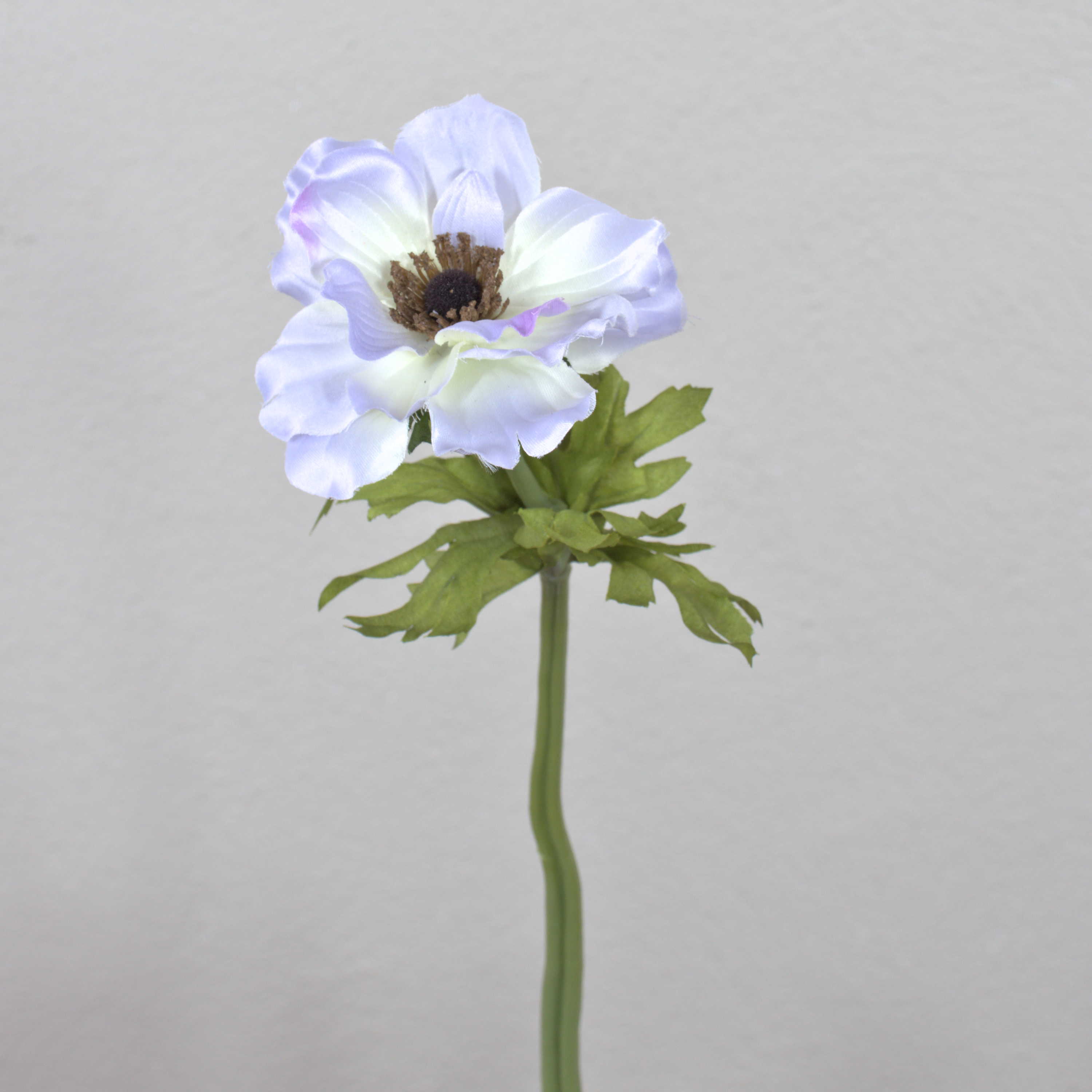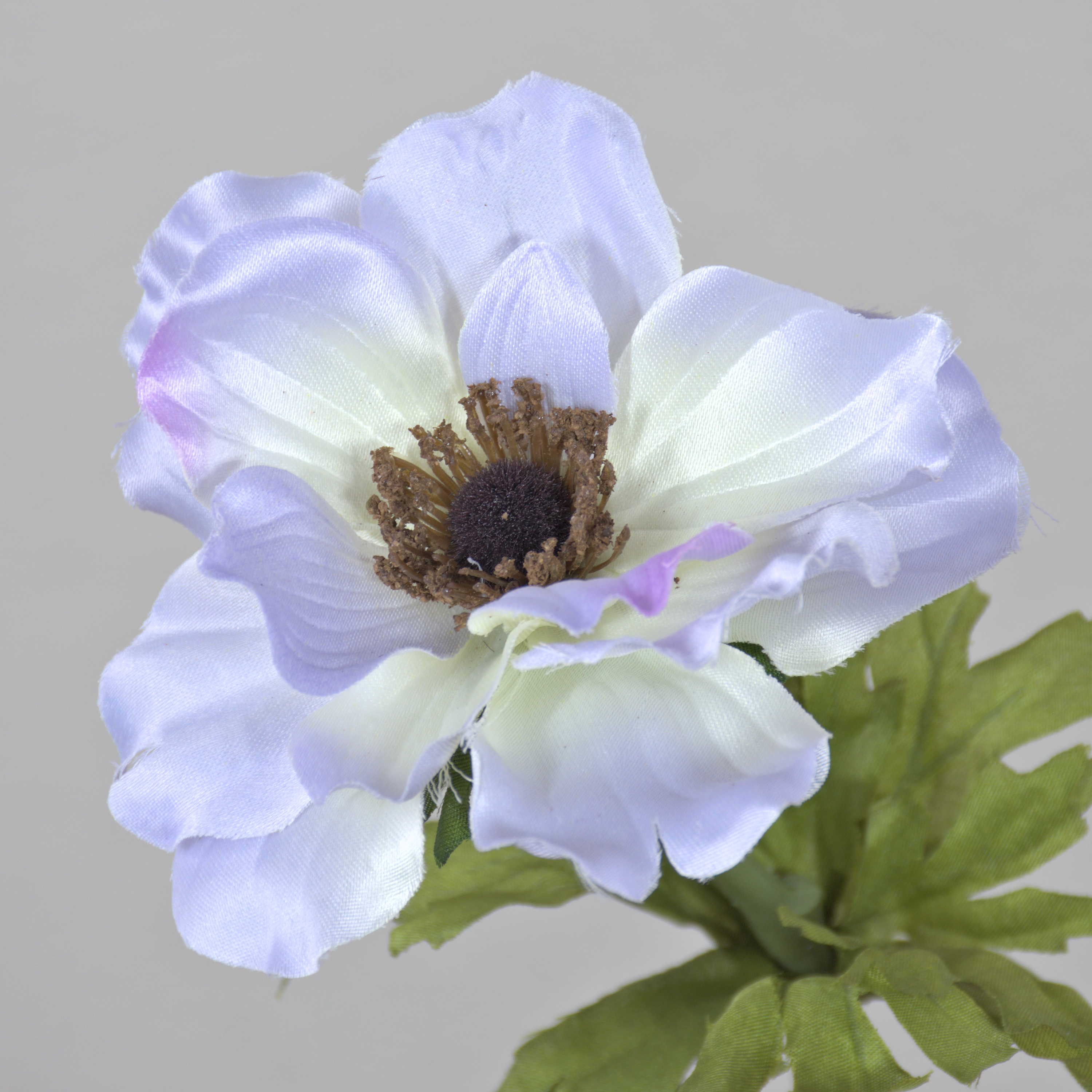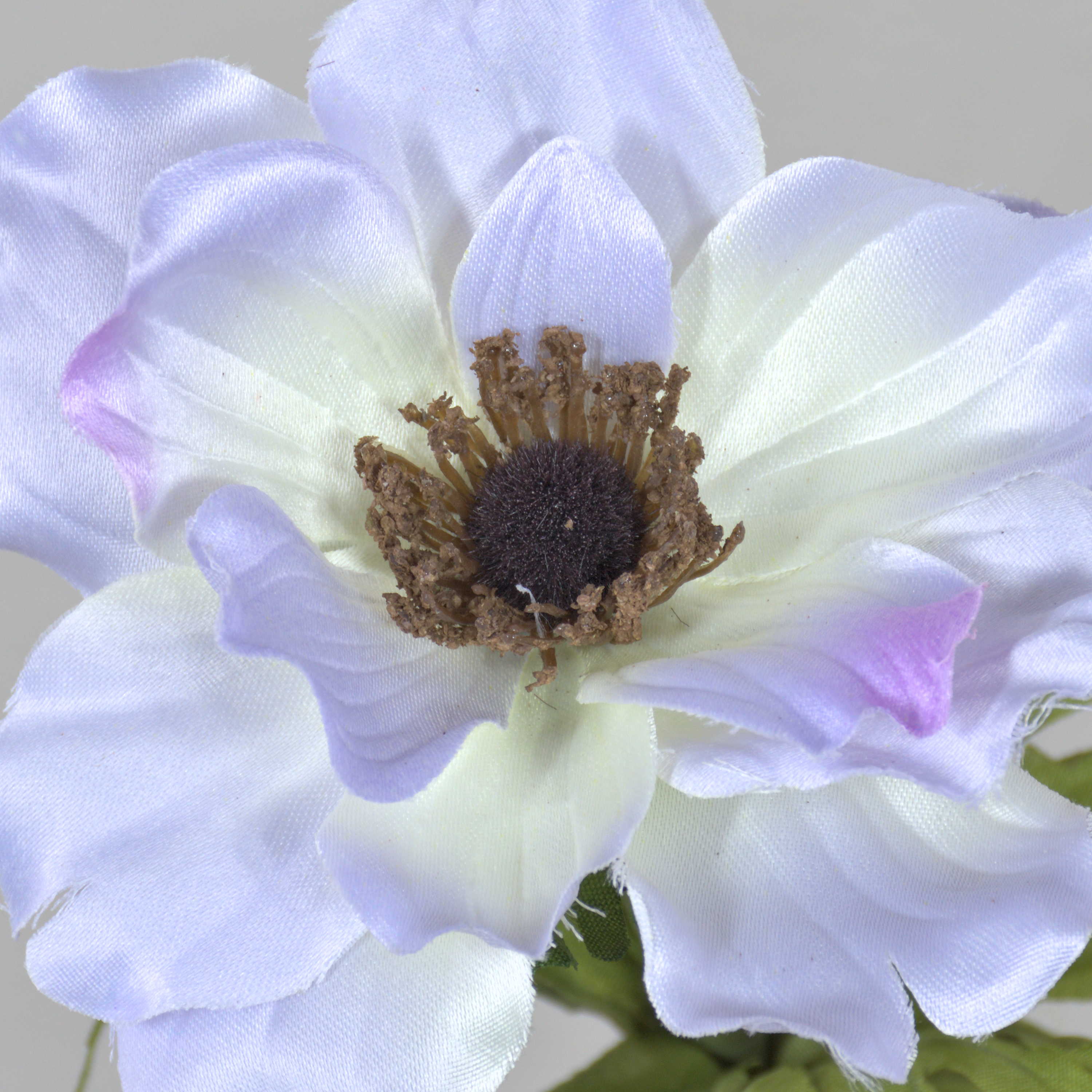 Anémone décorative de couleur bleu pastel / lavande. Cette fleur artificielle est pourvue de feuilles vertes et mesure au total environ 35 cm.