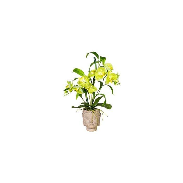Arrangement artificiel d'orchidée et de bambou MARAKI dans un pot en ciment en forme de tête de Buddha, racines, vert clair, 60cm