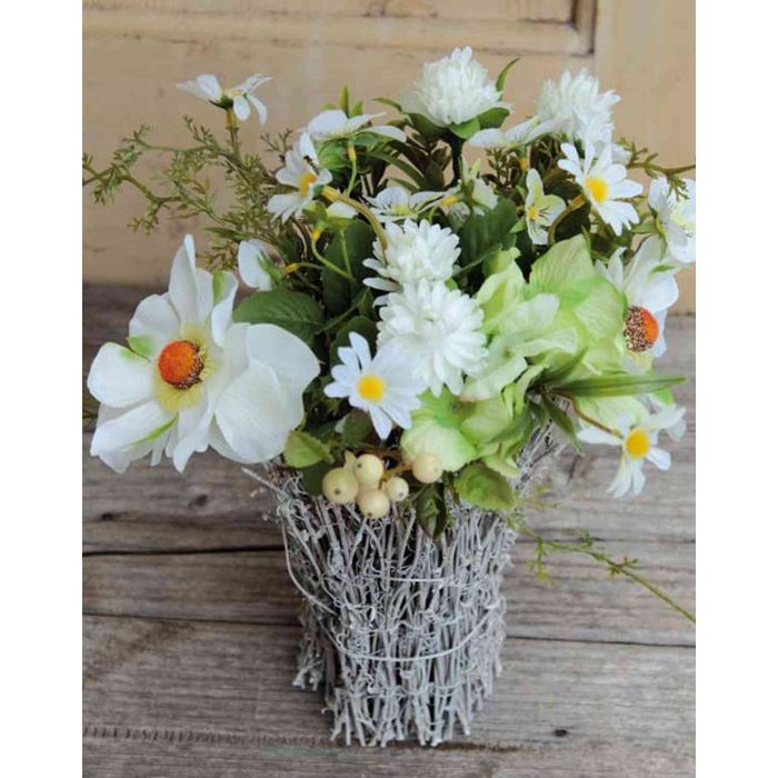 - L'arrangement se compose de pensées, d'anémones, d'un hortensia, de marguerites et de bleuets de couleur blanche en matériaux de grande qualité