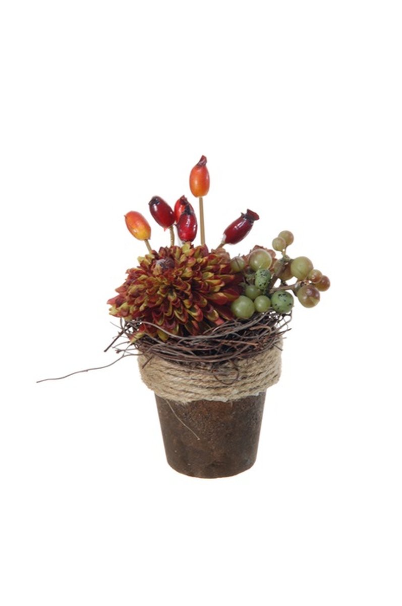 Arrangement de dahlia, de cynorrhodons et de raisins artificiel MUSAN, pot décoratif, rouge-orange-vert, 10cm, Ø7cm