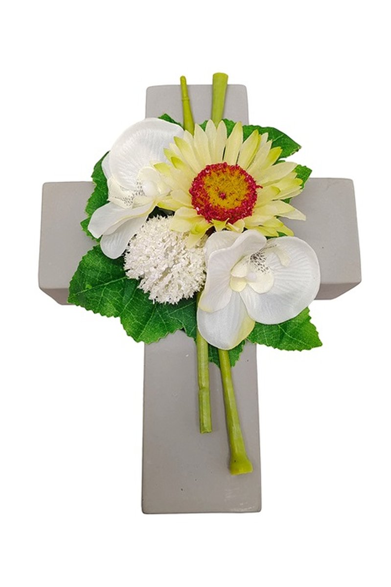 Arrangement de gerbera, d'orchidée et d'allium artificiel ANSGAR, croix de plantes, blanc-jaune, 20x15x9cm