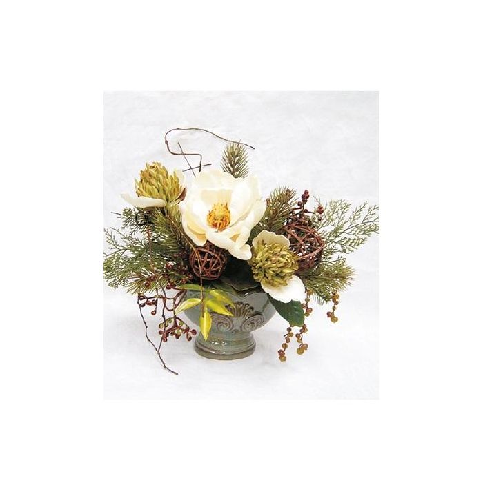Arrangement de magnolia, de protea et de baies artificiel TORWI, cache-pot, blanc-vert, 31cm, Ø34cm