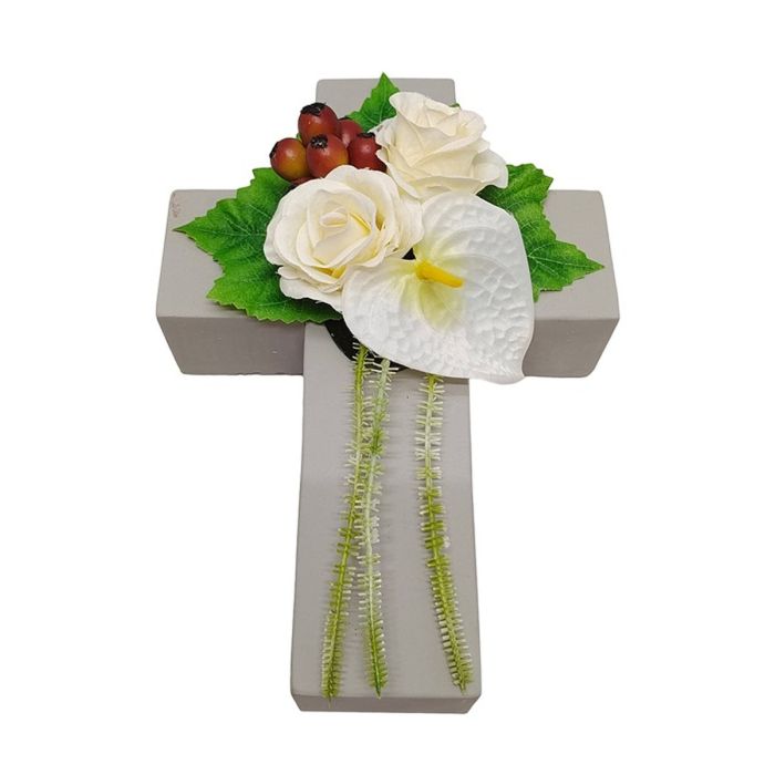 - La composition florale raffinée sur une croix constituera un bel enrichissement, par exemple pour la décoration d'une tombe, veuillez noter que nous ne pouvons pas garantir la longévité et la résistance pour une utilisation en extérieur, les fleurs artificielles peuvent se décolorer sous l'effet des rayons UV, devenir cassantes ou être arrachées par le vent !