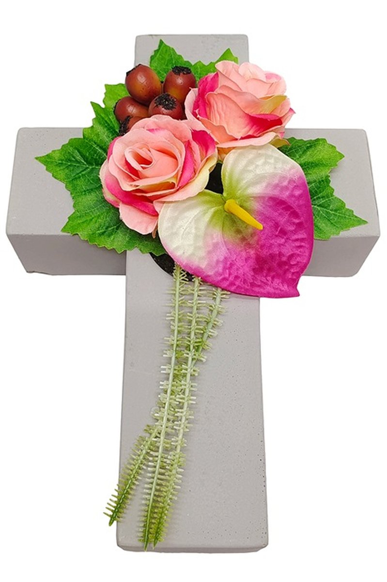 Arrangement de rose, d'anthurium et de cynorrhodon artificiel NINNA, croix de plantes, rose-fuchsia-rouge, 30x18x11cm