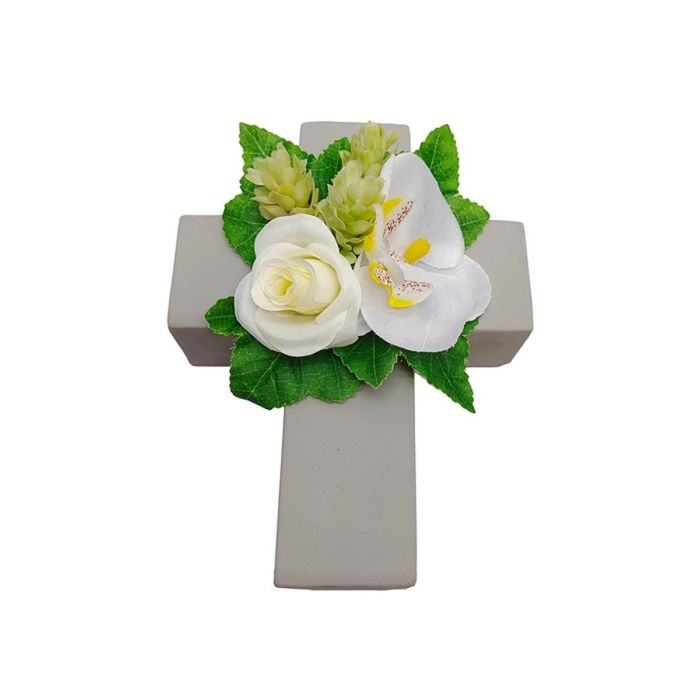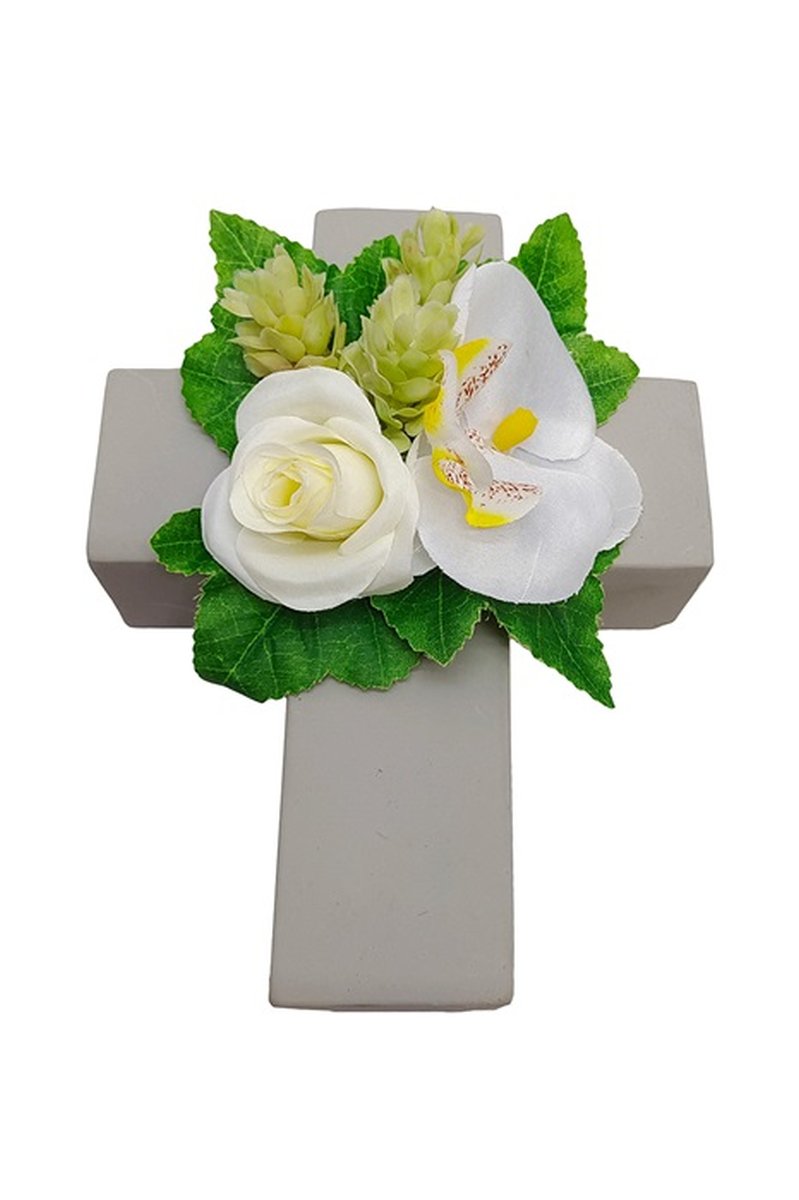 Arrangement de rose, d'orchidée et de houblon artificiel ARIADNA, croix de plantes, blanc, 20x15x9cm