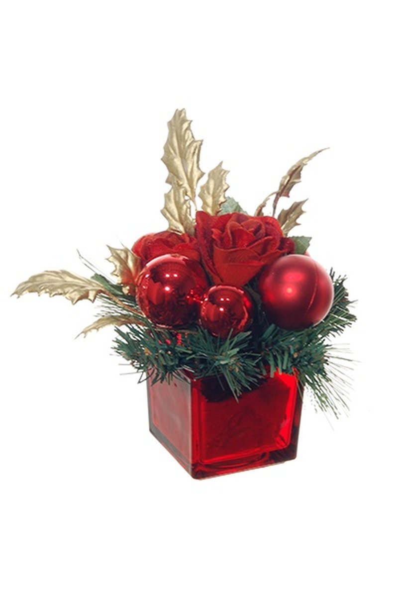 Arrangement de rose, de pin et de houx artificiel HALANA avec boules, verre décoratif, rouge-or, 13cm, Ø19cm