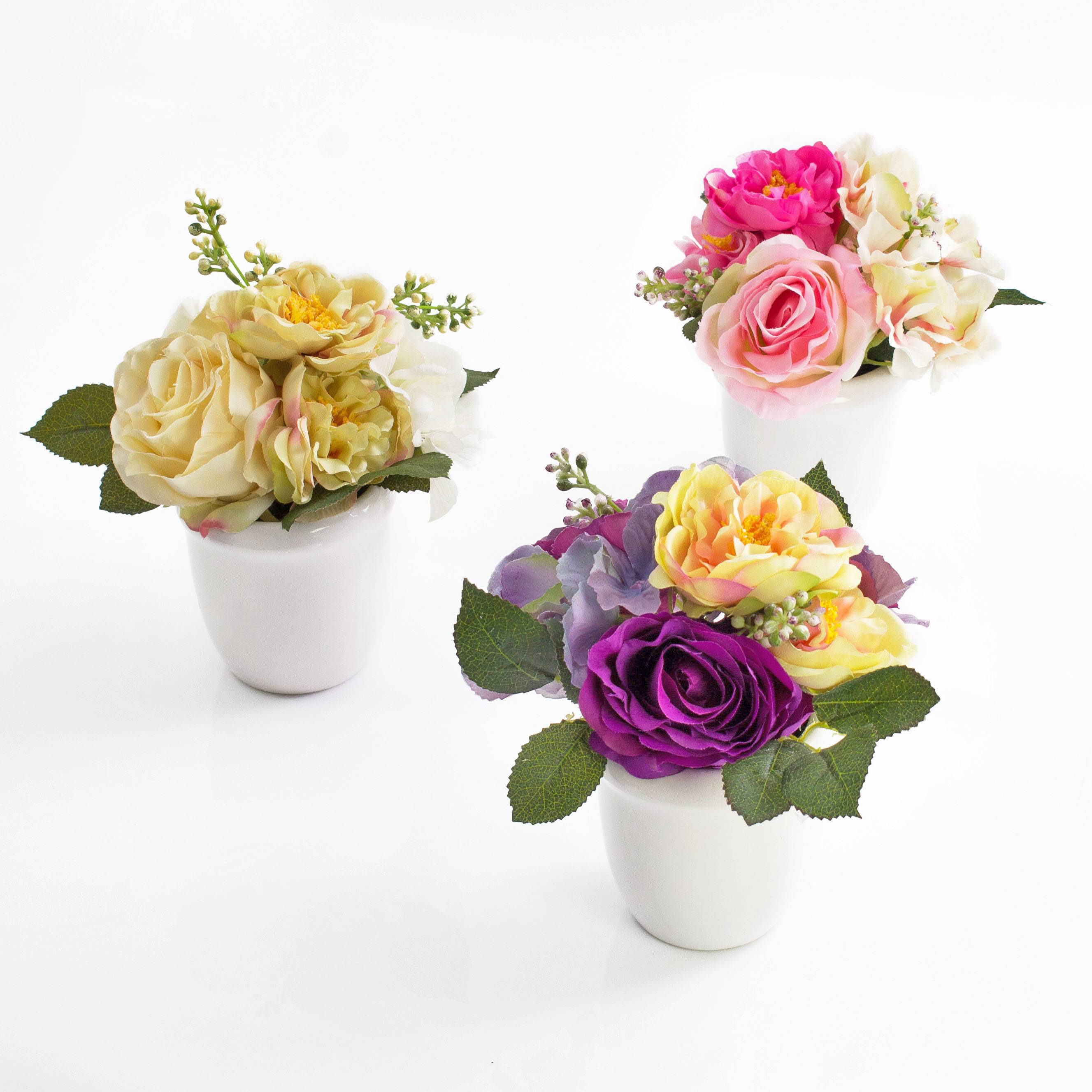 Arrangement FELINE de roses et d'hortensias en soie dans un pot en céramique