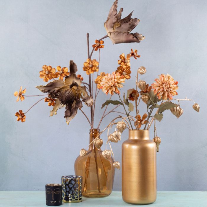 Un dernier éclat de la nature! Comme les fleurs changent joliment de couleur avant l'arrivée de l'hiver. Ce look a été enrichi d'accents dorés et d'un dahlia d'un abricot délicat. Le physalis doré brille entre les fleurs et complète le style. Embellissez vous aussi votre intérieur ! Shop the look!