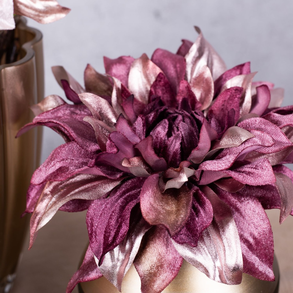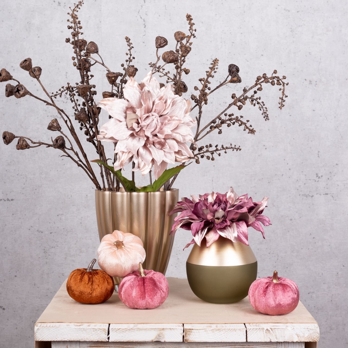 L'or brille avec le velours ! Nos produits veloutés sont particulièrement tendance, ils sont si doux et moelleux qu'ils donnent vraiment envie de s'y blottir. Les délicates nuances de rose combinées à l'or et à d'autres couleurs automnales rendent ce look si particulier. Le grand dahlia s'accorde parfaitement avec les branches de gaultheria brunes et d'eucalyptus avec des fruits qui se trouvent dans le vase doré mat et qui vont tout simplement super bien avec les citrouilles douillettes. Ce look est parfait pour l'automne et présente des couleurs modernes, sans l'orange classique des citrouilles typiques de l'automne. Embellissez vous aussi votre intérieur avec nos idées. Shop the look!