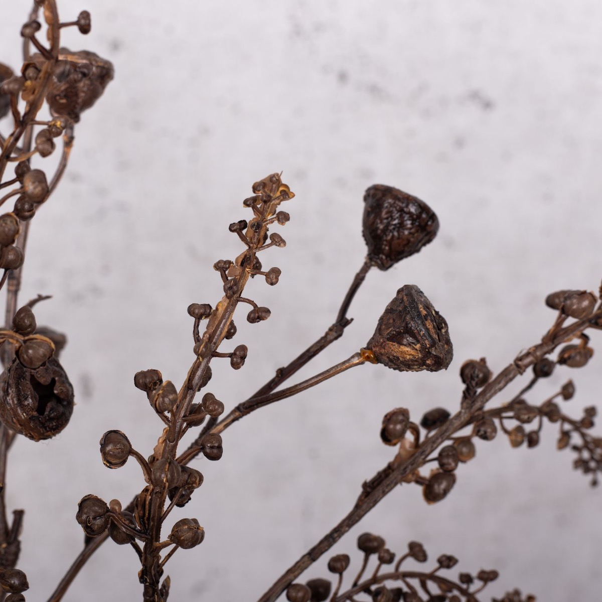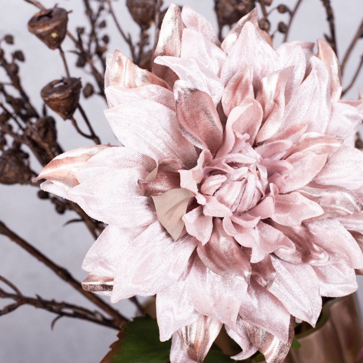 Conseil d'aménagement : Raccourcir les branches brunes à la taille du vase et les disposer dans la partie extérieure du vase. Le dahlia velouté est également raccourci et placé au centre du vase. Ce look est vraiment facile à reproduire et ne nécessite qu'un coupe-fil ou une pince.