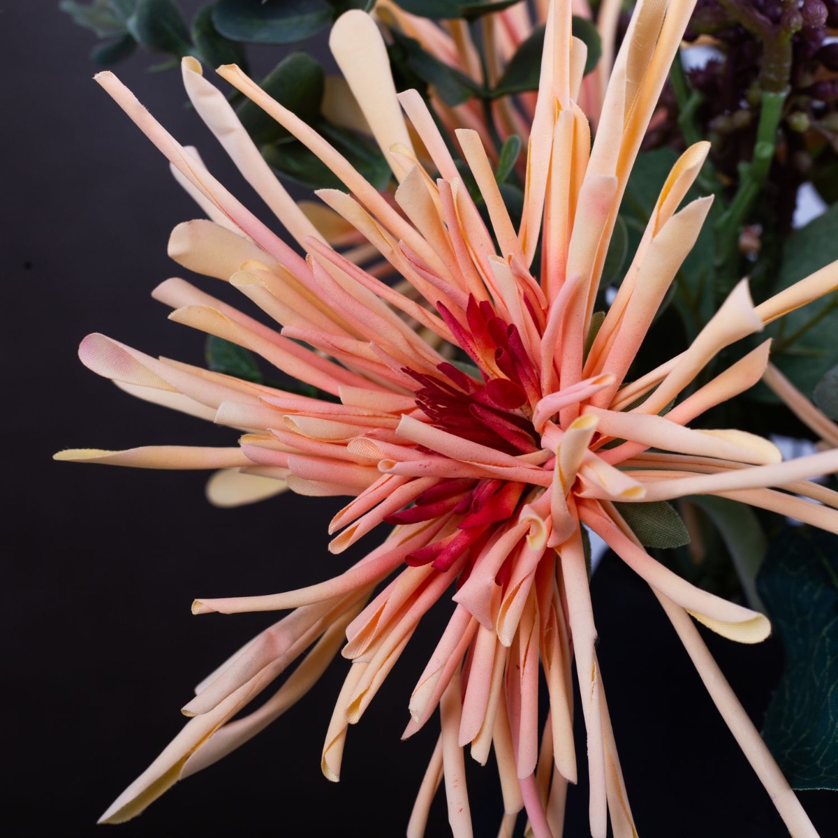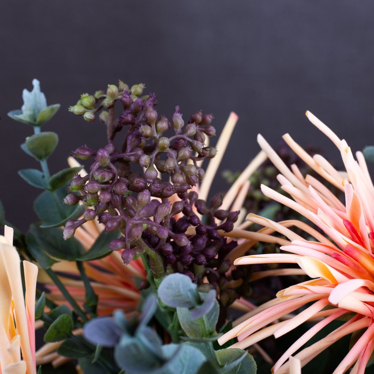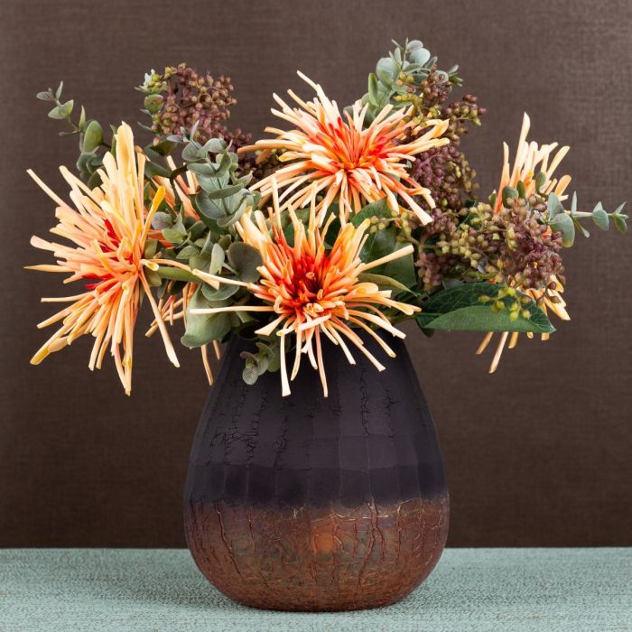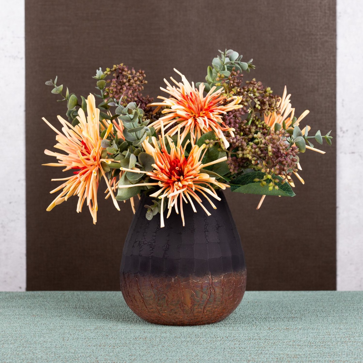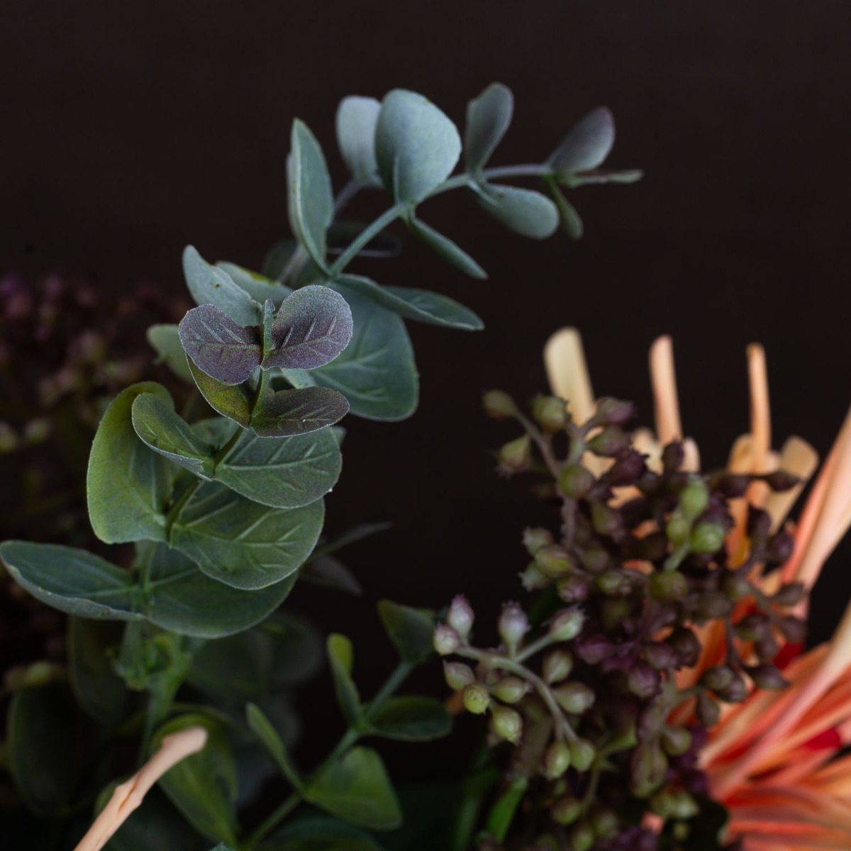 L'orange et le brun ! Ce sont les couleurs marquantes de ce look et elles montrent ici à quel point elles vont bien ensemble. Le brun foncé du vase se met en retrait et laisse briller les couleurs des chrysanthèmes. Les fleurs sont parfaitement complétées par le laurier tin et l'eucalyptus. Ce bouquet fait rayonner votre intérieur. Shop the look!