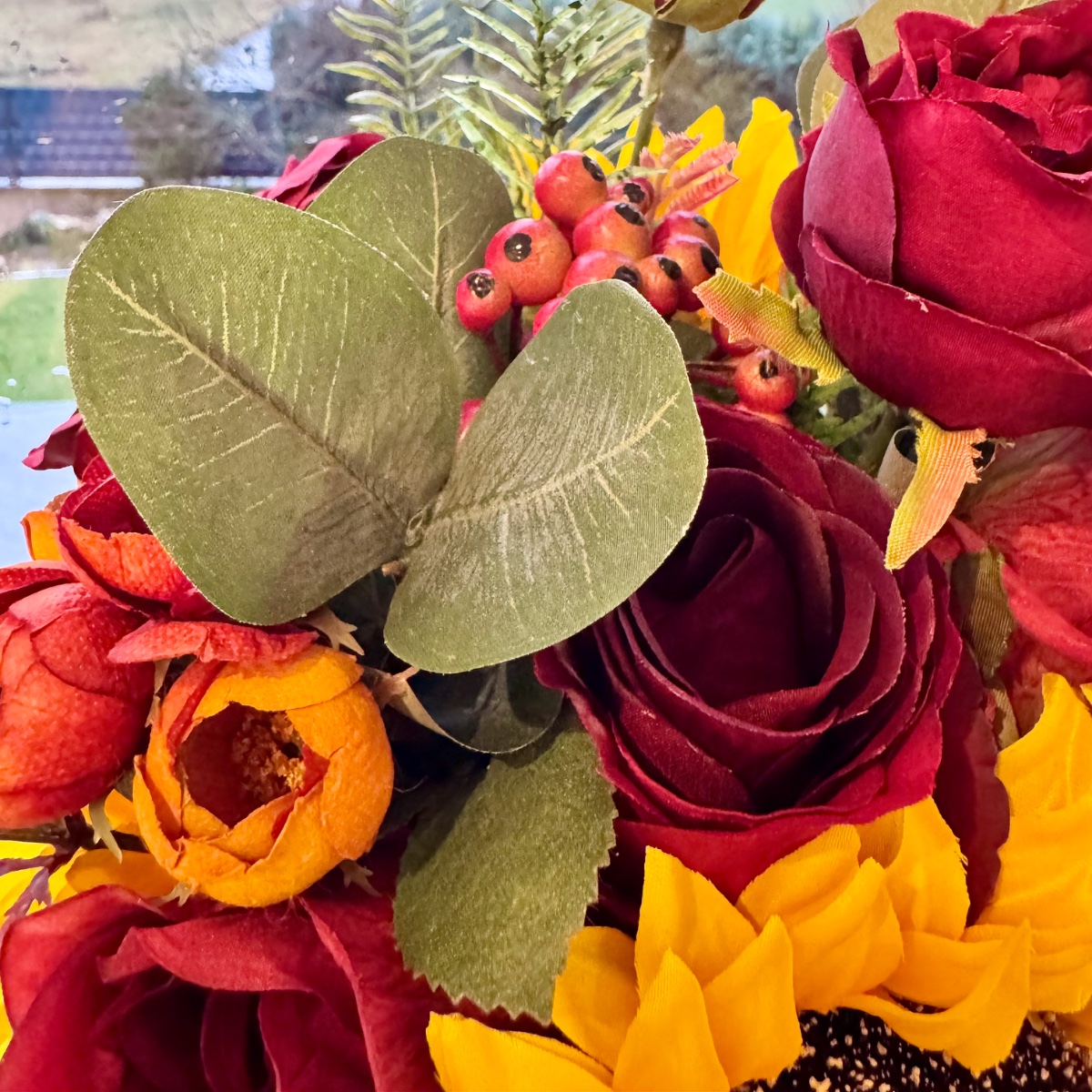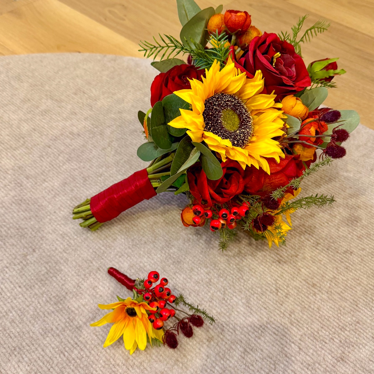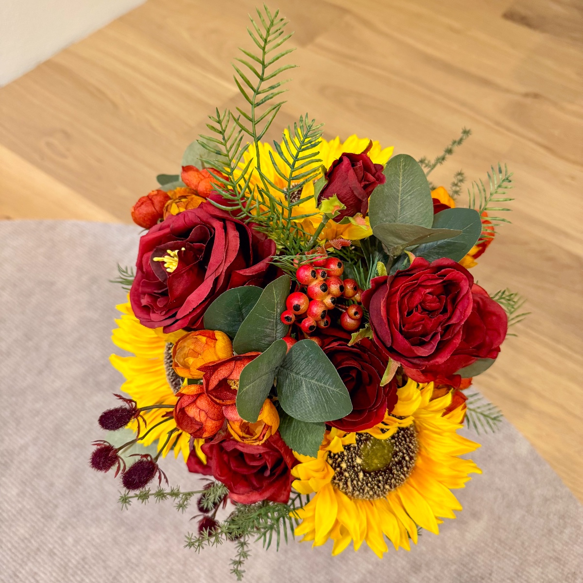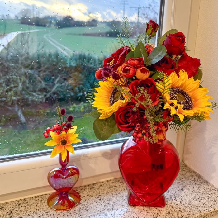 Une romance de fin d'été en rouge et jaune ! Un véritable fil rouge dans la décoration florale de mariage, avec des tournesols comme touches de couleur – nous étions ravis de répondre à ce souhait de notre cliente Svenja et nous nous sommes mis en quête de fleurs artificielles adaptées pour le bouquet de mariée, ainsi que d'une boutonnière pour le marié. Le résultat : un ensemble floral unique dans des tons bordeaux/orange vifs, avec différentes roses rouges, des branches de chardon et de baies. Les tournesols jaunes attirent tous les regards et s'harmonisent parfaitement avec les tons rouges et orangés qui rappellent la fin de l'été. Des branches d'eucalyptus, d'asperge et de poivrier entourent les fleurs intégrées, conférant au bouquet non seulement du relief, mais aussi un aspect naturel et réaliste. Shop the Look!