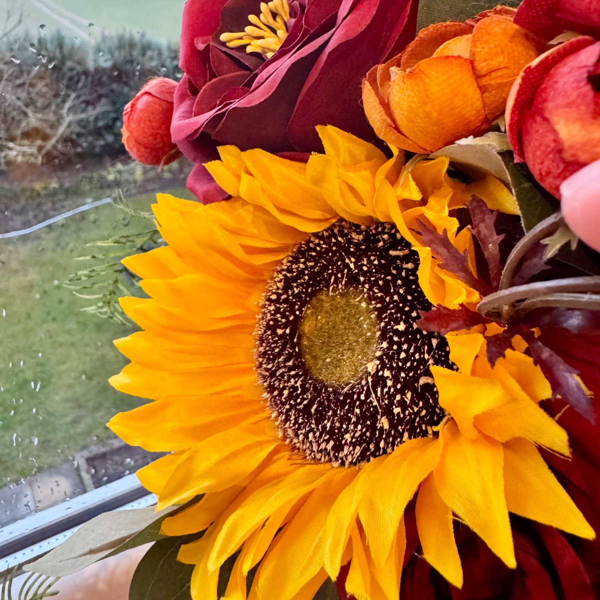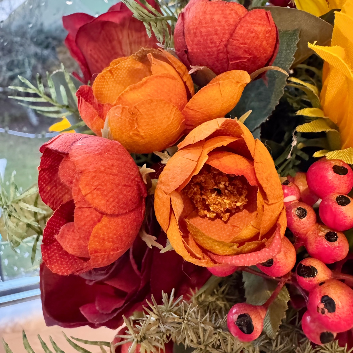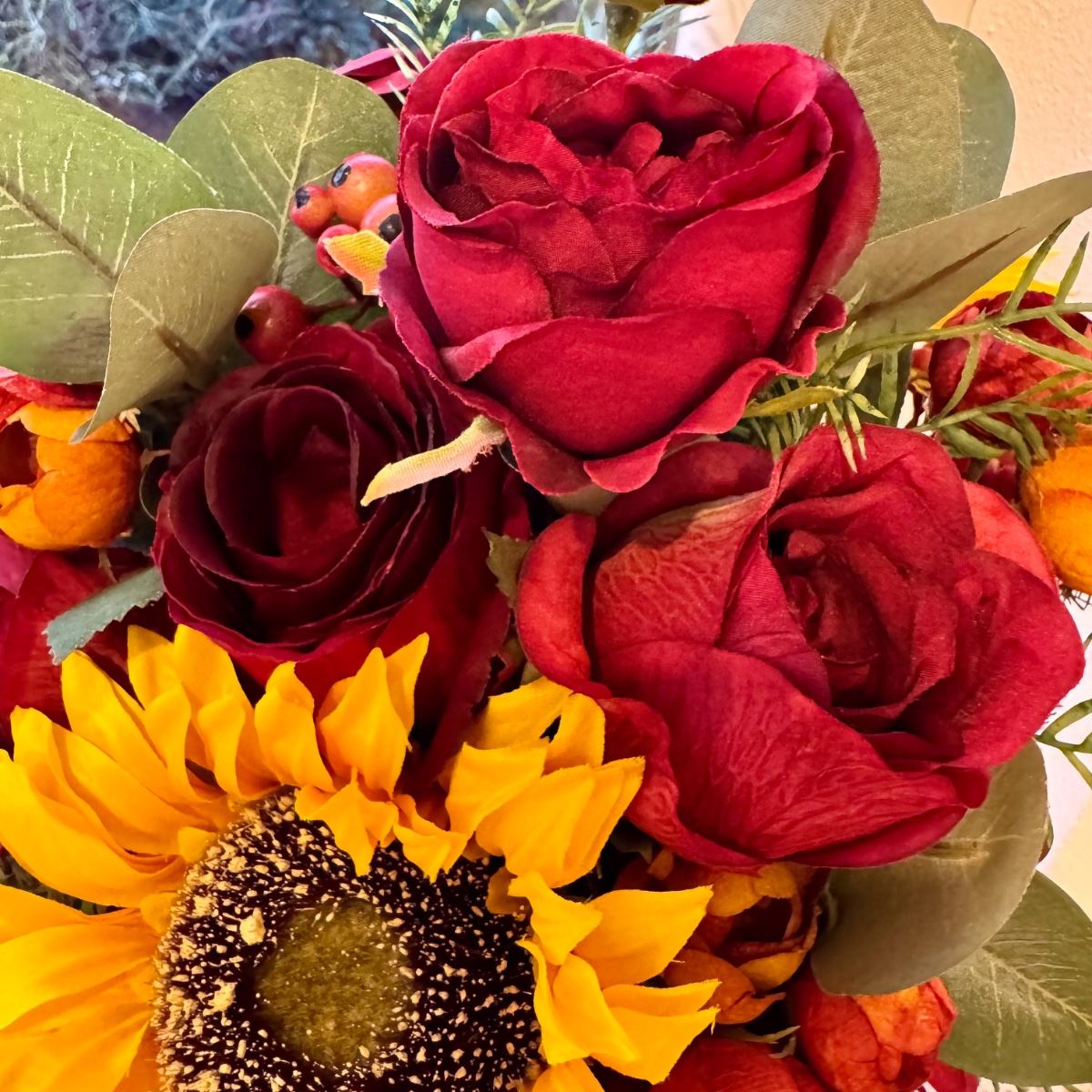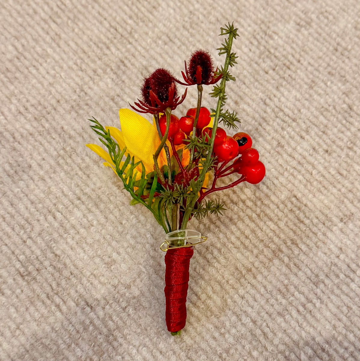 Une romance de fin d'été en rouge et jaune ! Un véritable fil rouge dans la décoration florale de mariage, avec des tournesols comme touches de couleur – nous étions ravis de répondre à ce souhait de notre cliente Svenja et nous nous sommes mis en quête de fleurs artificielles adaptées pour le bouquet de mariée, ainsi que d'une boutonnière pour le marié. Le résultat : un ensemble floral unique dans des tons bordeaux/orange vifs, avec différentes roses rouges, des branches de chardon et de baies. Les tournesols jaunes attirent tous les regards et s'harmonisent parfaitement avec les tons rouges et orangés qui rappellent la fin de l'été. Des branches d'eucalyptus, d'asperge et de poivrier entourent les fleurs intégrées, conférant au bouquet non seulement du relief, mais aussi un aspect naturel et réaliste. Shop the Look!