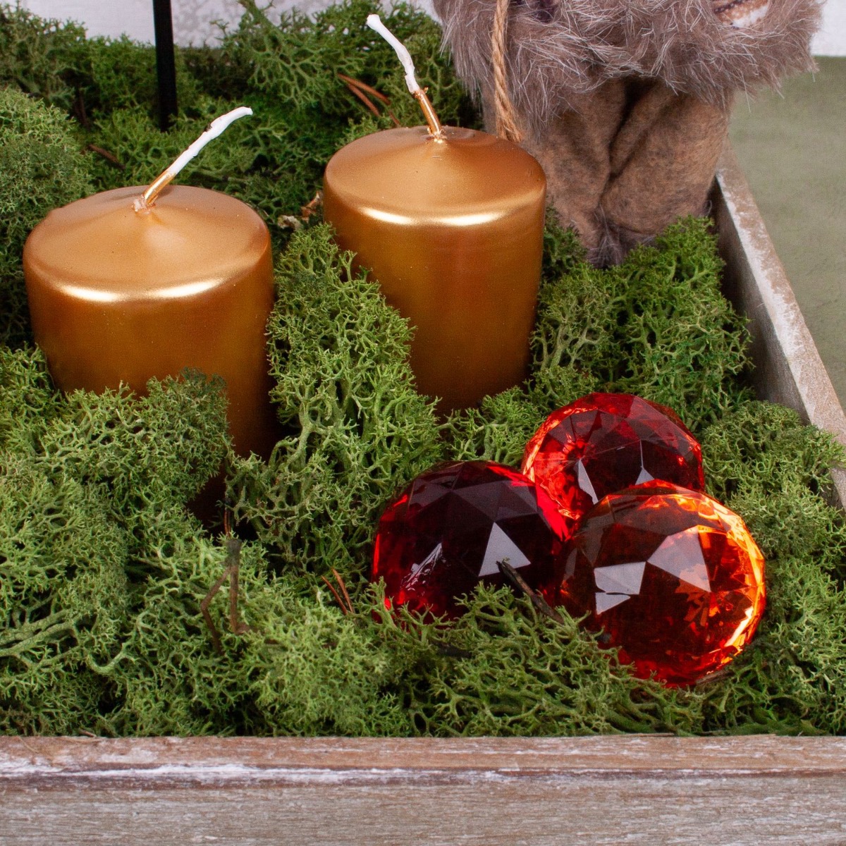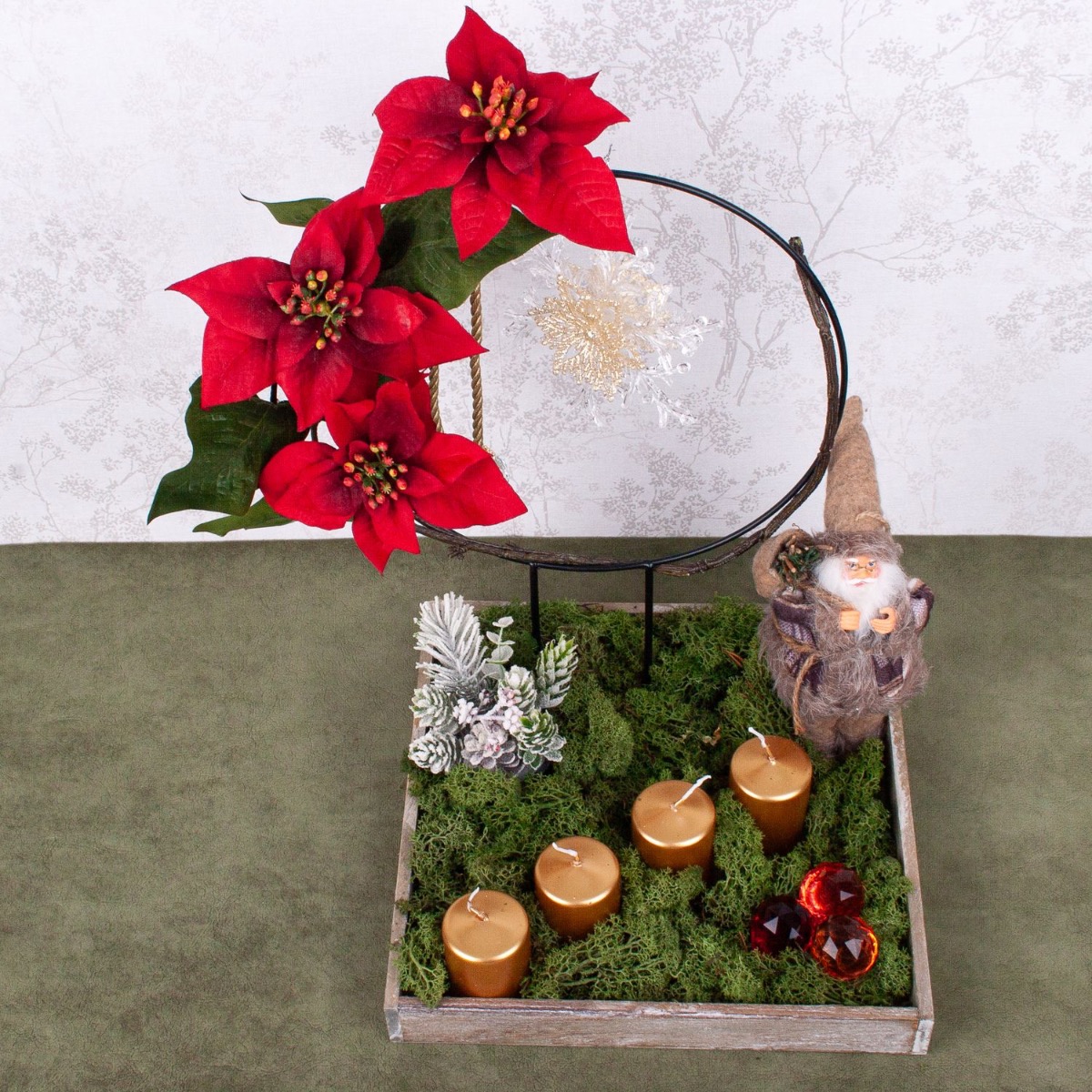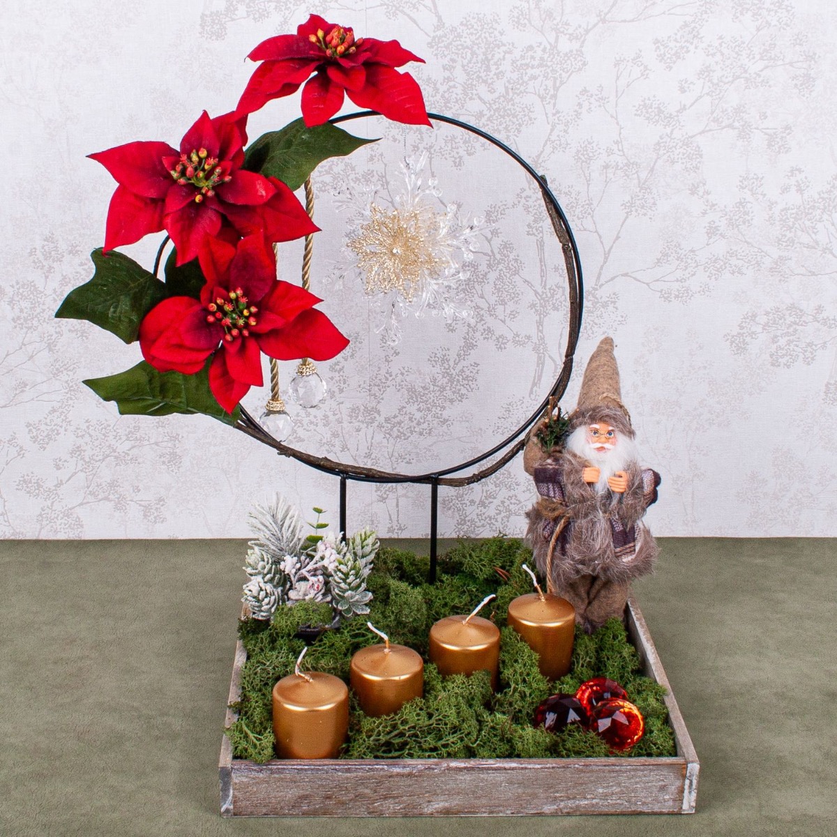 Conseil d'aménagement : Décorer d'abord l'anneau métallique avec le poinsettia et les décorations du sapin de Noël. Ensuite, placer dans le plateau en bois gris. Remplir ensuite le plateau de mousse naturelle et y placer tous les autres éléments. Ajouter encore les bougies et la couronne de l'Avent est terminée.