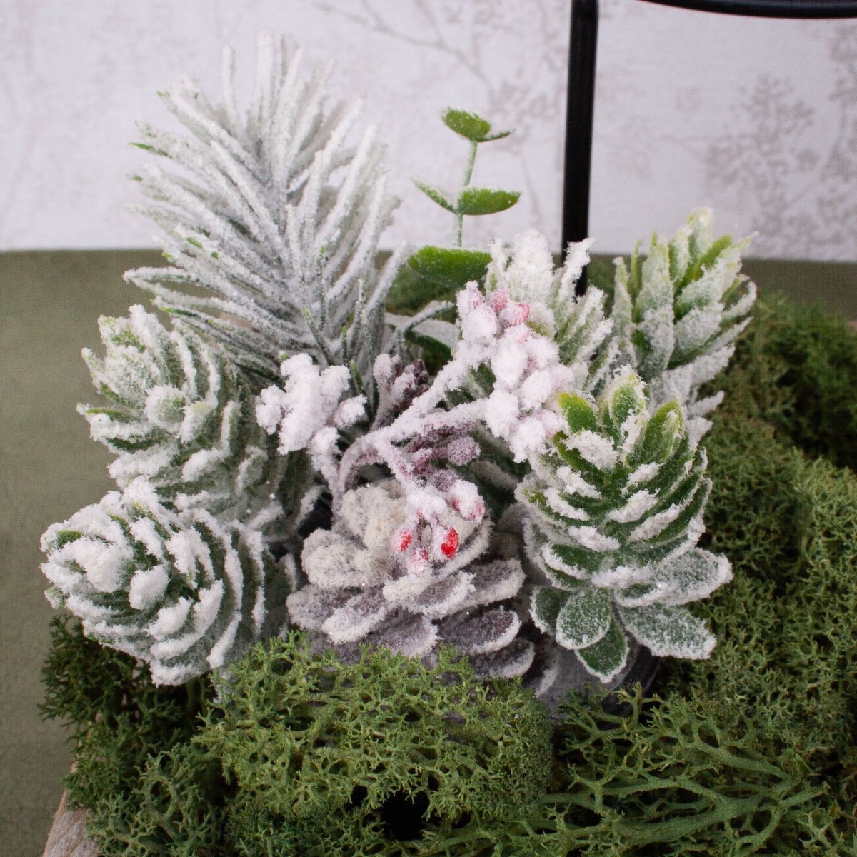 Le rouge, le vert et l'or ! Ces couleurs sont tout simplement synonymes de Noël et sont vraiment incontournables en cette période particulière. Notre extraordinaire couronne de l'Avent a été conçue avec un grand souci du détail. Un plateau rempli de mousse naturelle vert foncé donne l'impression d'un sol forestier. Le petit Père Noël s'y sent vraiment bien. Les diamants en verre acrylique et les bouquets de Noël enneigés servent de décoration et complètent parfaitement le look. L'anneau métallique avec un pied est idéal pour y fixer des éléments de décoration de Noël. Le poinsettia rouge vif et les décorations de Noël dorées sont tout simplement superbes et s'intègrent parfaitement dans cette décoration champêtre. Shop le look!