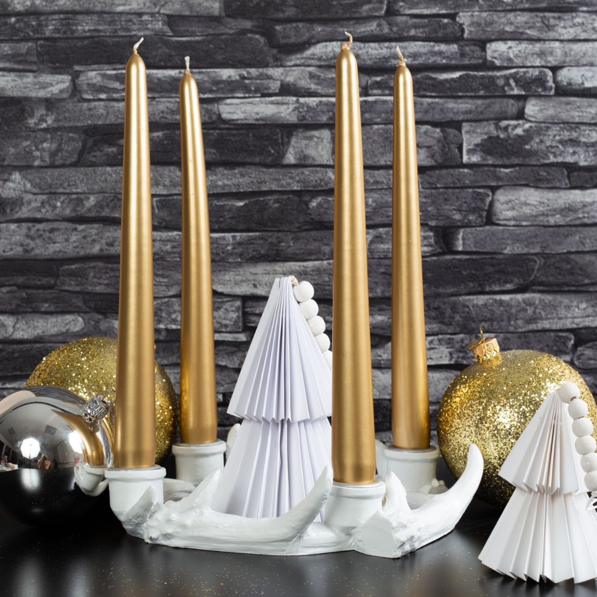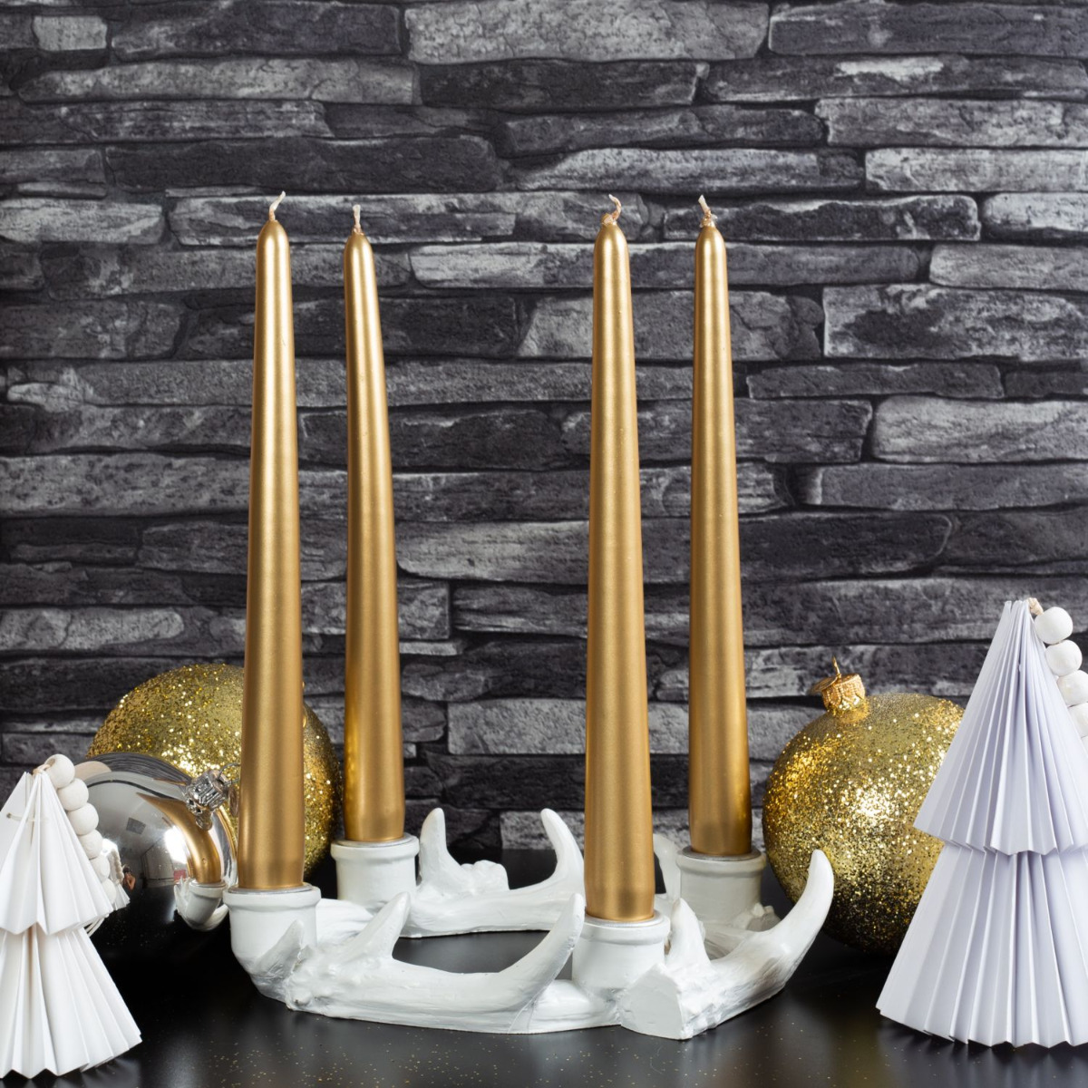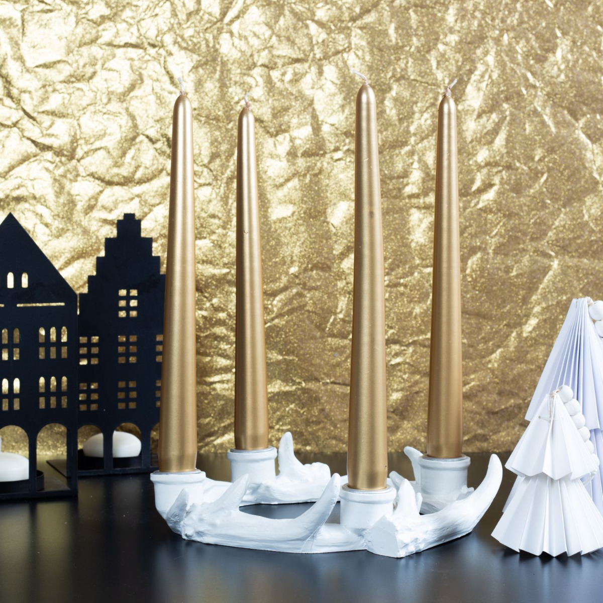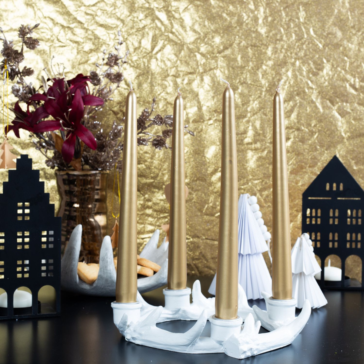 Une décoration brillante pour l'Avent ! Il n'est pas nécessaire d'opter systématiquement pour une couronne de l'Avent : les bougies chandelles associées aux boules argentées et dorées composent un ensemble élégant pour votre décoration de Noël. Le bouquet d'amaryllis rouges et de branches de pin dorées dans un pot apporte une belle touche de couleur en arrière-plan. Disposé de manière décontractée sur la table du salon ou le buffet, il attire tous les regards et s'accorde à merveille avec les sapins blancs et les bougies flottantes. Shop the Look !
