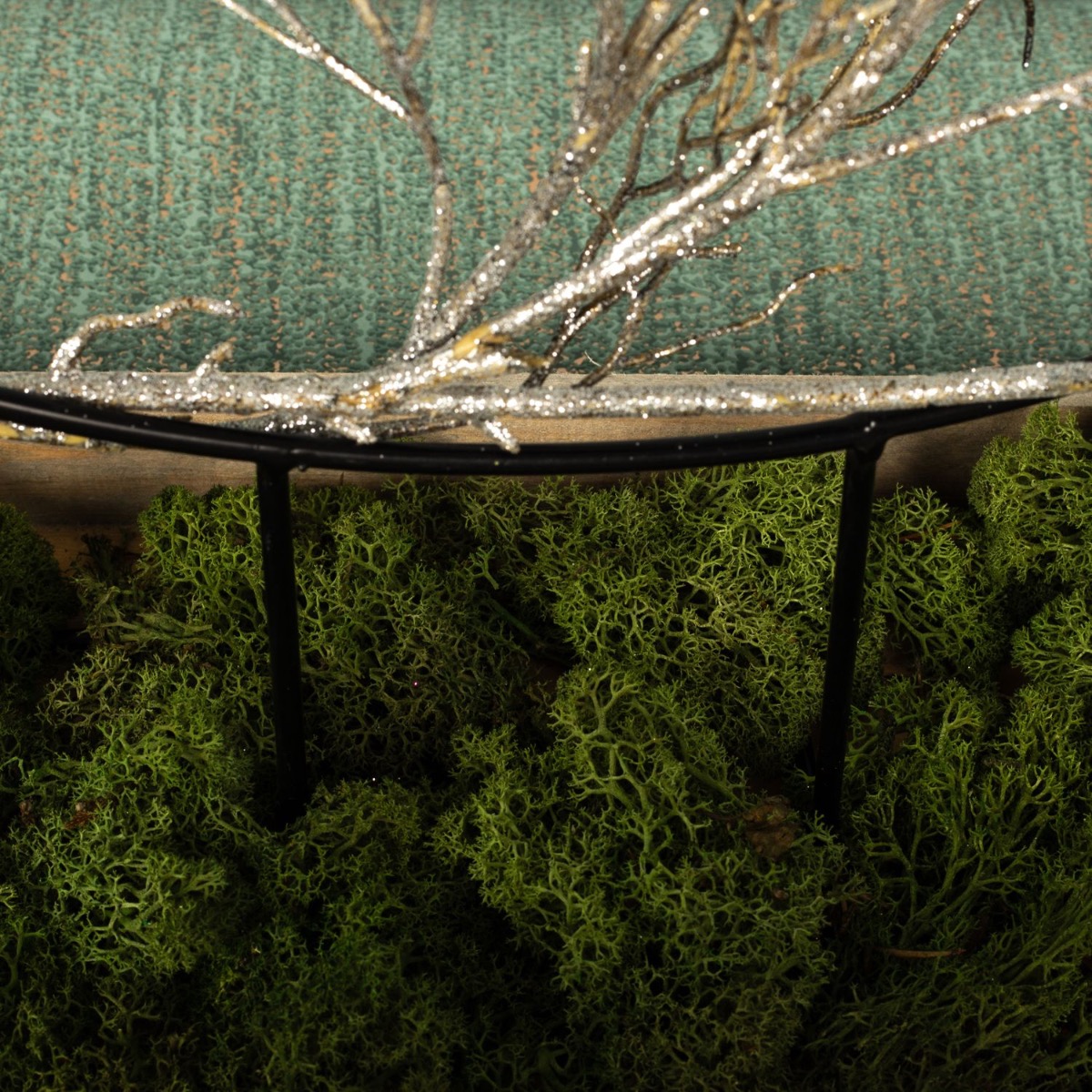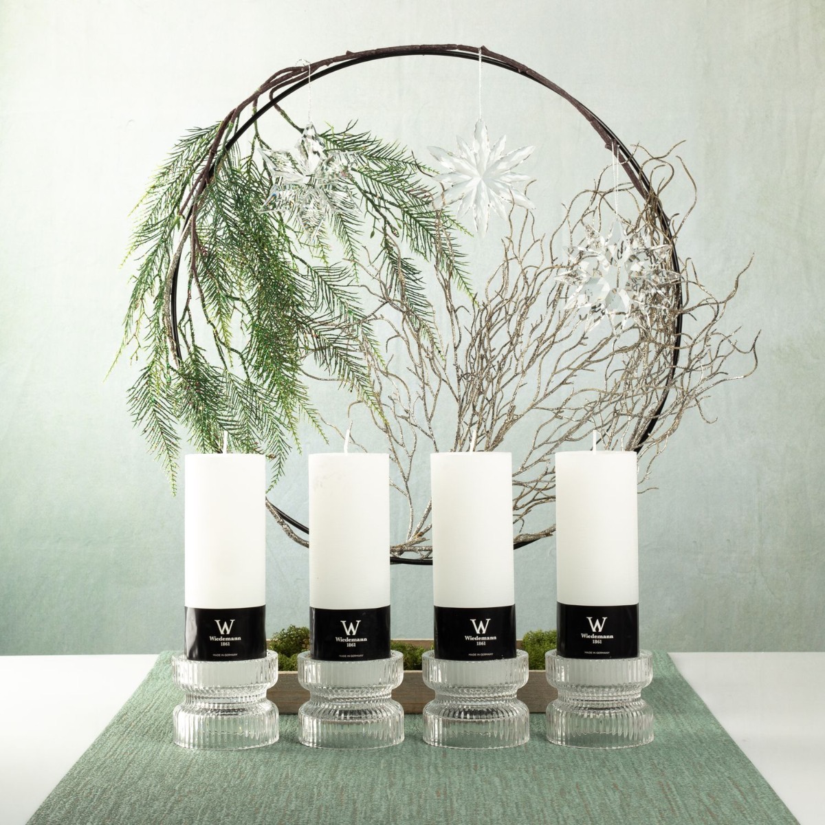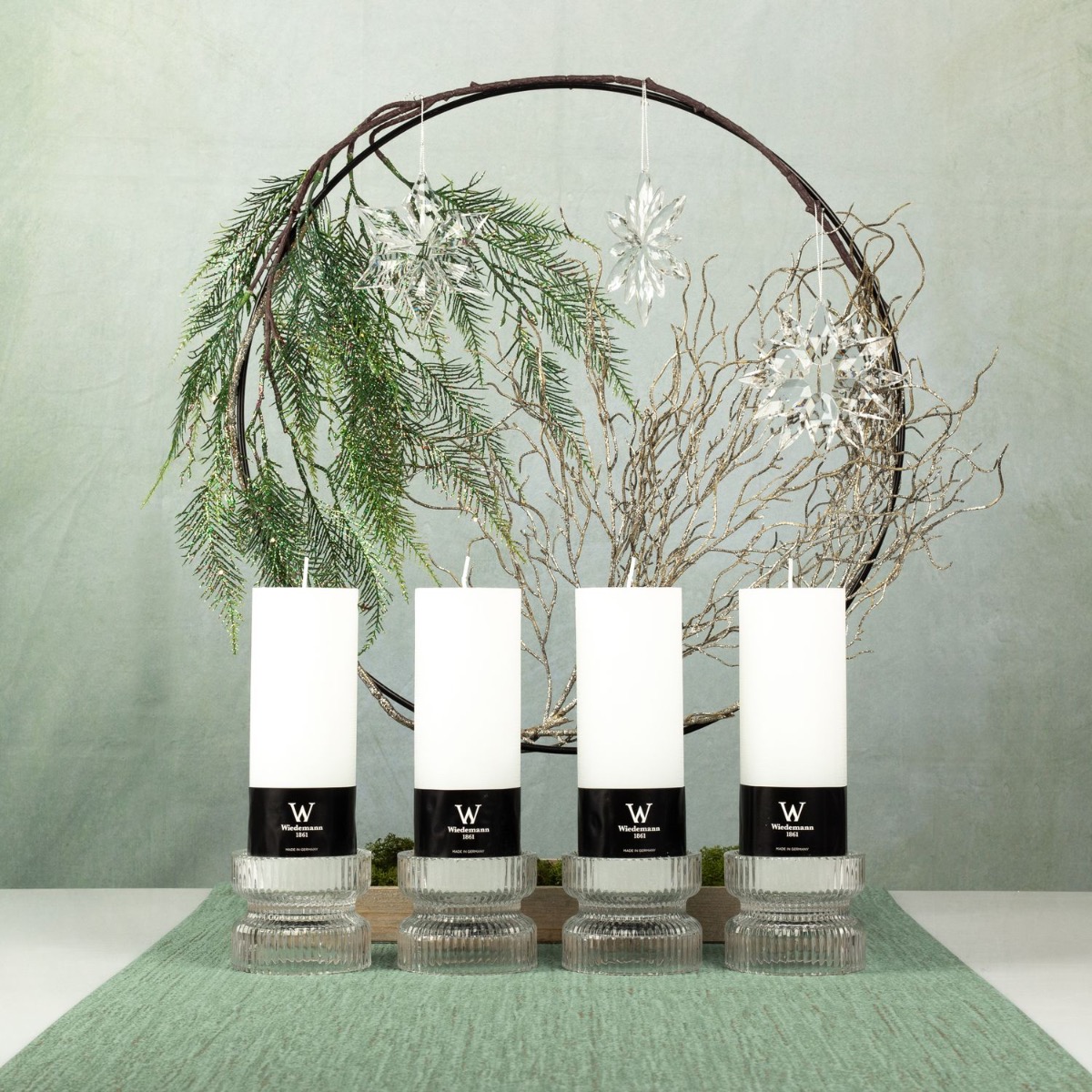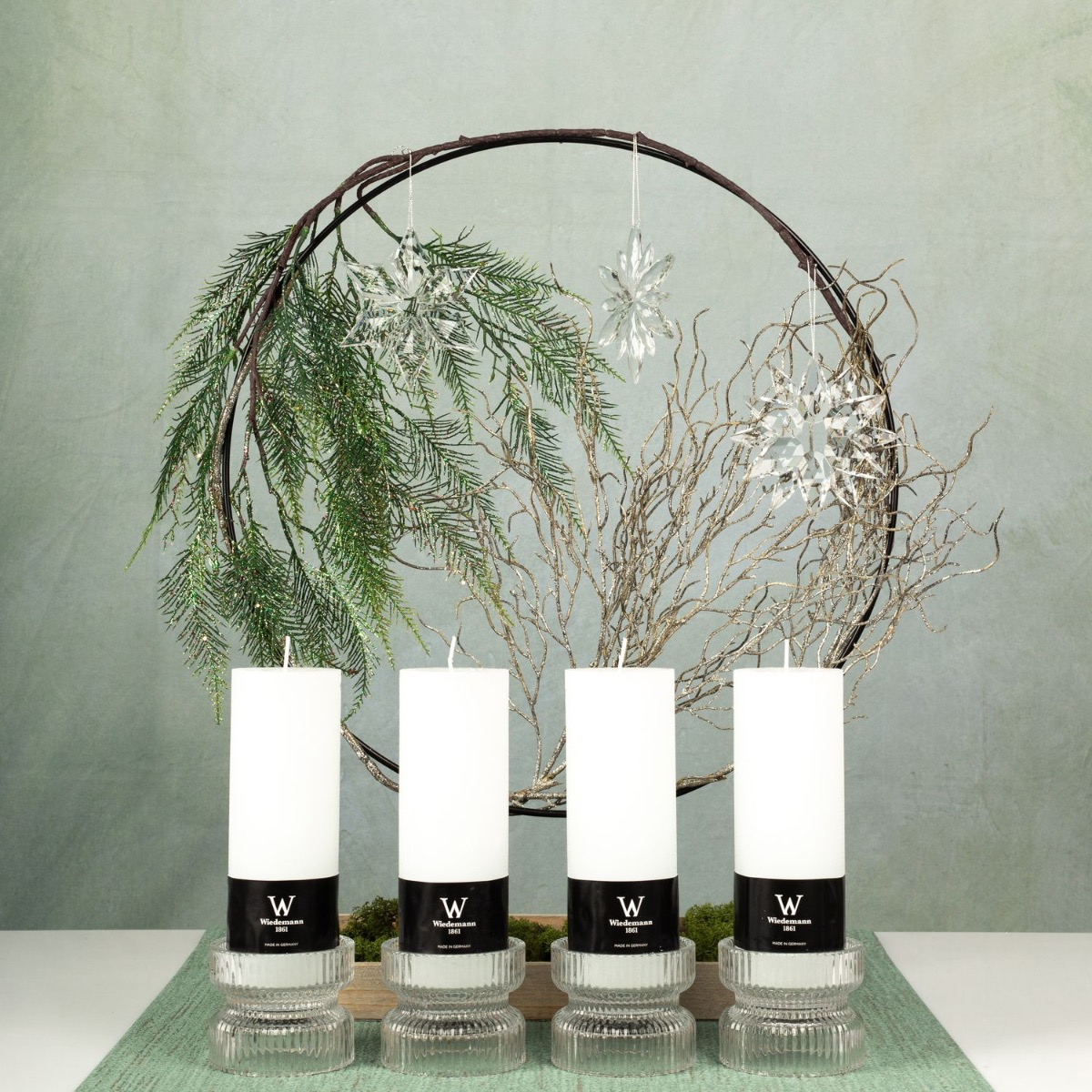 Argenté et scintillant ! Notre look de l'Avent est particulièrement raffiné et peut également être utilisé comme couronne de l'Avent grâce à ses 4 grandes bougies pilier. Une couronne de l'Avent classique est toujours conçue en forme d'anneau. La foi catholique décrit ainsi la résurrection et l'éternité de la vie. Notre anneau métallique n'a pas besoin d'être fixé pour être mis en place et convient également après la période de Noël pour de superbes idées de décoration. Il a été décoré de branches scintillantes et de suspensions de sapin de Noël. Le plateau en bois gris a été rempli de notre mousse naturelle verte, car le vert représente l'espoir et la vie. Ce look est un début exceptionnel pour la période de Noël. Shop the look!