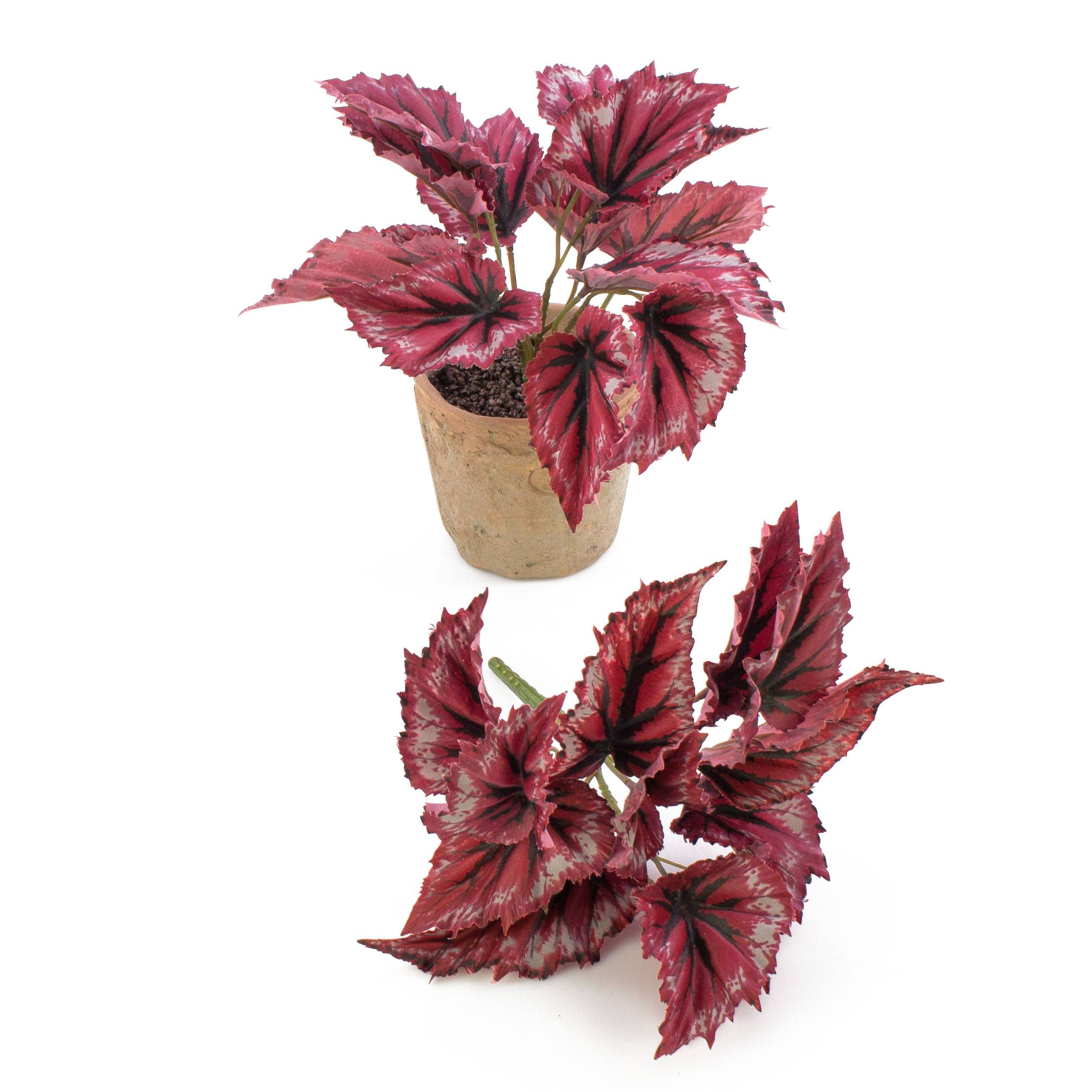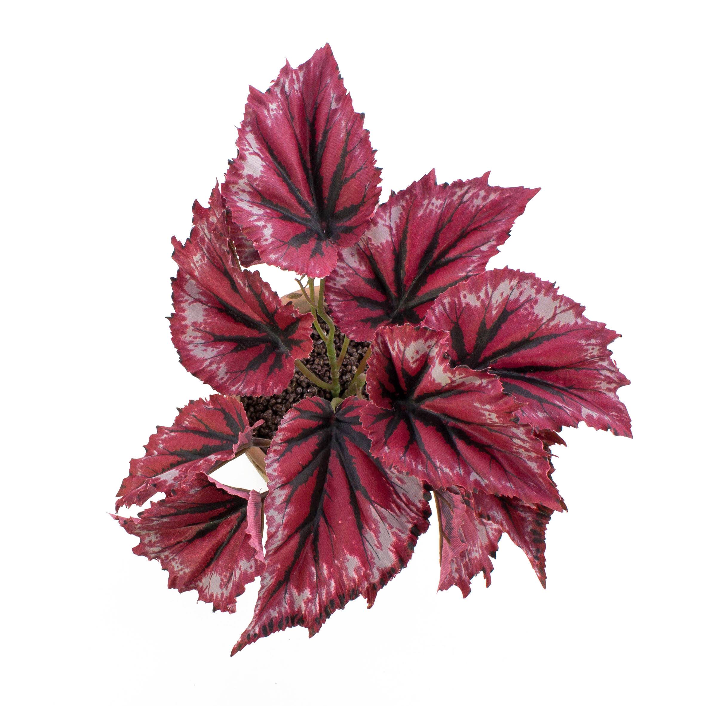 Ce faux bégonia BENITA est pourvu d'un beaux dessin des feuilles de couleur rouge clair et foncé et de taches argentées sur les bords des feuilles. Utilisez cette plante artificielle pour créer un accent de couleur dans le salon, la cuisine ou le couloir.