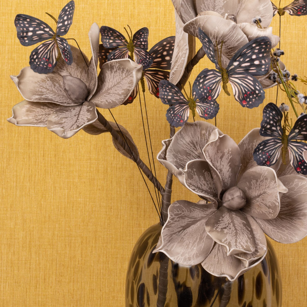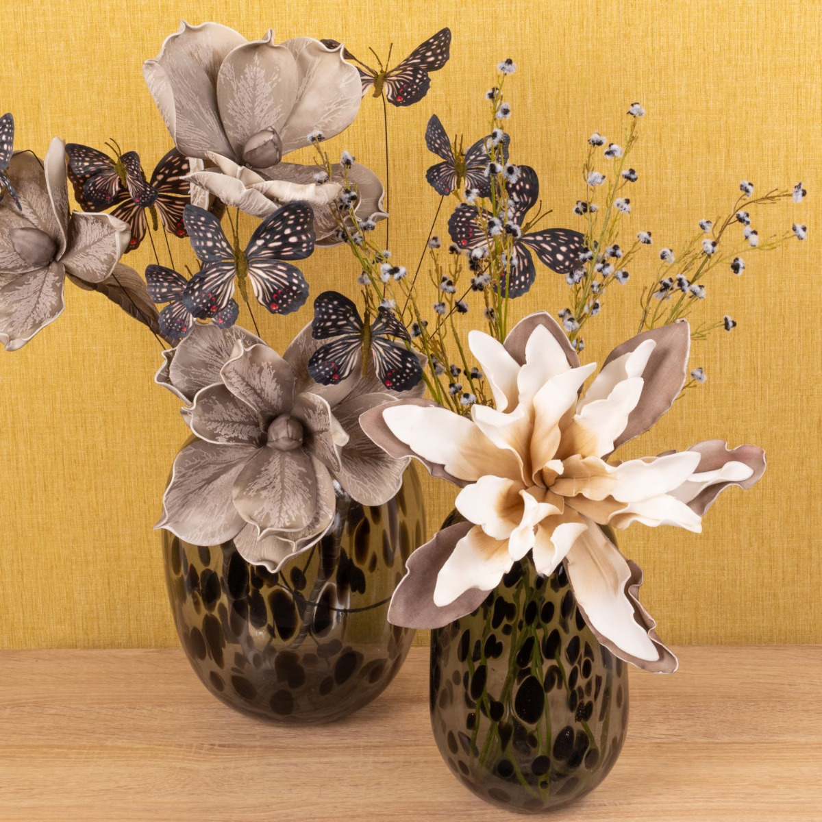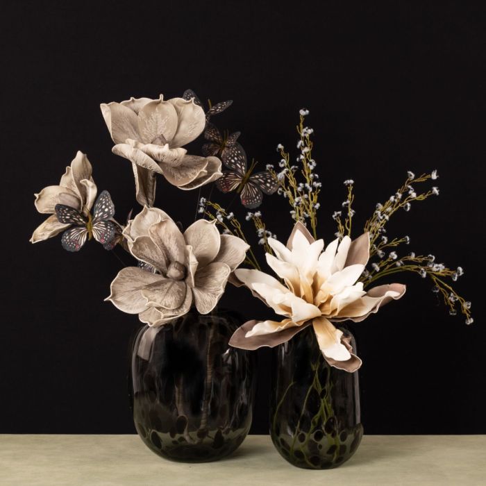 Romantisme et mélancolie! Cette ambiance hivernale est créée dans notre look insolite avec des fleurs artificielles qui semblent tout droit sorties d'un monde de rêve. De grandes fleurs, douces au toucher, génèrent une ambiance mélancolique avec des teintes chaudes de gris. Les papillons symbolisent les rêves et les souhaits qui volent dans nos cœurs et nous rappellent la saison chaude. Ce look est particulièrement tendance avec les vases au design léopard, qui attirent tous les regards dans chaque pièce à vivre. Vous aussi, rêvez avec cette belle composition de fleurs artificielles ! Shop the Look!