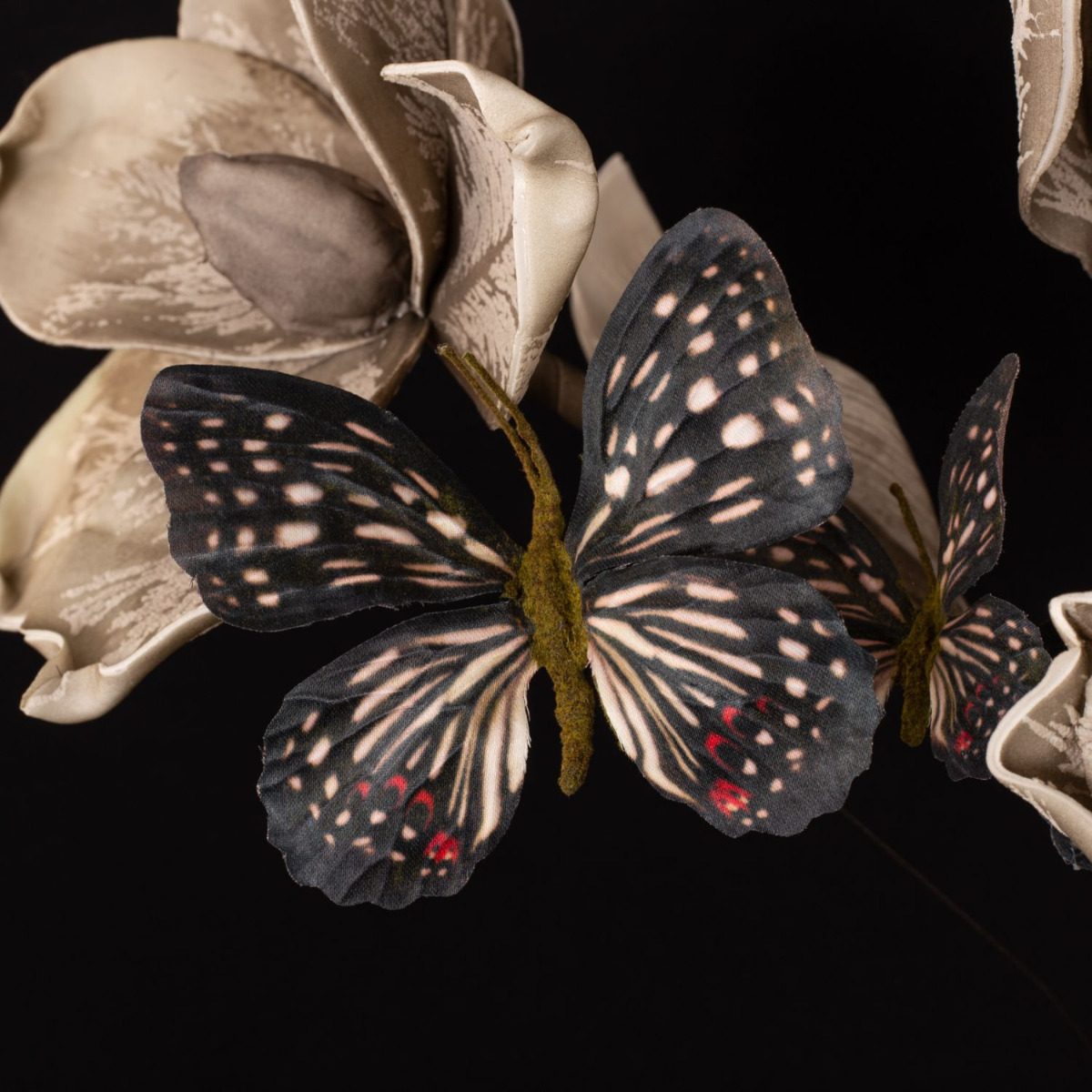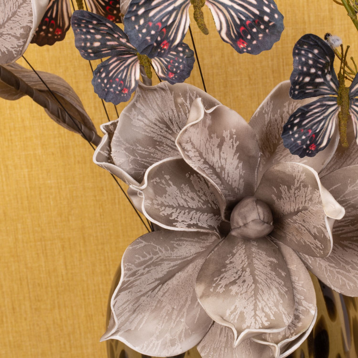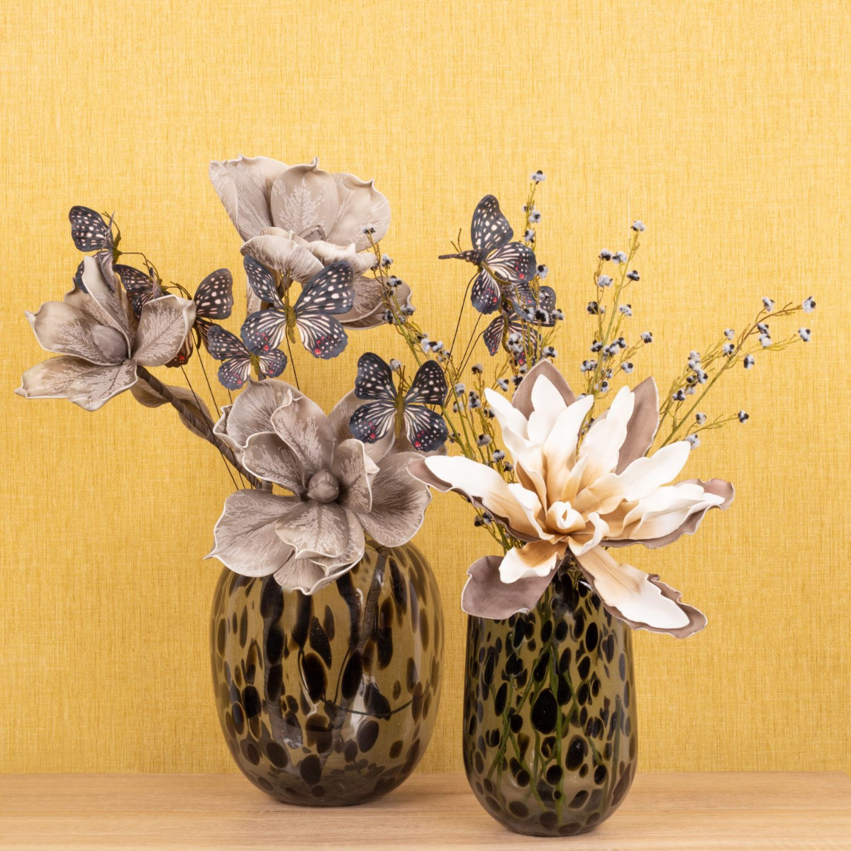 Romantisme et mélancolie! Cette ambiance hivernale est créée dans notre look insolite avec des fleurs artificielles qui semblent tout droit sorties d'un monde de rêve. De grandes fleurs, douces au toucher, génèrent une ambiance mélancolique avec des teintes chaudes de gris. Les papillons symbolisent les rêves et les souhaits qui volent dans nos cœurs et nous rappellent la saison chaude. Ce look est particulièrement tendance avec les vases au design léopard, qui attirent tous les regards dans chaque pièce à vivre. Vous aussi, rêvez avec cette belle composition de fleurs artificielles ! Shop the Look!
