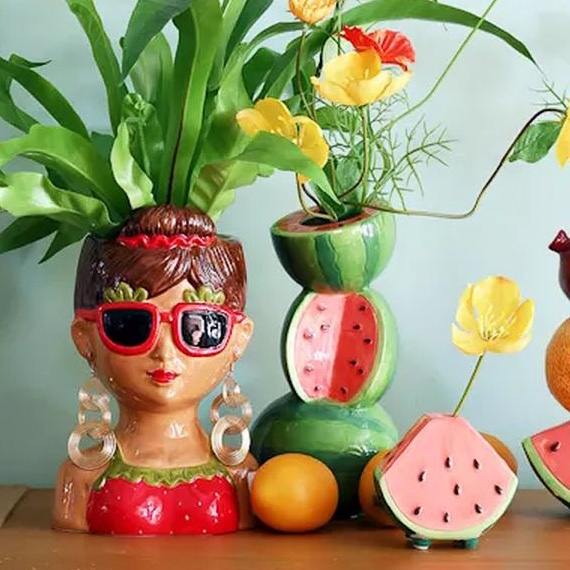 La douceur fruitée rencontre la gaieté colorée ! Les amateurs de fruits d'été seront comblés par ces vases « fruits espiègles ». Les vases de la série TILLAS en forme de pastèque, d'orange et de grenade sont déjà à eux seuls un véritable accroche-regard dans la décoration estivale. Mais cela devient encore plus coloré : avec des citrons décoratifs, des boutons d'or jaunes et des corbeilles d'or orange qui semblent sortir des vases à fruits. Et comme si cela ne suffisait pas, le vase en forme de buste de femme avec une fougère fixée à l'intérieur attire également tous les regards. Parfait pour apporter une touche de vacances dans votre intérieur si vous ne pouvez pas partir en voyage cet été. Shop the Look !