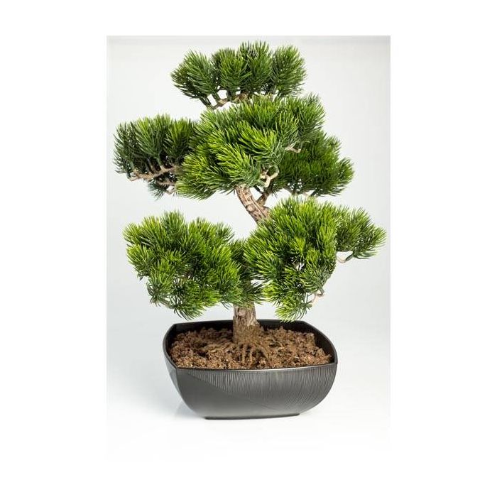 Bonsaï pin synthétique avec 210 épines dans une coupe en plastique noir. Le bonsaï décoratif a une hauteur d'environ 50 cm.