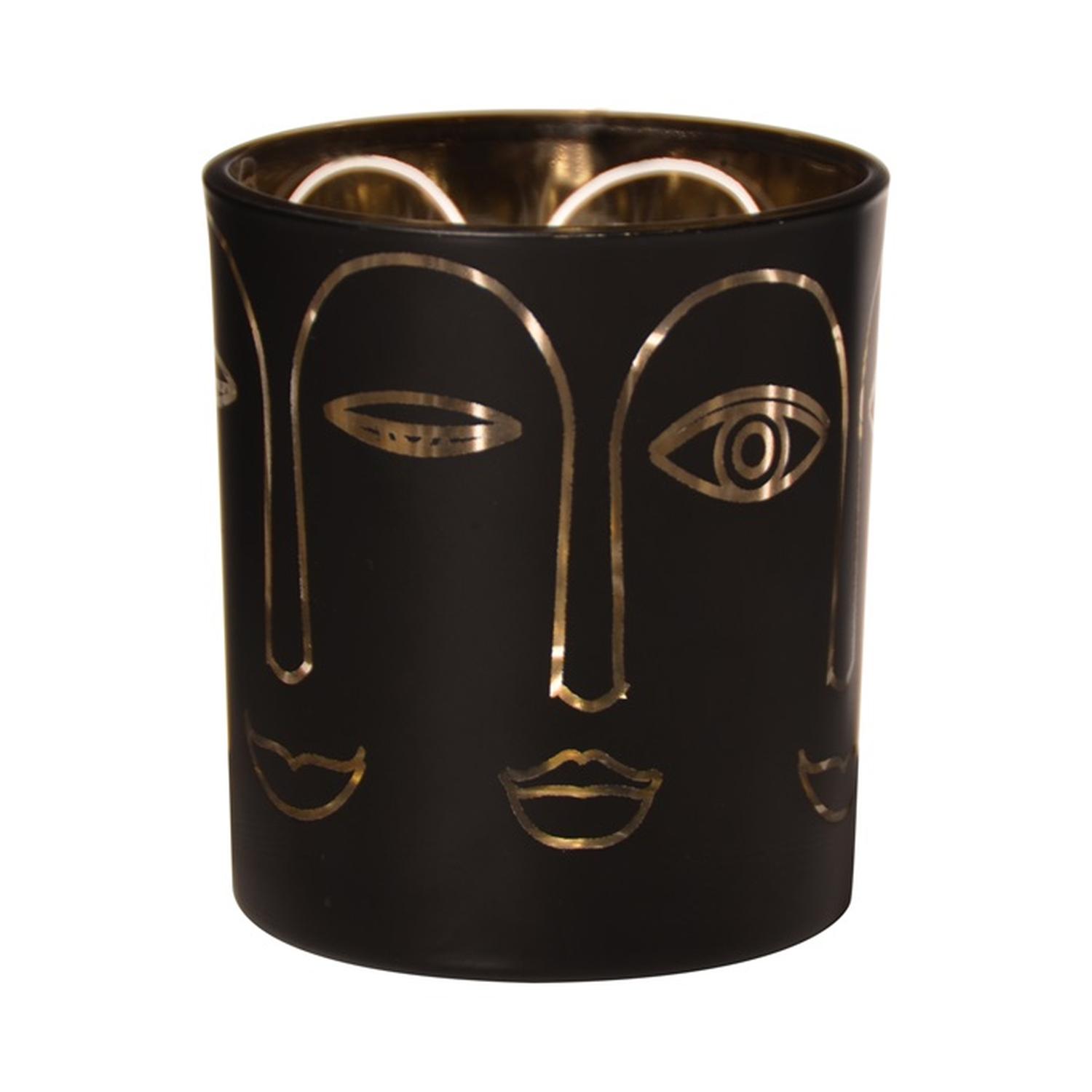 Bougeoir en verre LEOLINE avec visages, noir-or, 8cm, Ø7cm