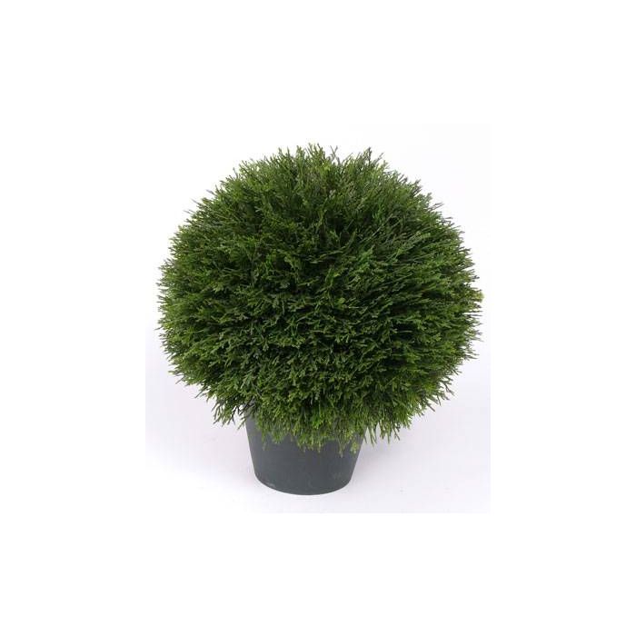 Boule de cyprès synthétique en pot mesurant environ 45 cm de haut et 40 cm de diamètre. L'arbuste décoratif est composé d'environ 510 feuilles.
