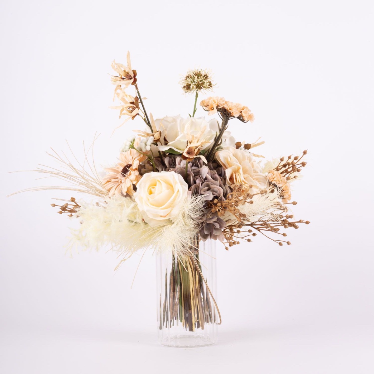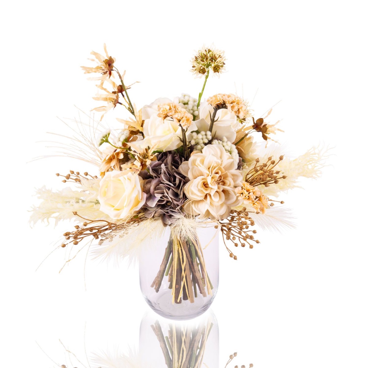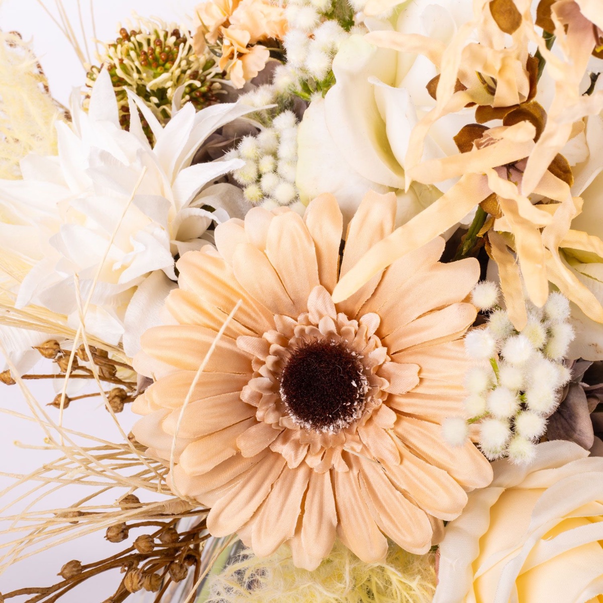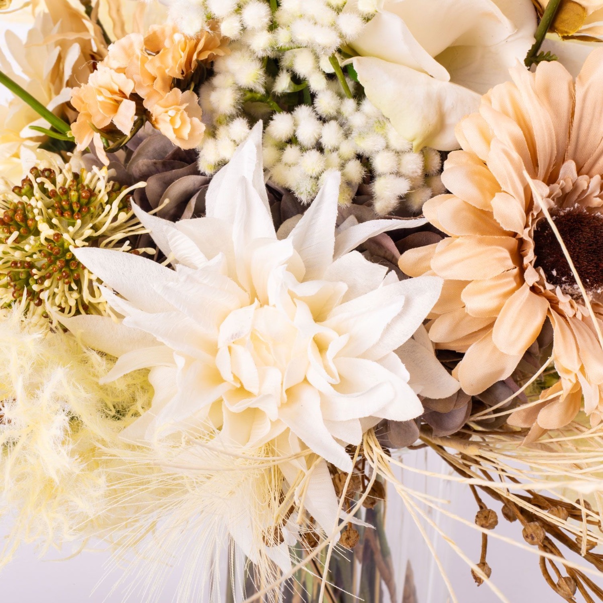 Le bouquet de fleurs artificielles RAWENNA rappelle visuellement un bouquet de fleurs séchées, presque un peu nostalgique. Toutefois, il n'est pas aussi fragile que les vraies fleurs séchées, un avantage évident pour les fleurs artificielles. Dans le bouquet, on retrouve des couleurs terreuses comme le beige et le crème pour donner l'impression d'une matière séchée. Ce bouquet est composé d'hortensias luxuriants, recouverts de roses, de gerberas et de dahlias, qui ne dépassent que légèrement. Les accessoires ajoutent du suspense et sortent audacieusement du bouquet, lui donnant ainsi de la hauteur. Enfin, un mélange de panicules, d'épis et d'herbes encadrent le bouquet.