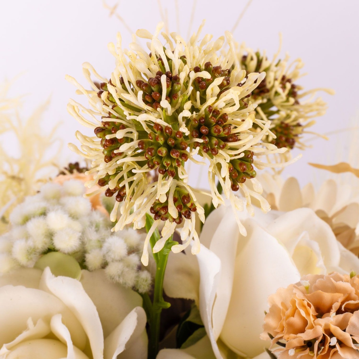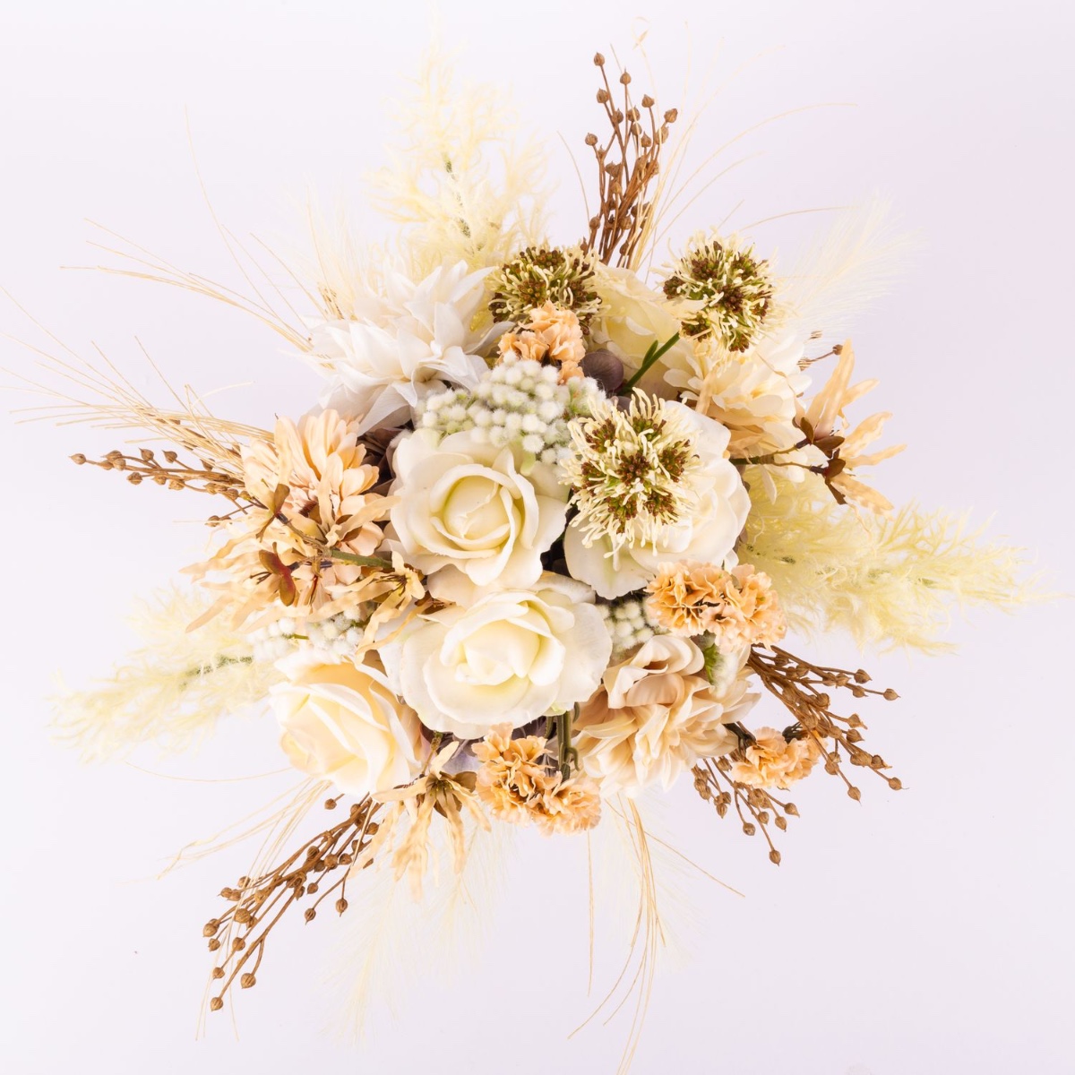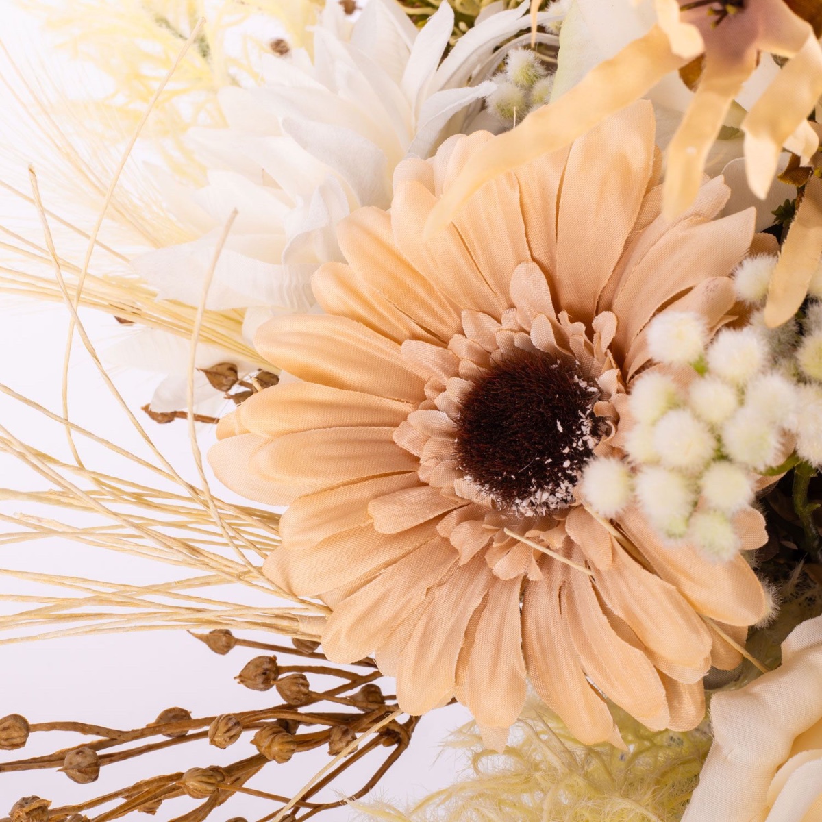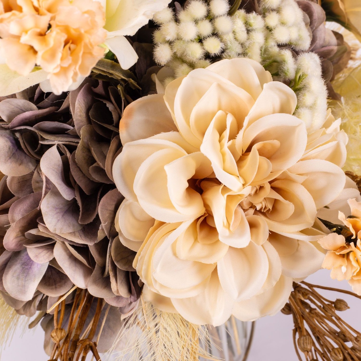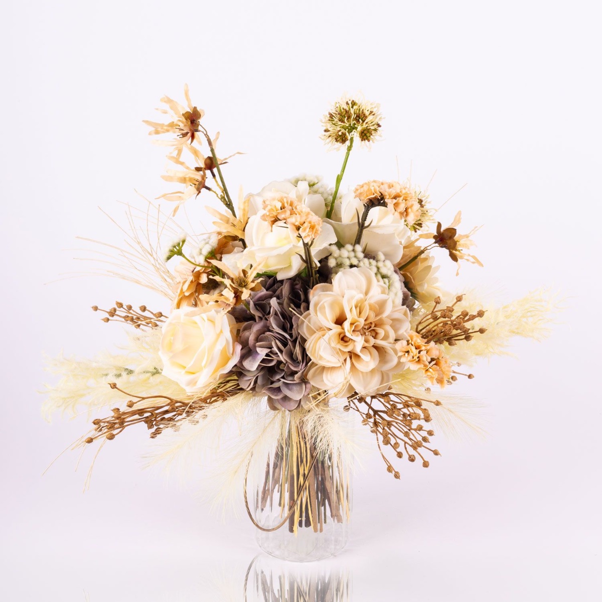 Le bouquet de fleurs artificielles RAWENNA rappelle visuellement un bouquet de fleurs séchées, presque un peu nostalgique. Toutefois, il n'est pas aussi fragile que les vraies fleurs séchées, un avantage évident pour les fleurs artificielles. Dans le bouquet, on retrouve des couleurs terreuses comme le beige et le crème pour donner l'impression d'une matière séchée. Ce bouquet est composé d'hortensias luxuriants, recouverts de roses, de gerberas et de dahlias, qui ne dépassent que légèrement. Les accessoires ajoutent du suspense et sortent audacieusement du bouquet, lui donnant ainsi de la hauteur. Enfin, un mélange de panicules, d'épis et d'herbes encadrent le bouquet.