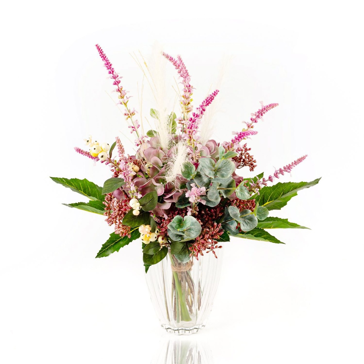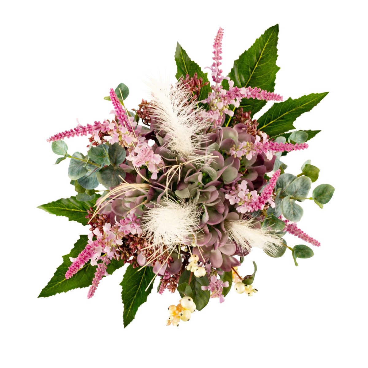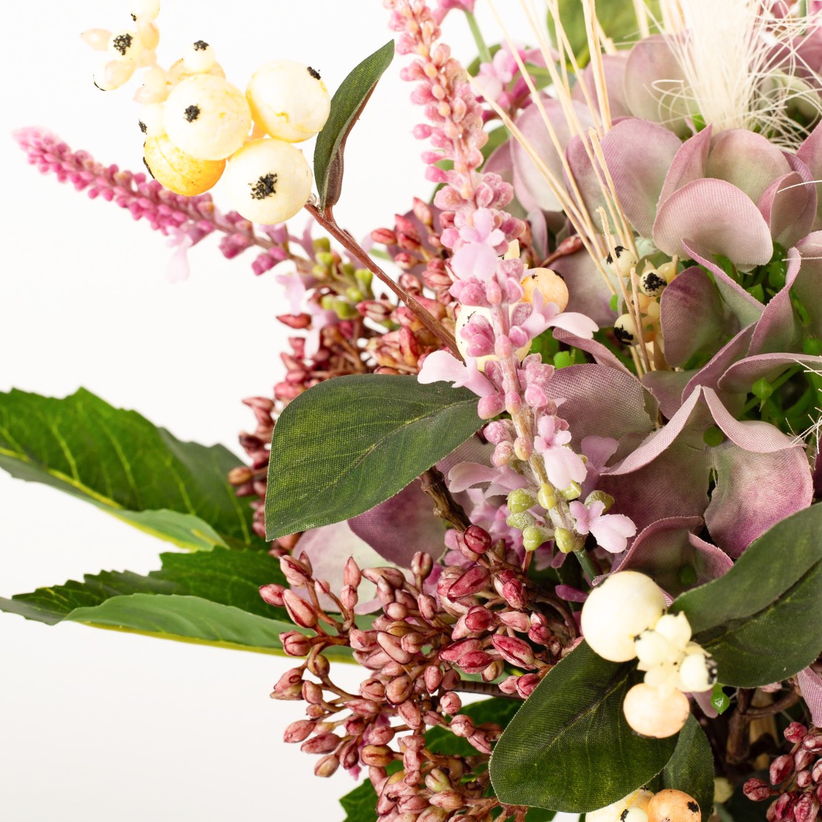 - Arrangement floral artificiel lié à la main, composé d'hortensia, viorne, bruyère, symphorine, eucalyptus, pennisetum et aralia de couleur violet-rose-vert