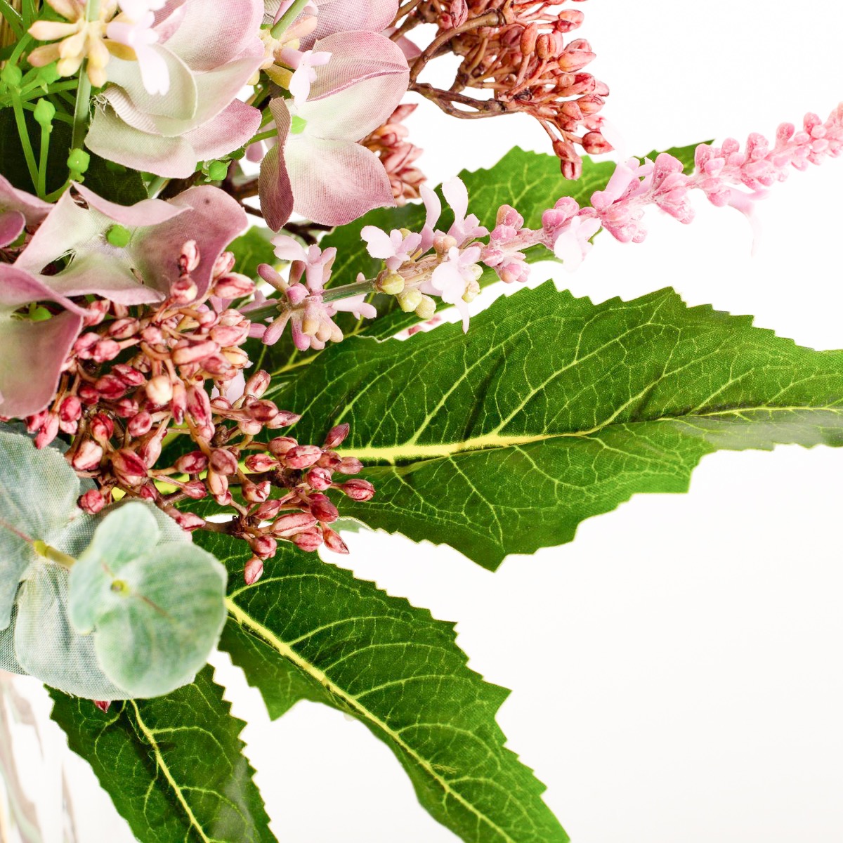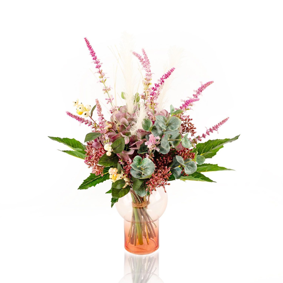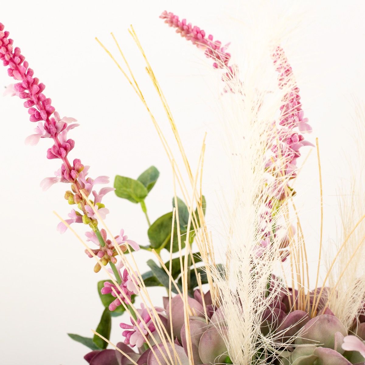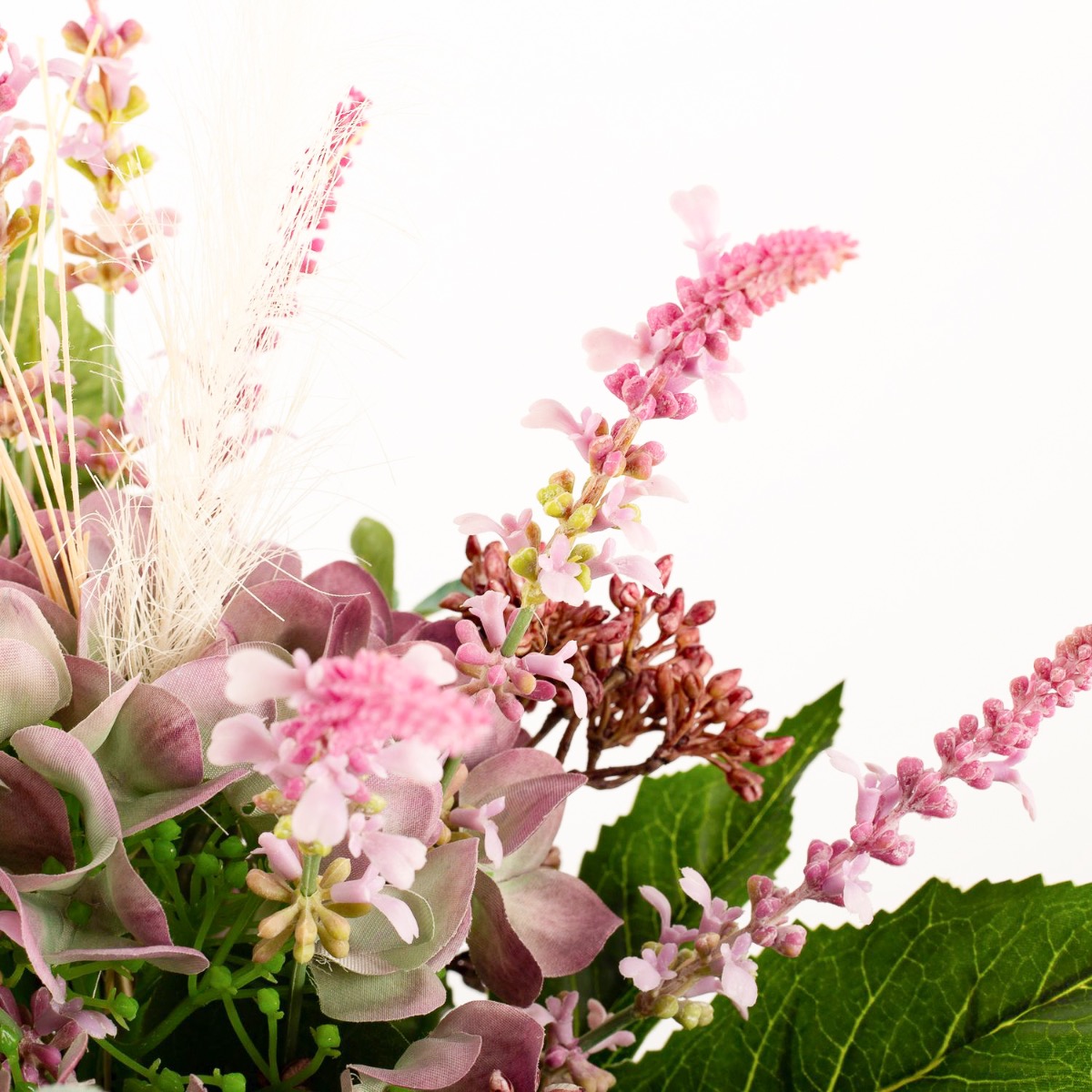 - Arrangement floral artificiel lié à la main, composé d'hortensia, viorne, bruyère, symphorine, eucalyptus, pennisetum et aralia de couleur violet-rose-vert