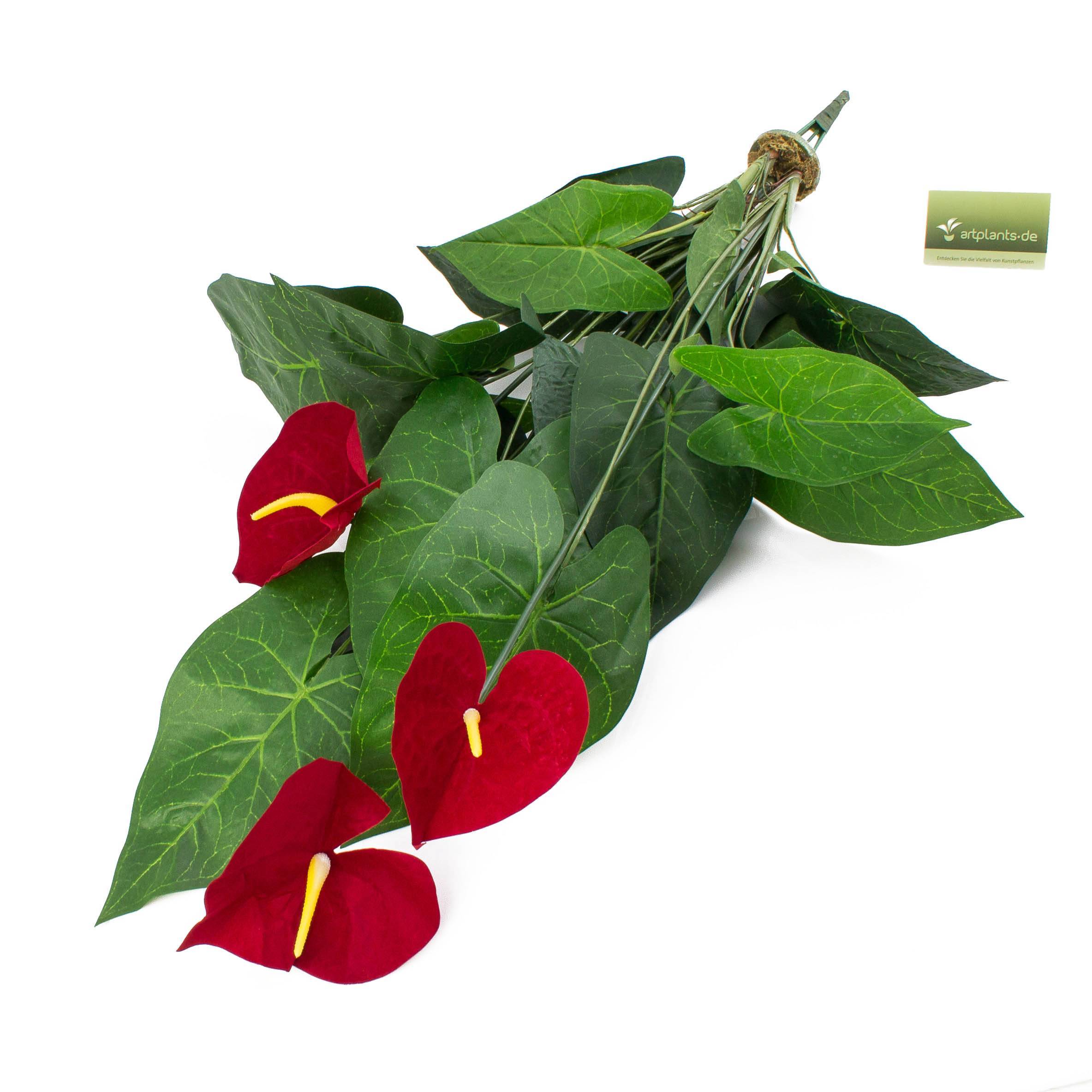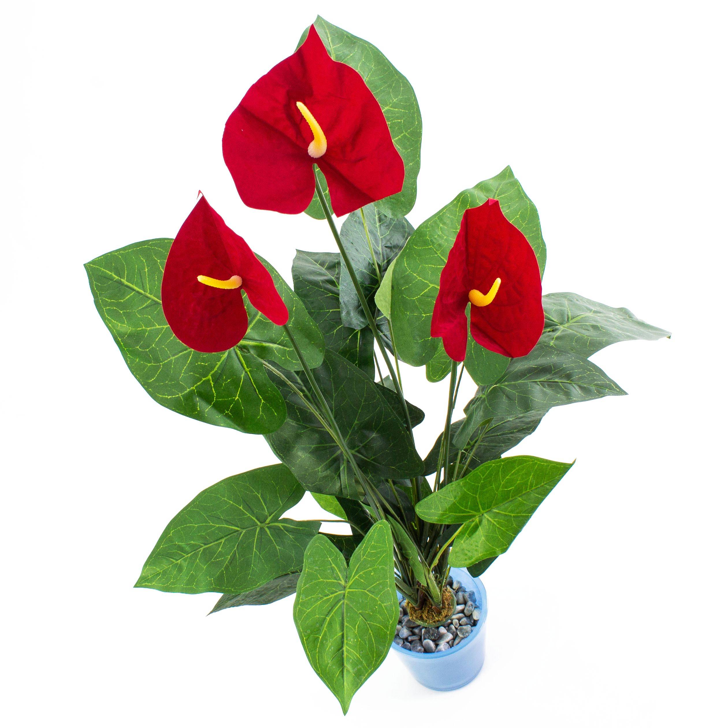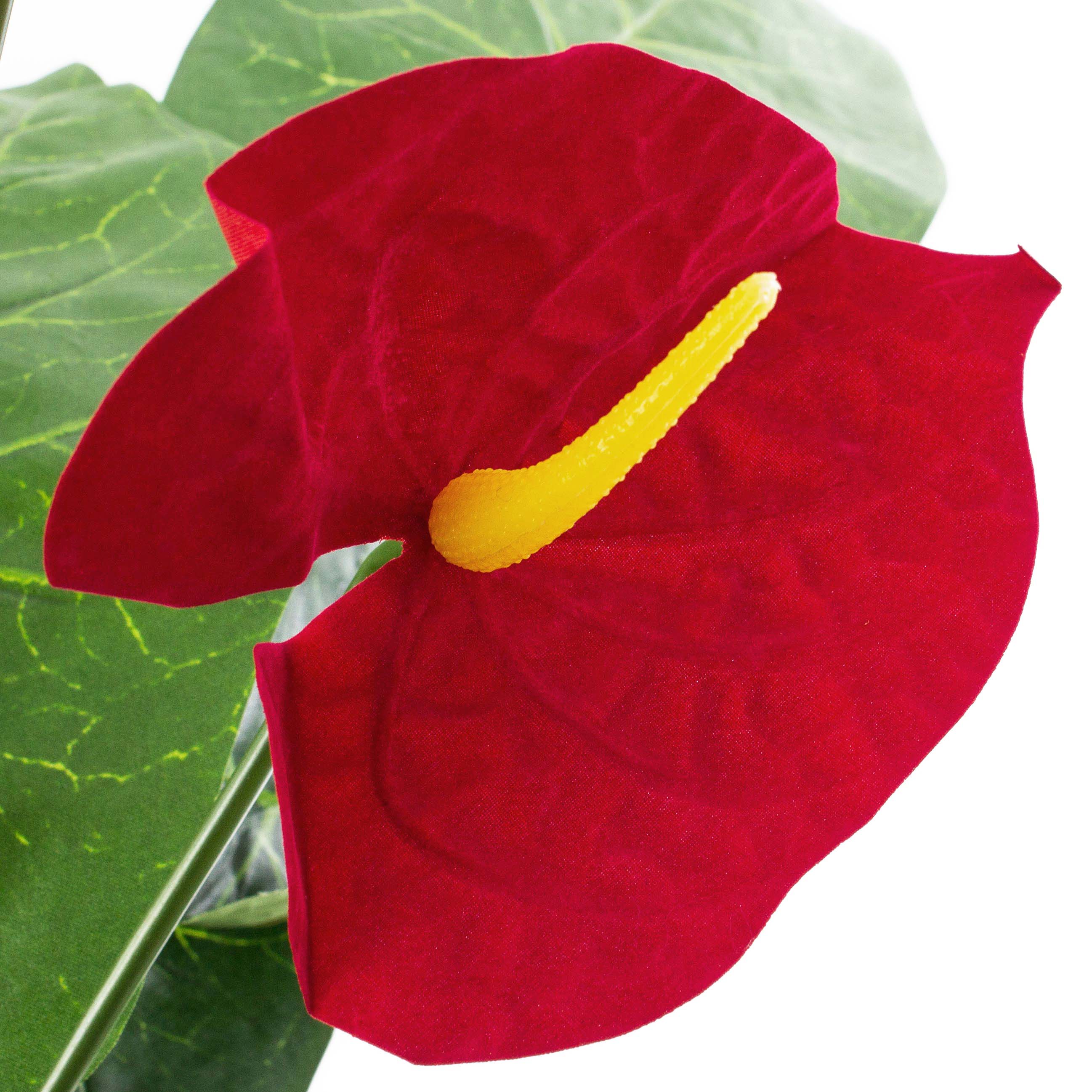 Plante artificielle plus vraie que nature composée de 3 fleurs rouges et environ 25 feuilles vertes. Cet Anthurium artificiel mesure au total environ 80 cm de haut.