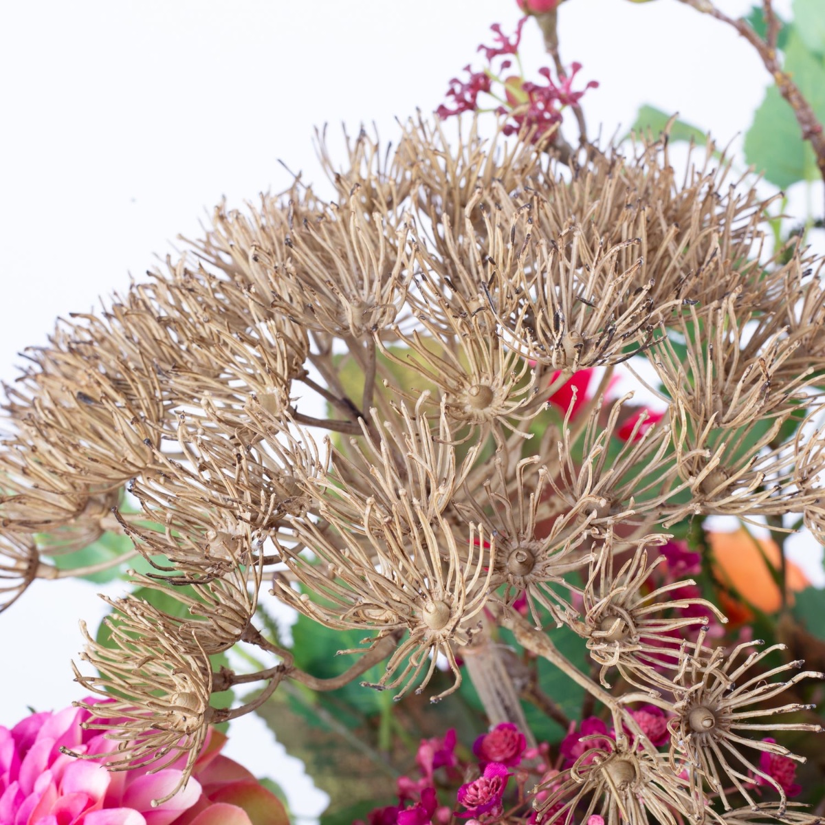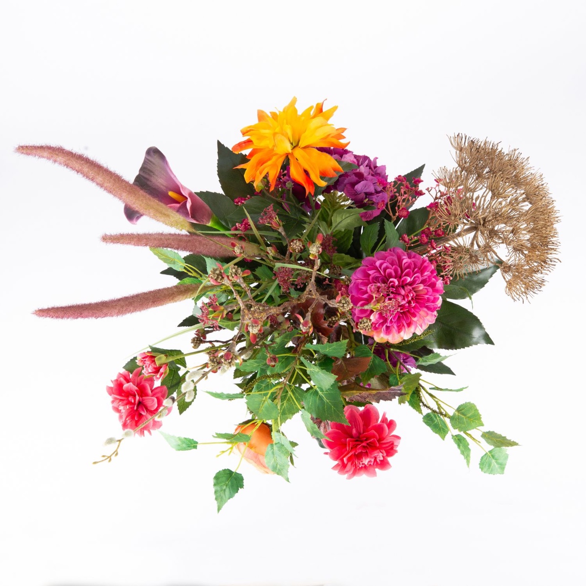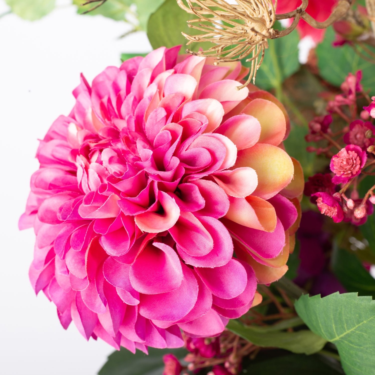 - Bouquet artificiel REJNA composé des produits suivants ou au moins équivalents : dahlia pompon frappant, fleur de berce géante, calla imposant, hortensia luxuriant, dahlias brillants, rose-chou classique, gypsophile délicat, chaton de saule et pennisetum délicats, érable fleuri, feuilles de vigne colorées, branche de bouleau à longue tige ainsi qu'une grande feuille d'aralia comme accessoire