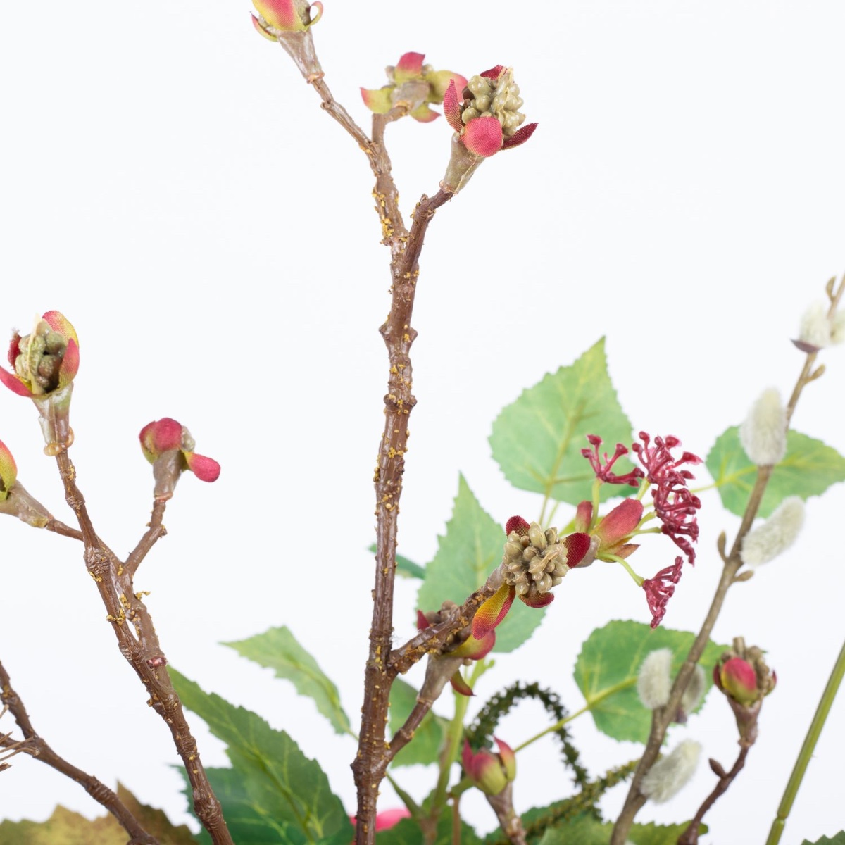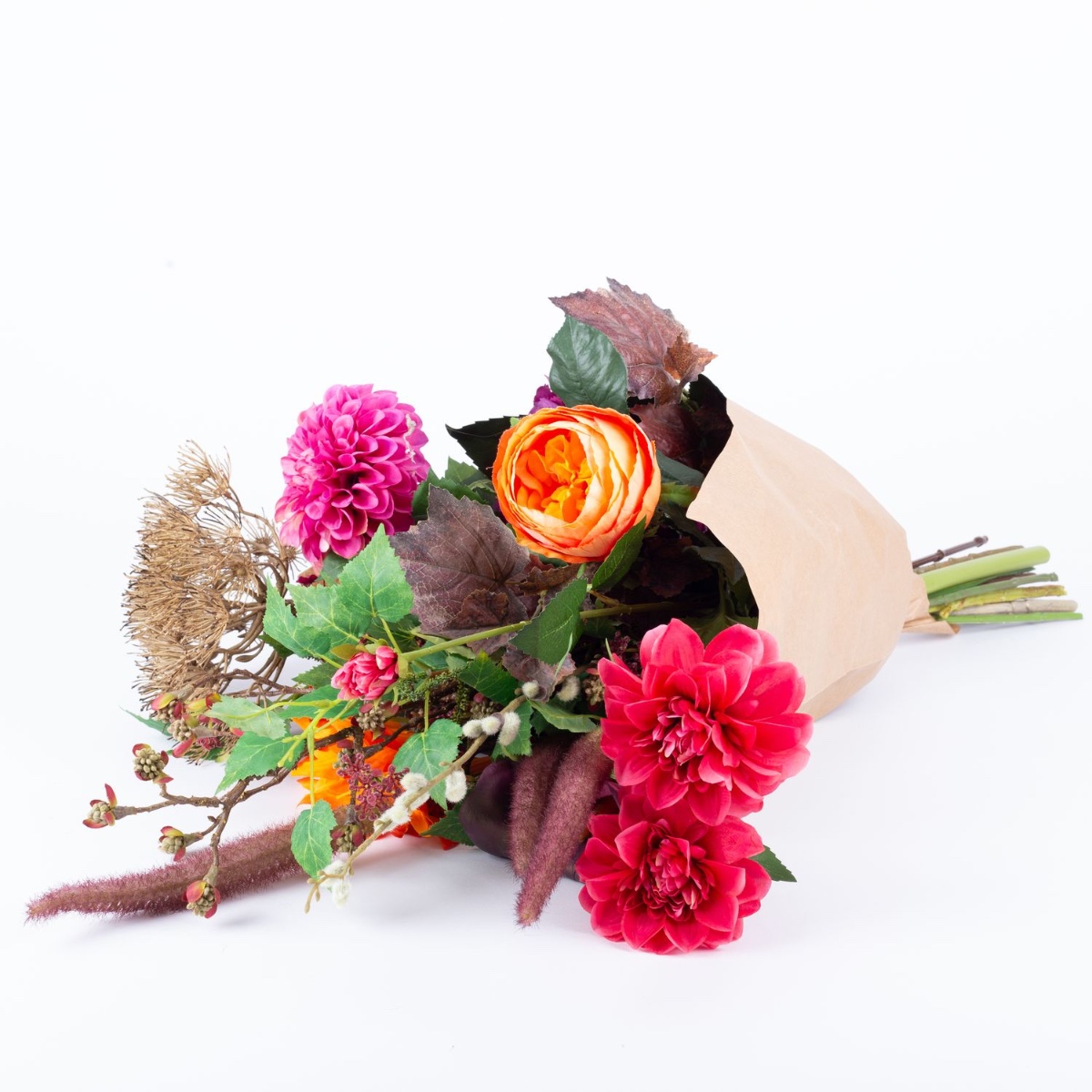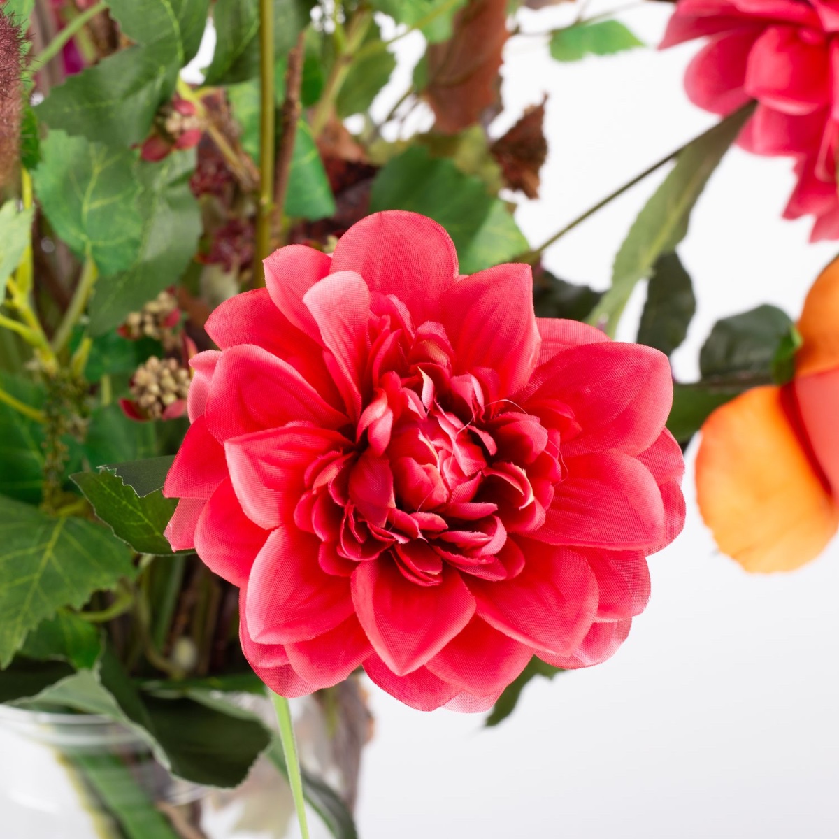 - Bouquet artificiel REJNA composé des produits suivants ou au moins équivalents : dahlia pompon frappant, fleur de berce géante, calla imposant, hortensia luxuriant, dahlias brillants, rose-chou classique, gypsophile délicat, chaton de saule et pennisetum délicats, érable fleuri, feuilles de vigne colorées, branche de bouleau à longue tige ainsi qu'une grande feuille d'aralia comme accessoire