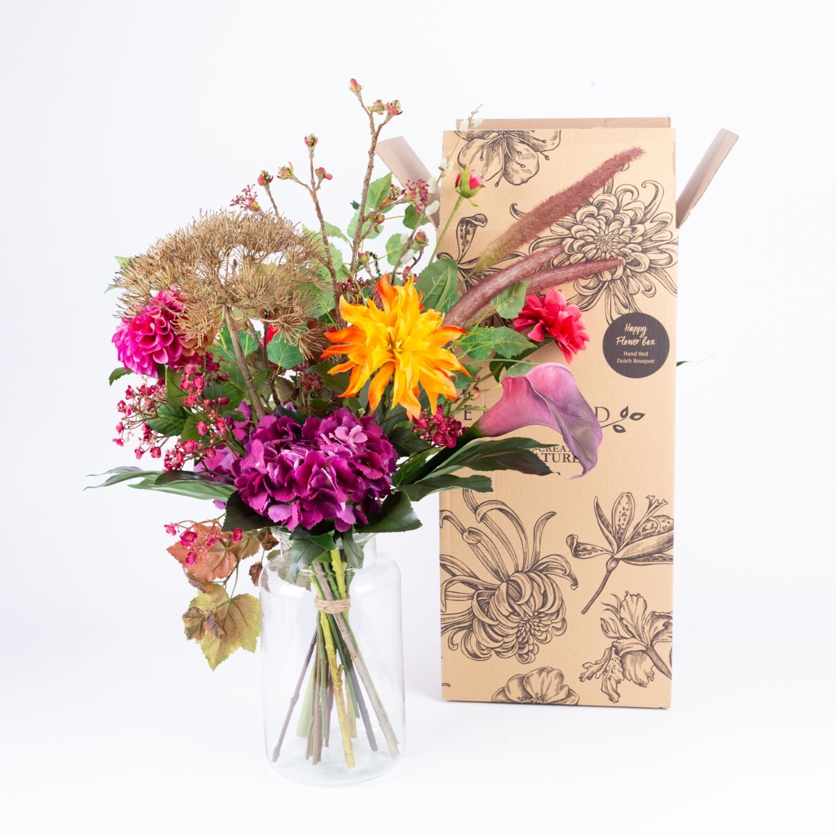 Météo maussade et des couleurs vives. Ce bouquet de fleurs incarne l'automne sous toutes ses facettes. Les fleurs lumineuses de l'hortensia, du calla et des deux dahlias entourent la berce brunâtre fanée, le pennisetum et les feuilles de vigne automnales.
