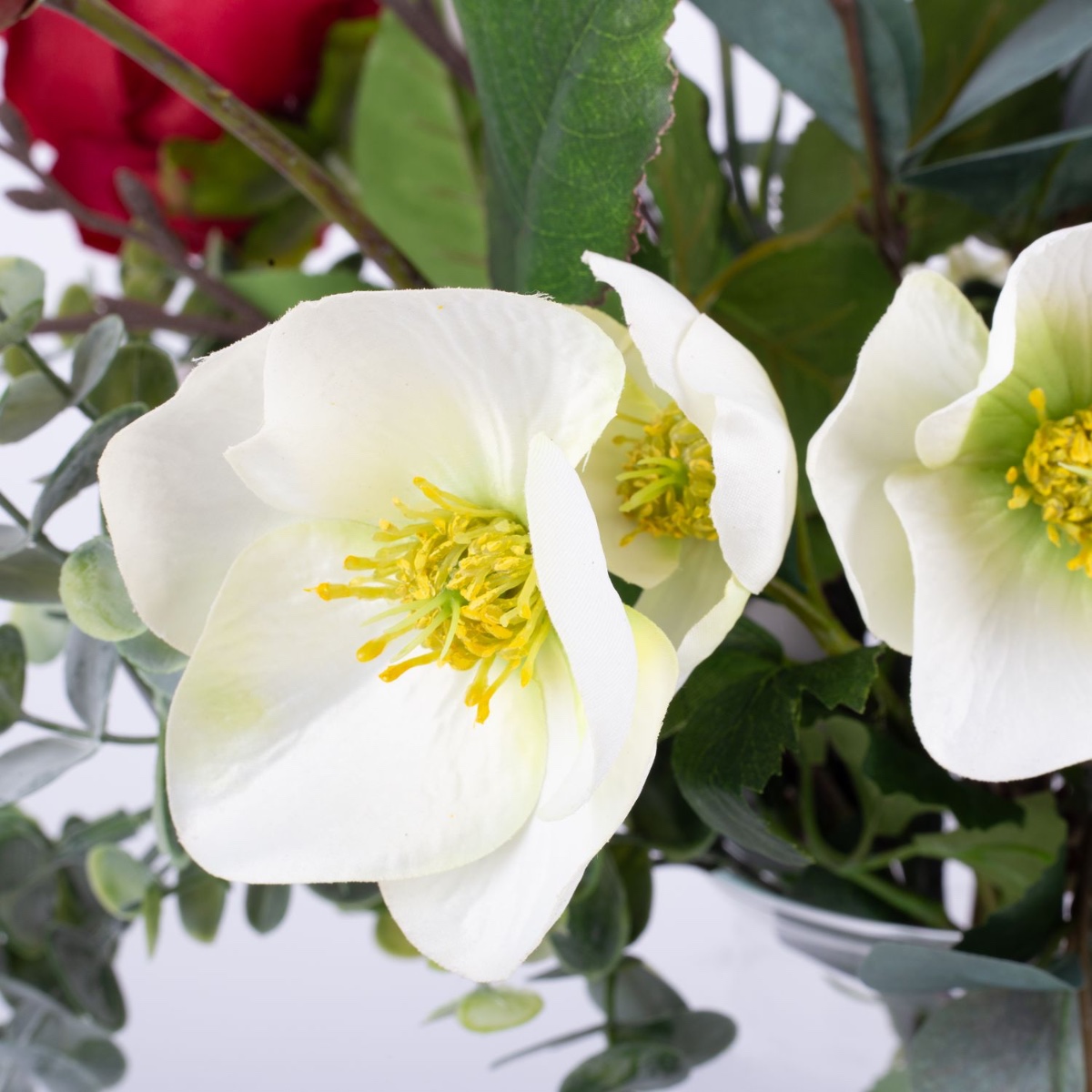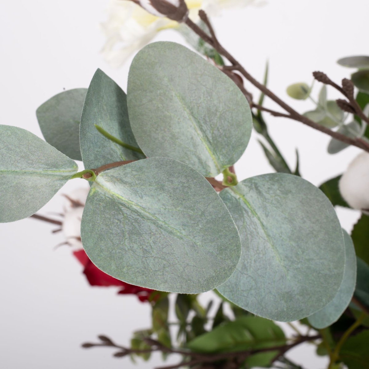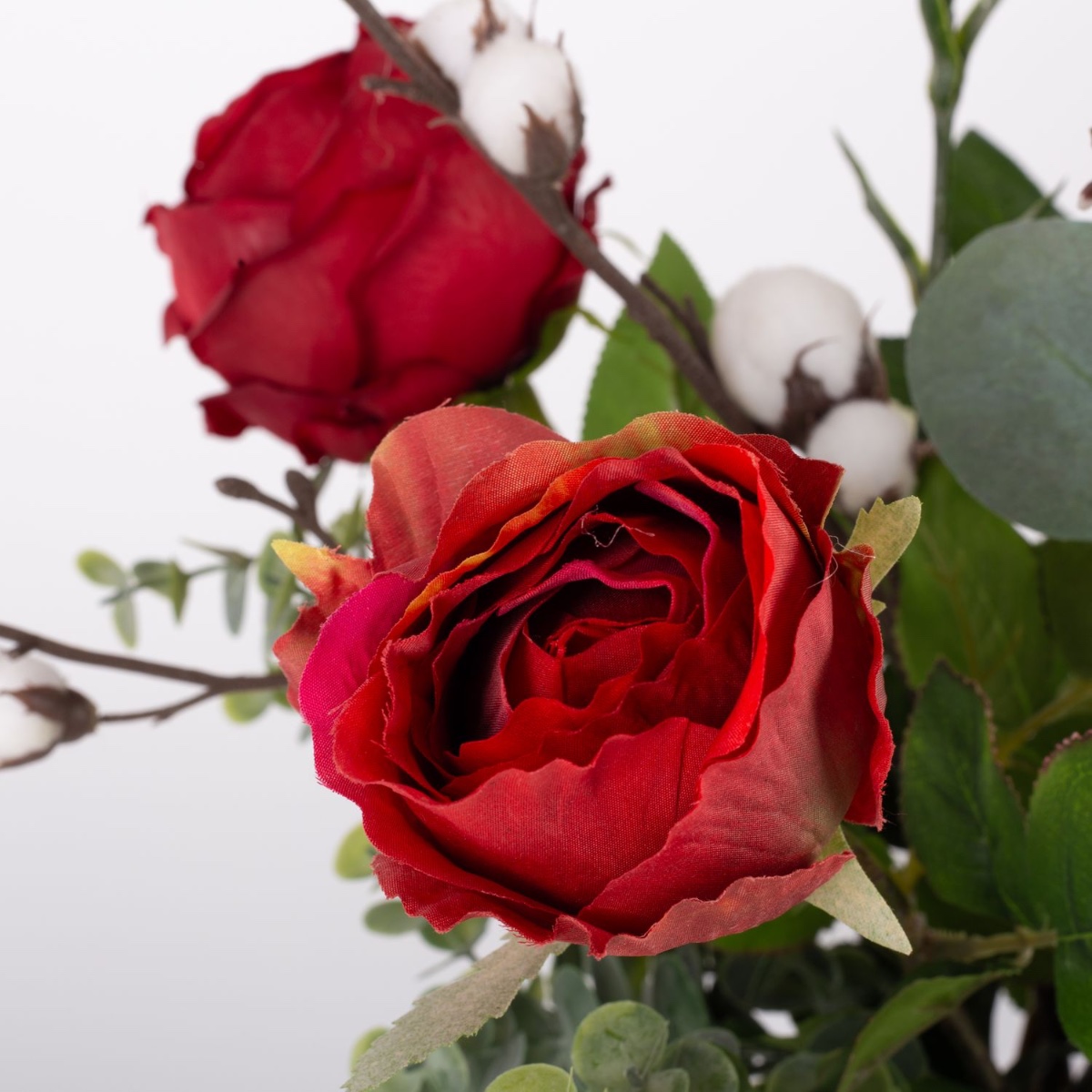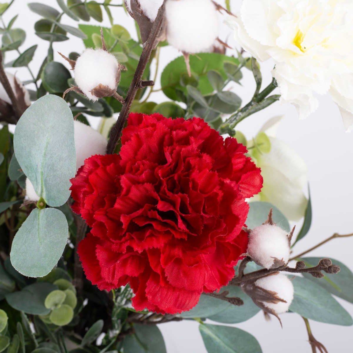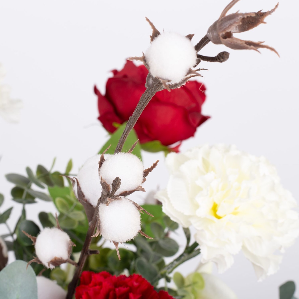 - Bouquet artificiel FUYUMI composé des produits suivants ou au moins équivalents : roses élégantes, jolis œillets, rose de Noël festive, fleurs de coton de type boule de neige et eucalyptus comme accessoires