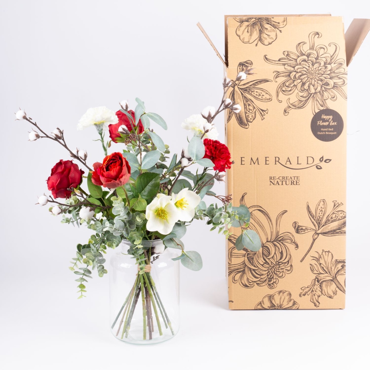 Le rouge et le blanc. C'est Noël ! Ce bouquet d'hiver fait naître la joie à l'approche de Noël et crée une ambiance chaleureuse dans la pièce. Les fleurs de coton, qui ressemblent à de petites boules de neige, sont entourées de roses, d'œillets, de roses de Noël et de branches d'eucalyptus. Un bouquet d'hiver interprété de manière moderne, qui constitue un accueil chaleureux dans chaque entrée.