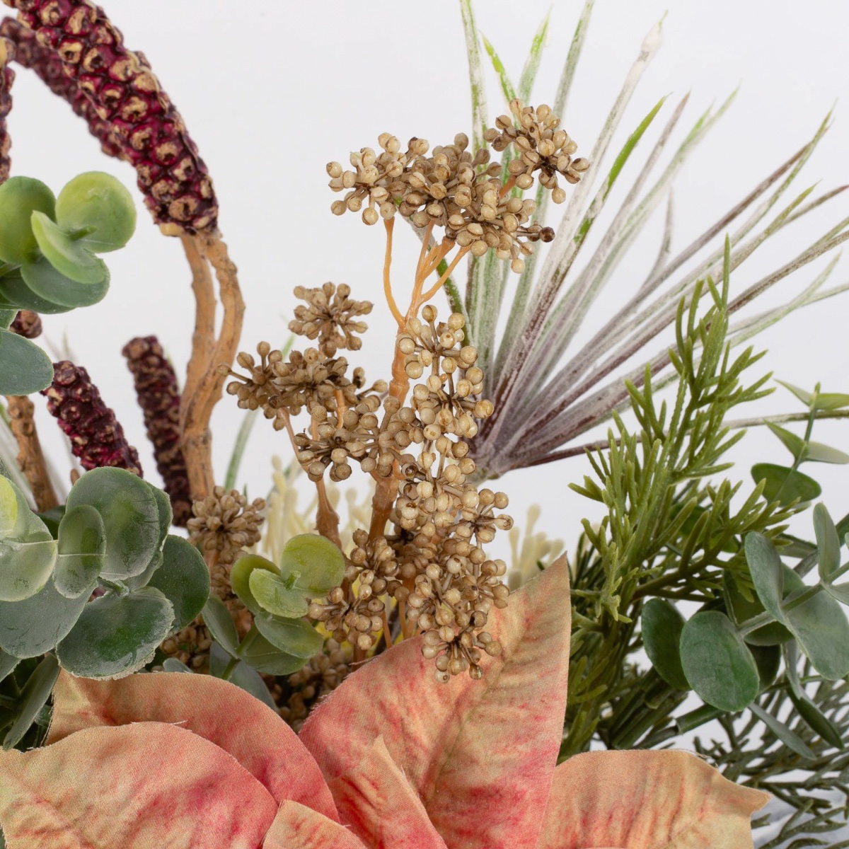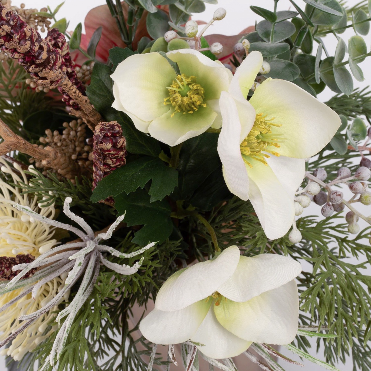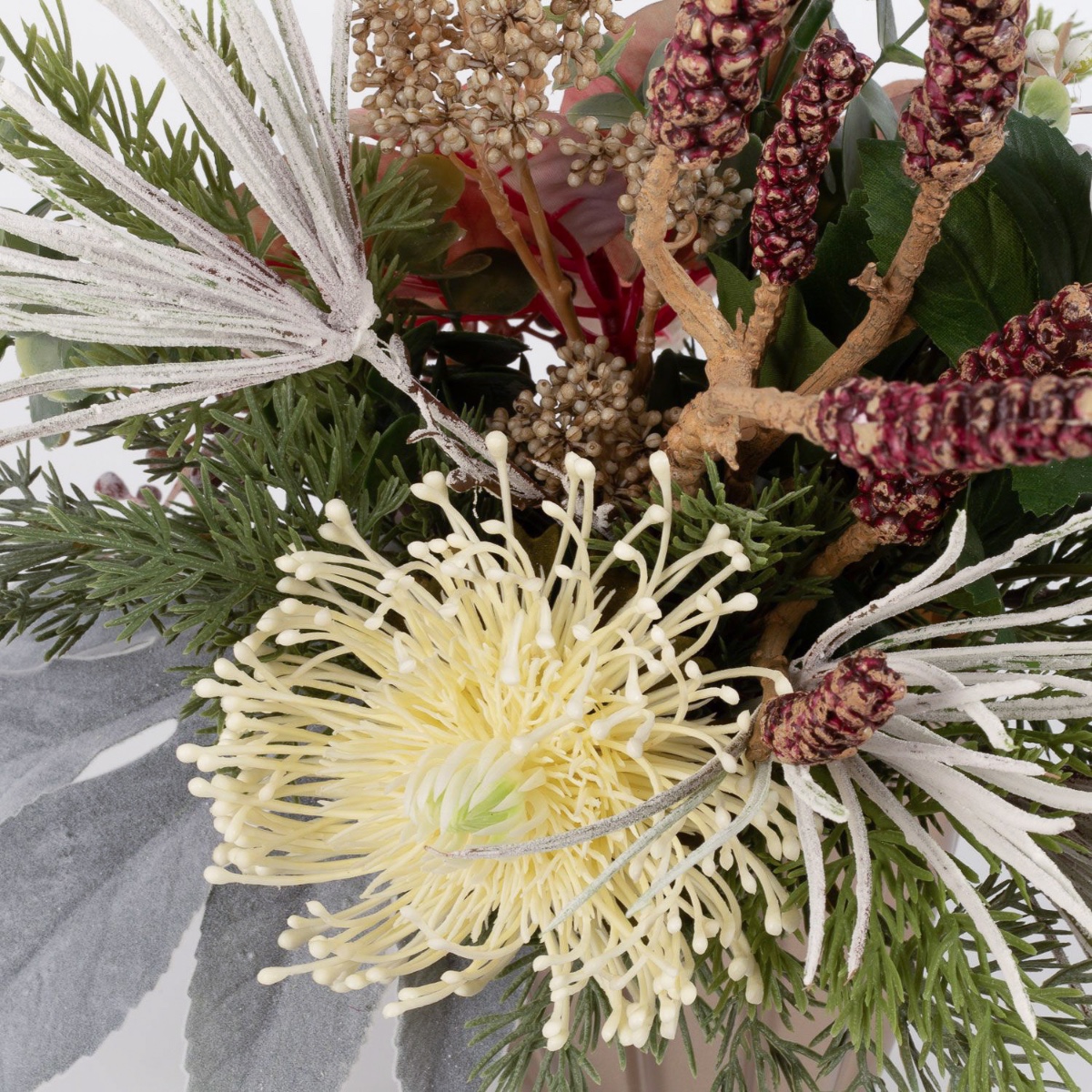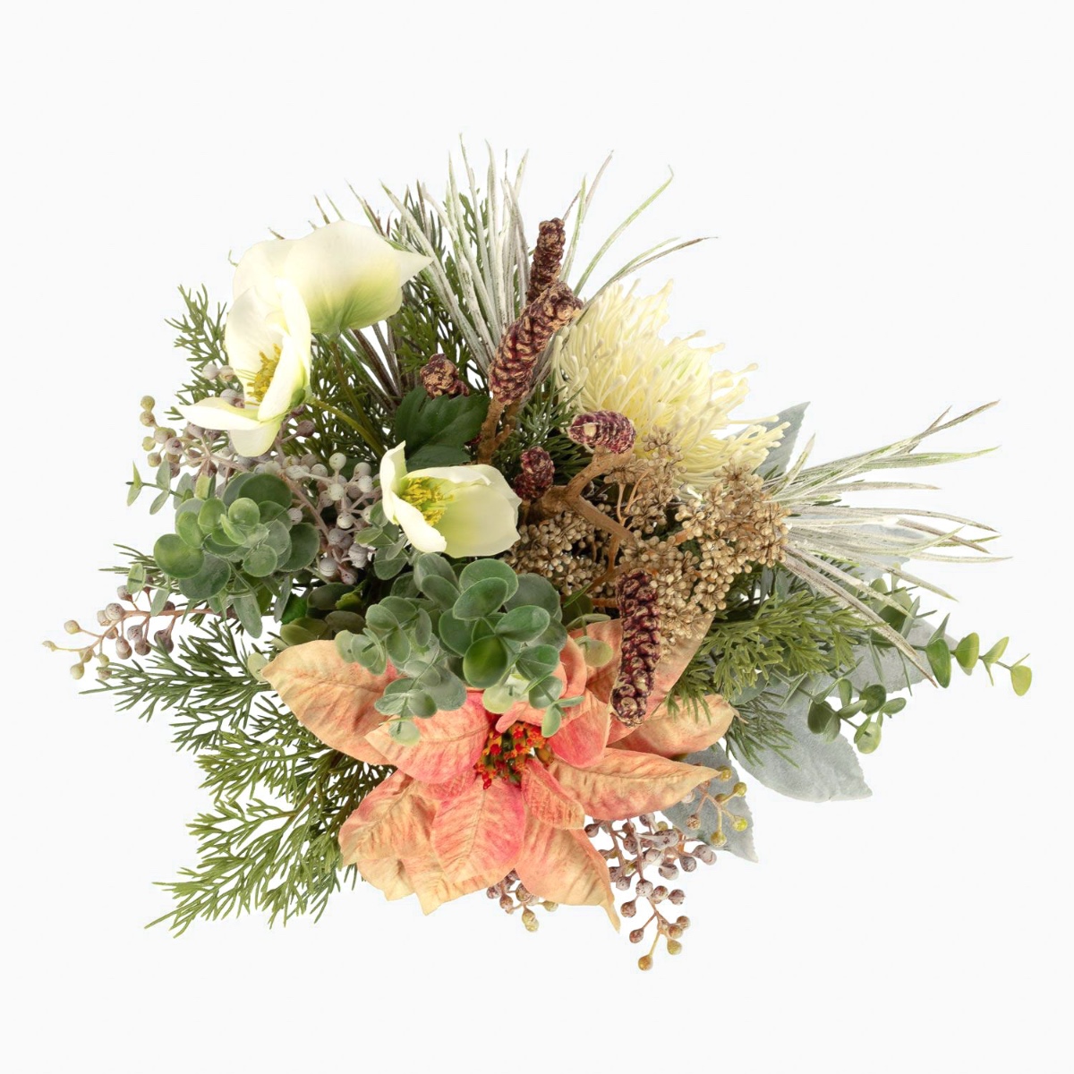Ce bouquet de fleurs artificielles NOANA est un ravissant cadeau d'hiver. Outre Etoile de Noël abondante, la protéa ludique et la jolie rose de Noël, l'eucalyptus et l'cèdre se détachent de l'ensemble floral.