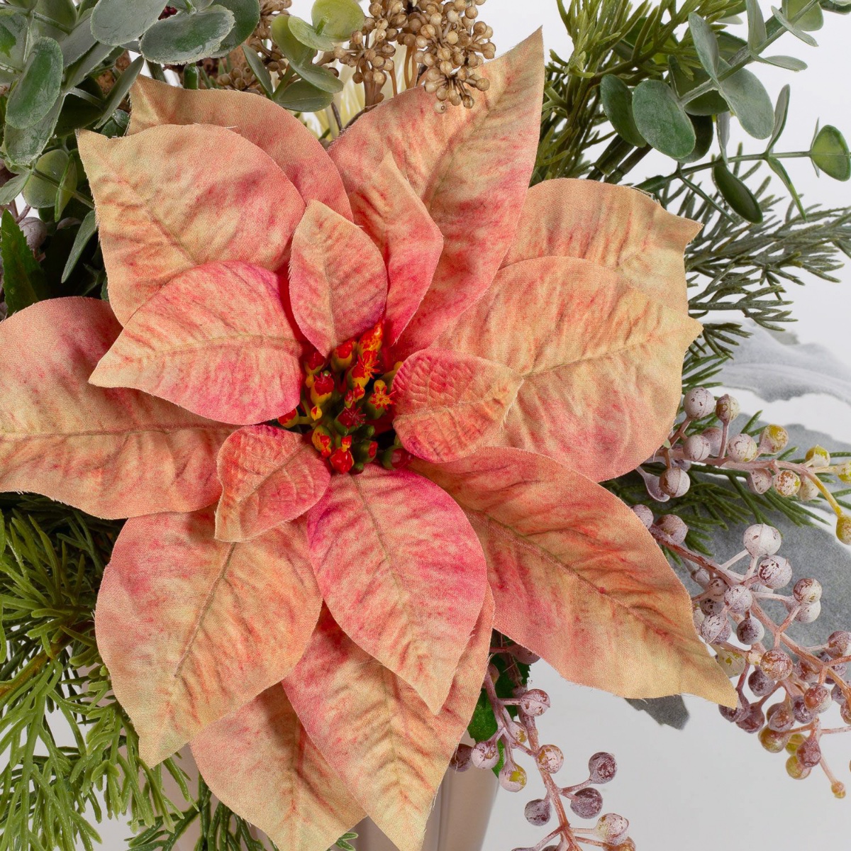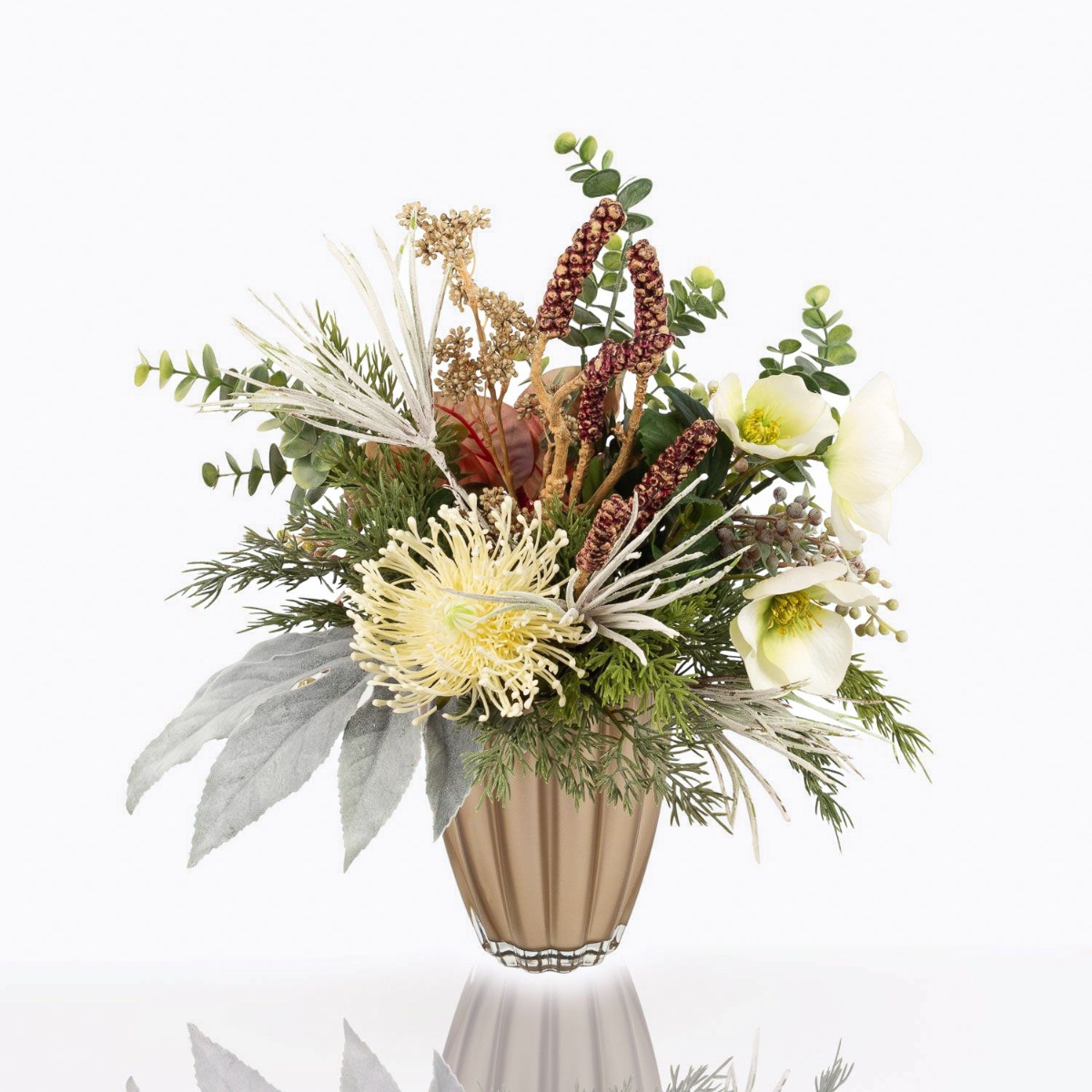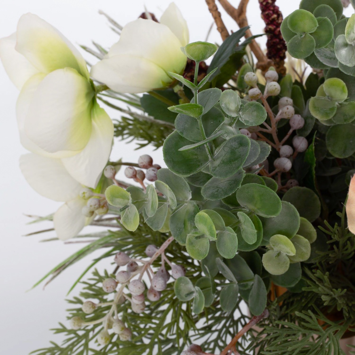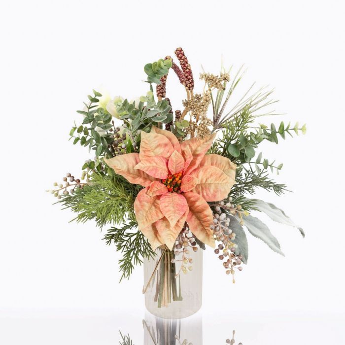 Ce bouquet de fleurs artificielles NOANA est un ravissant cadeau d'hiver. Outre Etoile de Noël abondante, la protéa ludique et la jolie rose de Noël, l'eucalyptus et l'cèdre se détachent de l'ensemble floral.