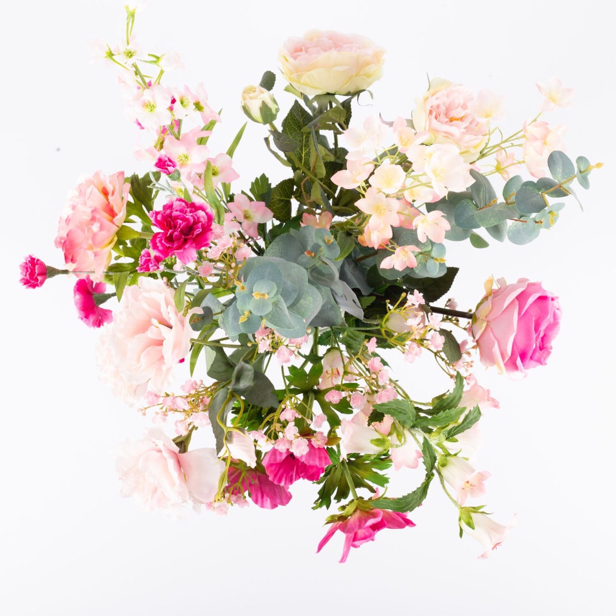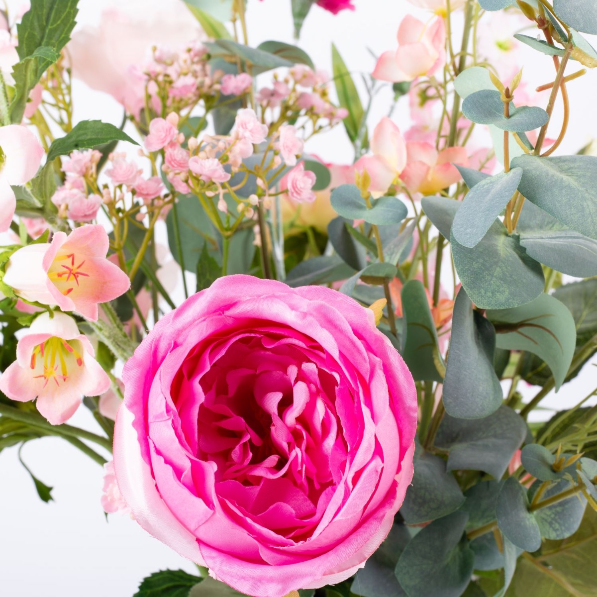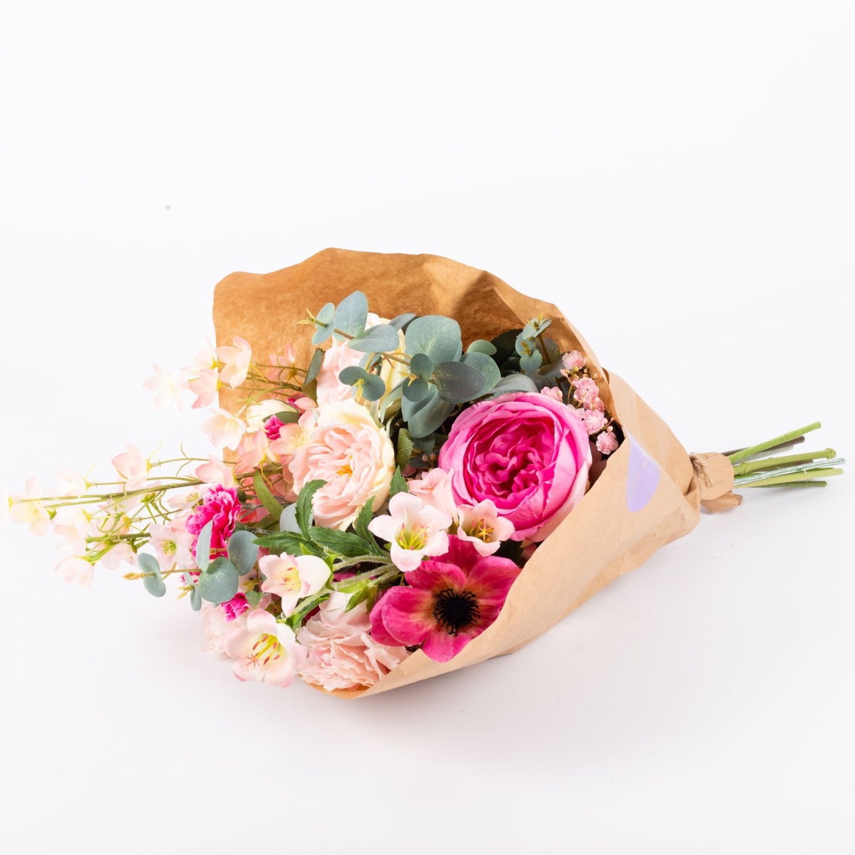 - Bouquet artificiel ROSALINE composé des produits suivants ou au moins équivalents : Roses élégantes, renoncule rêveuse, jolies anémones, lisianthus enjoué, campanule à longue tige, bouton d'or et delphinium, œillets fins, gypsophile gracieux et eucalyptus comme accessoires