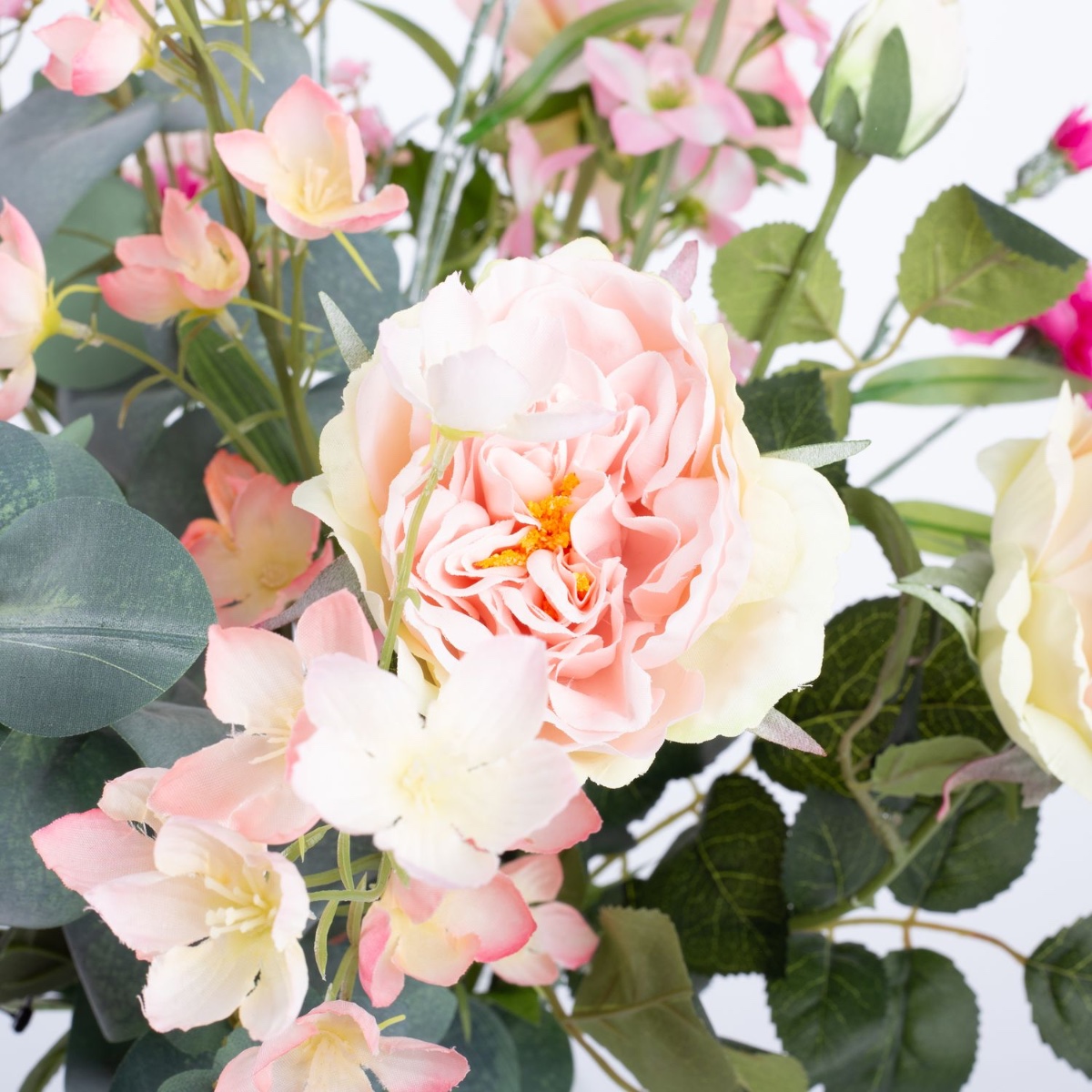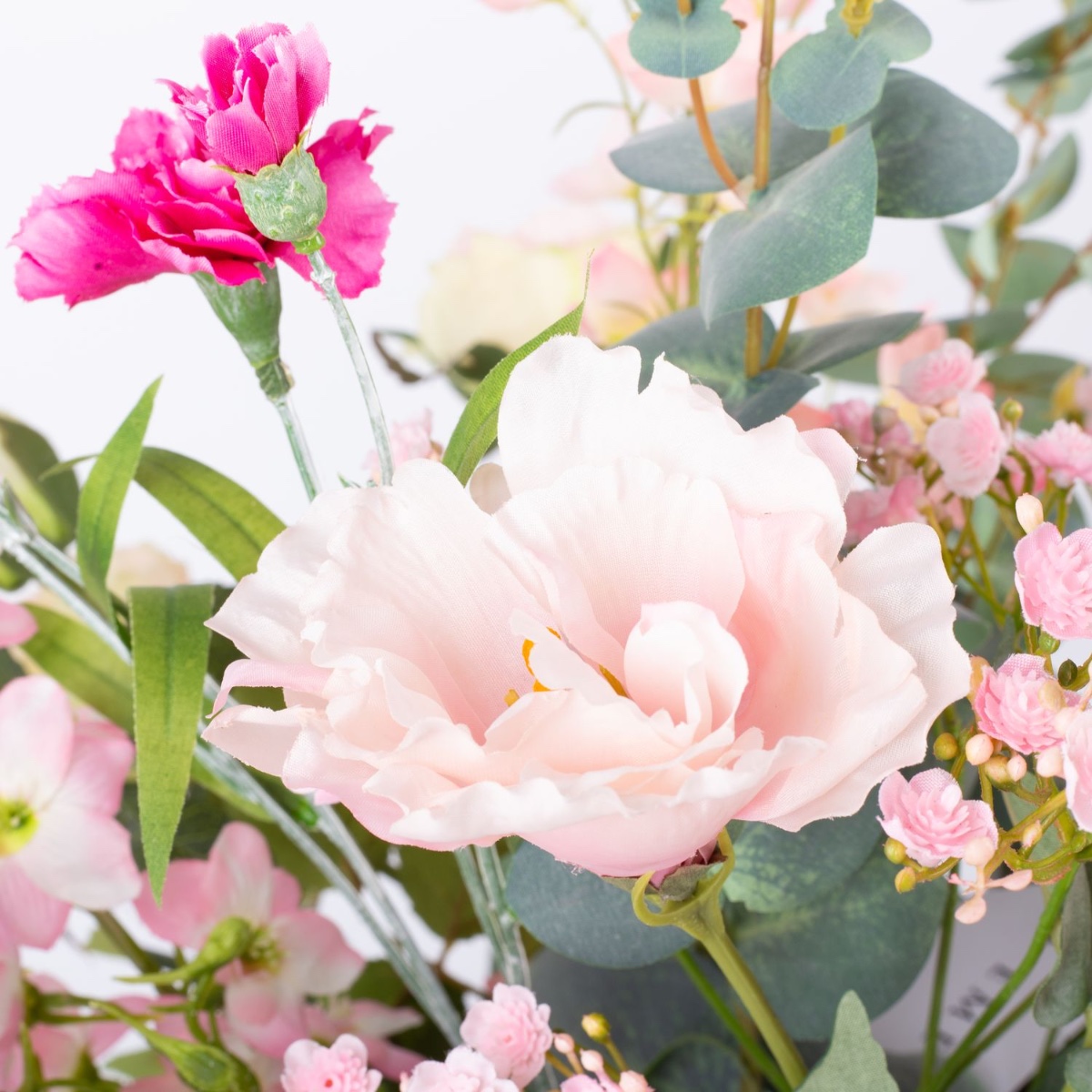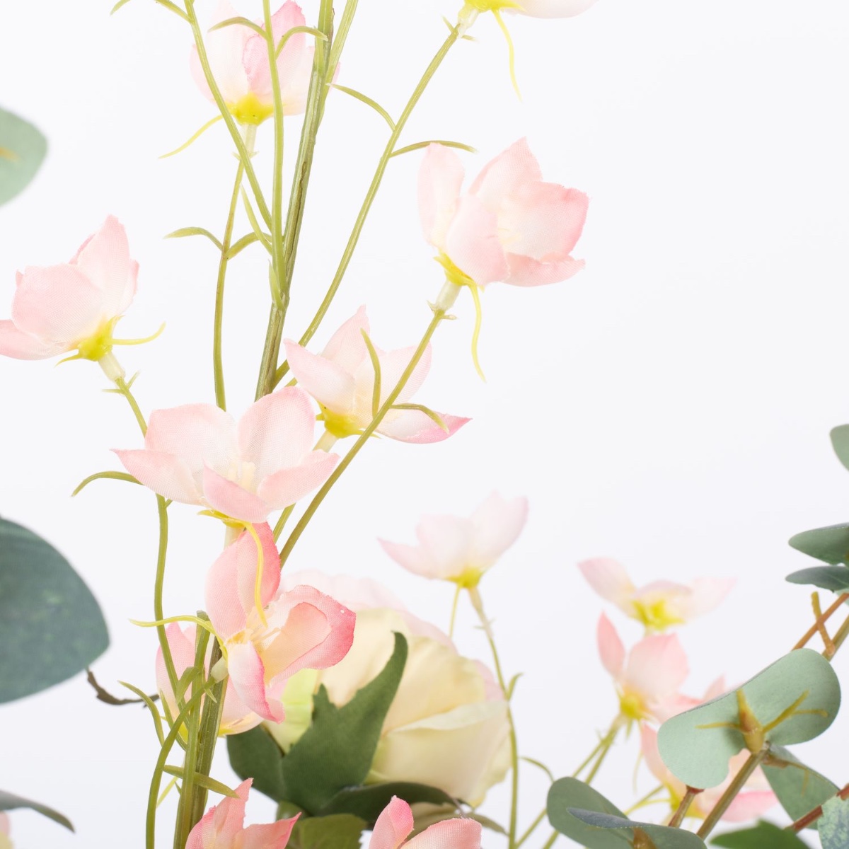 - Bouquet artificiel ROSALINE composé des produits suivants ou au moins équivalents : Roses élégantes, renoncule rêveuse, jolies anémones, lisianthus enjoué, campanule à longue tige, bouton d'or et delphinium, œillets fins, gypsophile gracieux et eucalyptus comme accessoires