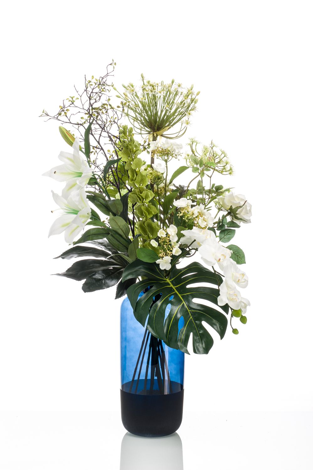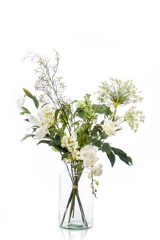 - Composition florale en soie composé de lys, orchidée Phalaenopsis, rose, ail ornemental, pied d'alouette et hortensia en blanc