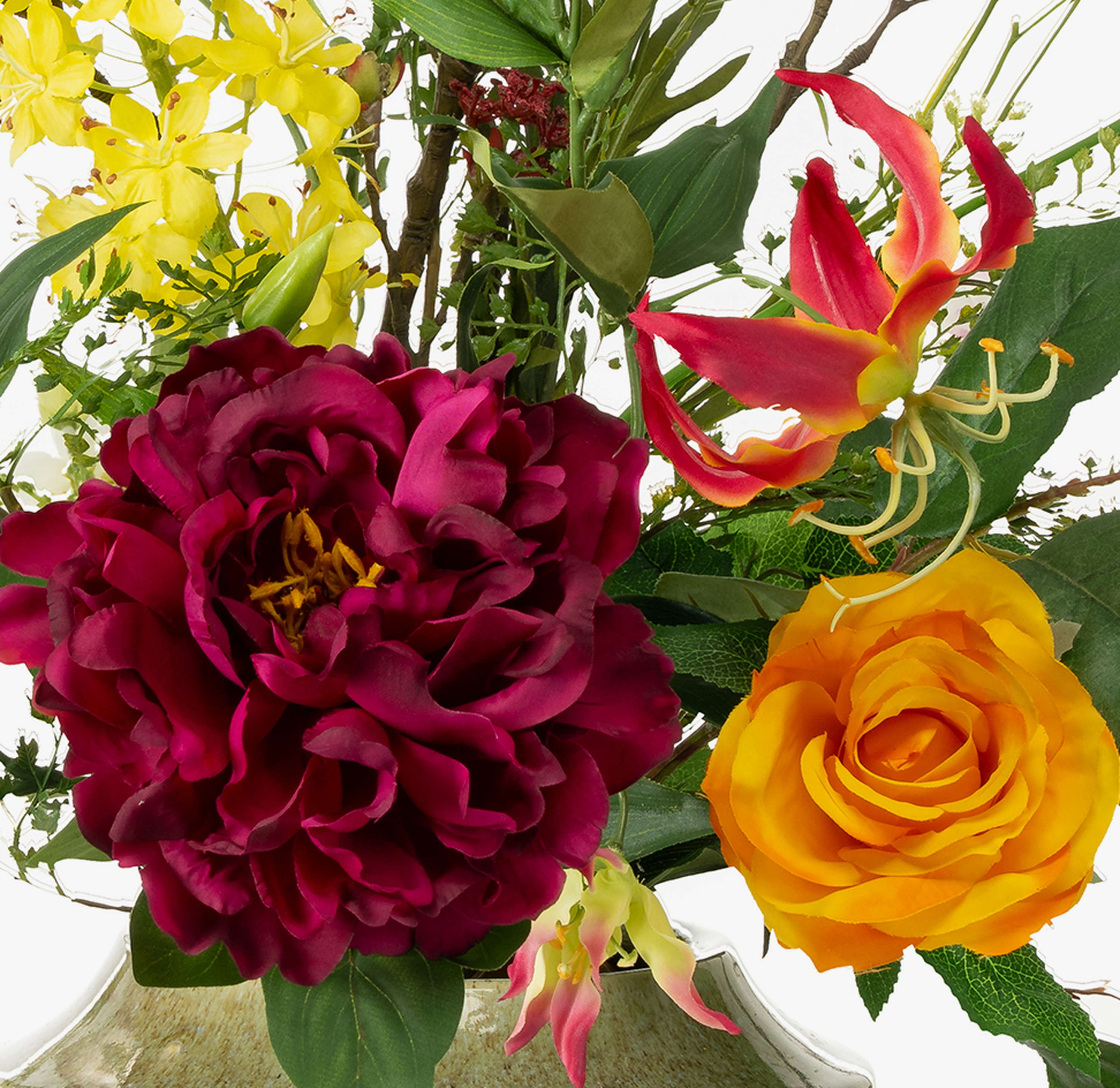 - Bouquet artificiel composé de lys, allium, gloriosa, rose, pied d'alouette, dahlia, lilas, branche d'érable, scabiosa et hortensia en orange-violet.