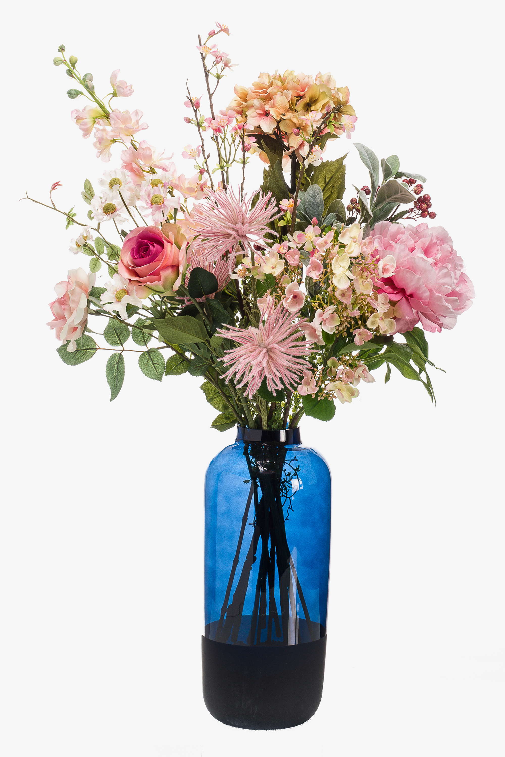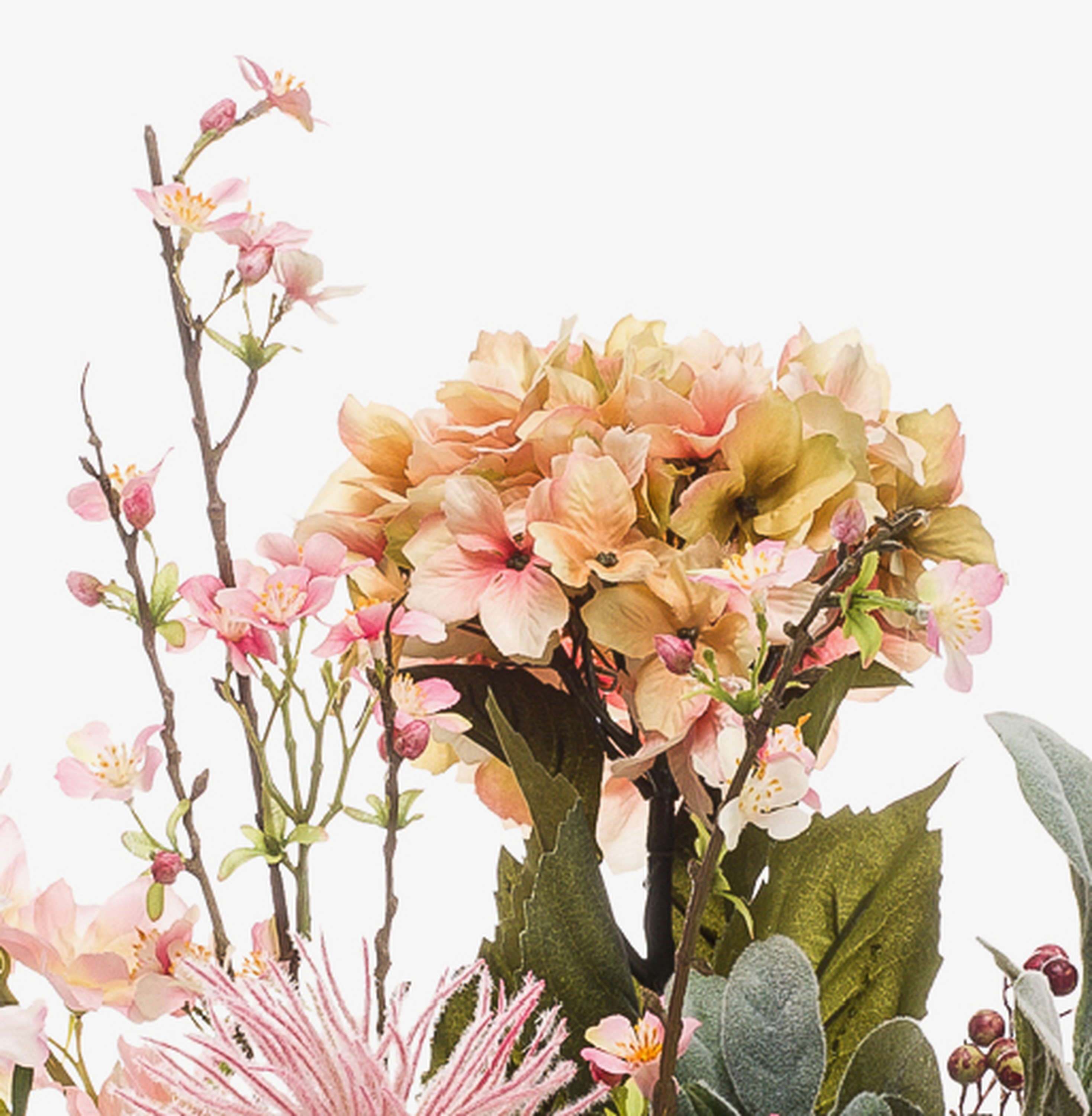 - Arrangement de fleurs artificielles composé de rose, chrysanthème, pied d'alouette, dahlia et branche de fleurs de pommier en rose.