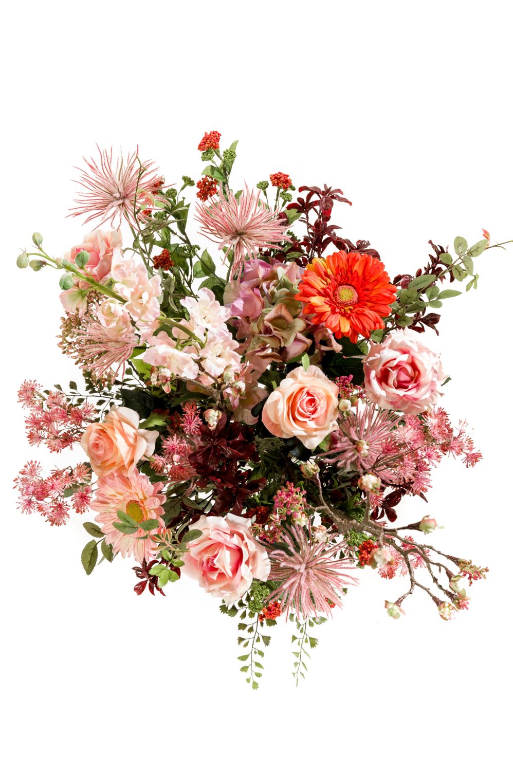 - Composition florale en soie composée de gerbera, rose, chrysanthème, reine des prés, pied d'alouette, branche d'érable et skimmia en rose-vert