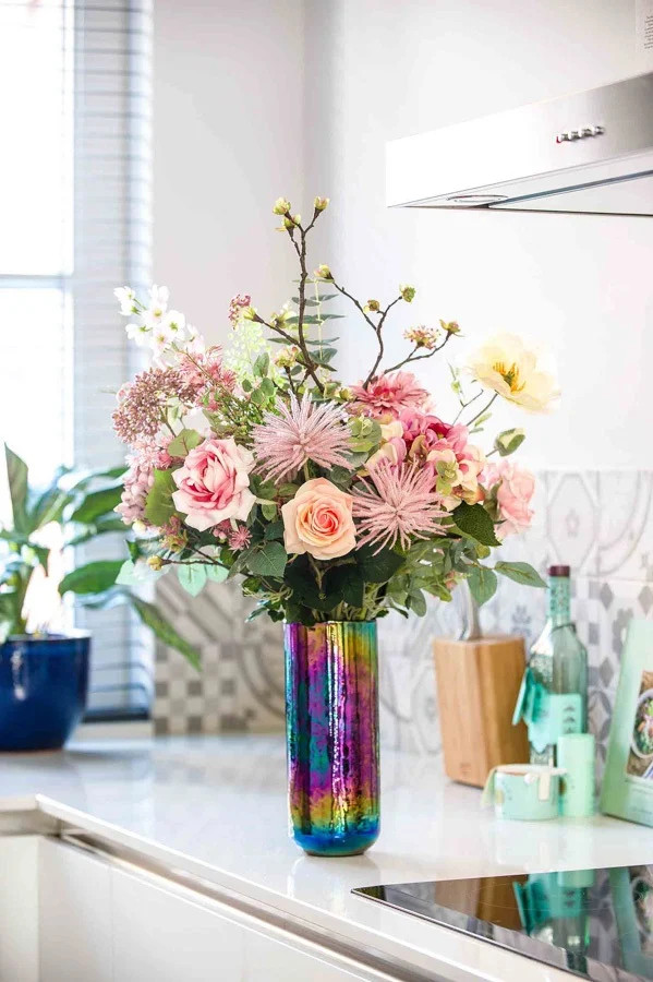 - De par ses couleurs vives et invitantes, le bouquet en tissu FEME conviendra parfaitement à l'entrée des hôtels, à la maison sur la table de cuisine ou comme cadeau pour vos proches et beaucoup plus .