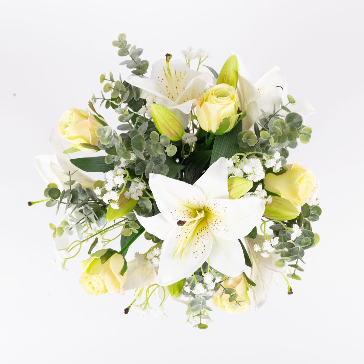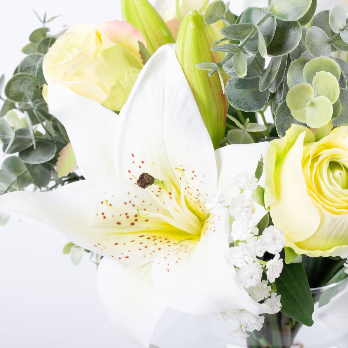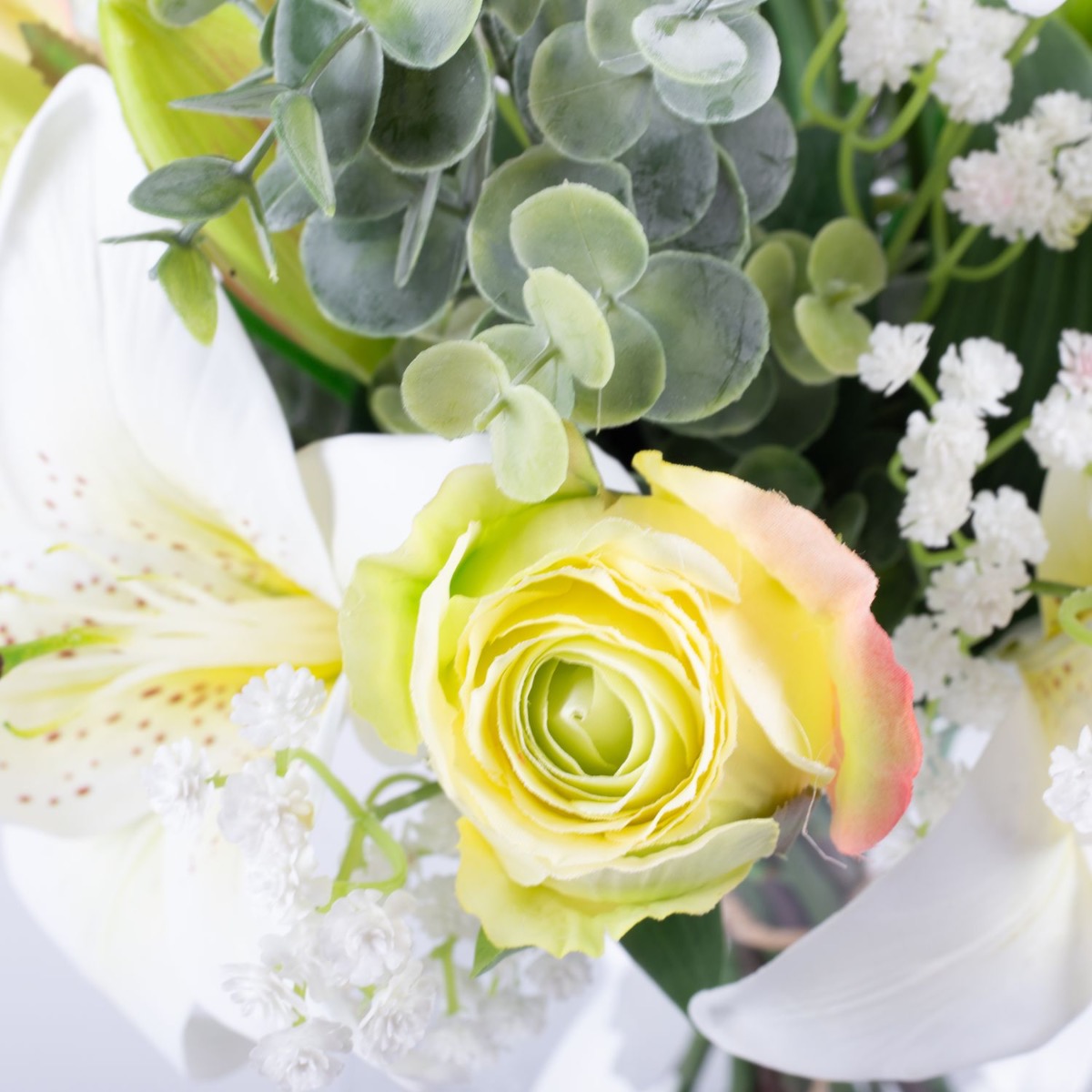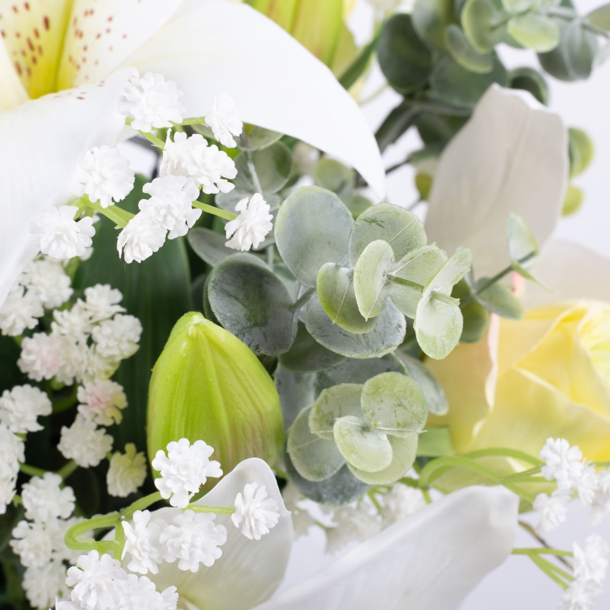 L'élégant bouquet de fleurs artificielles MARIPOSA composé de lys blancs et de roses verdâtres symbolise la renaissance et la pureté. L'ensemble floral peut être utilisé lors de mariages et d'enterrements et est complété par des branches d'eucalyptus modernes et de gypsophile classique.