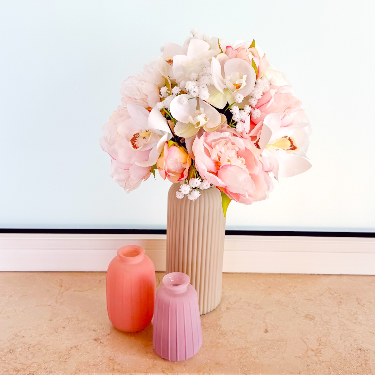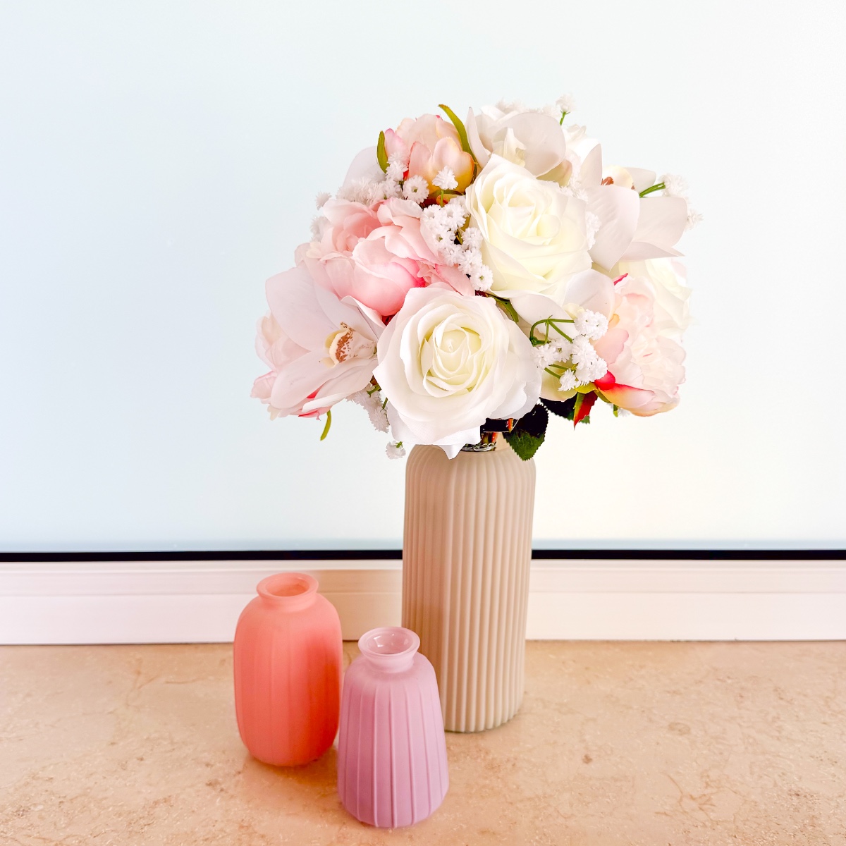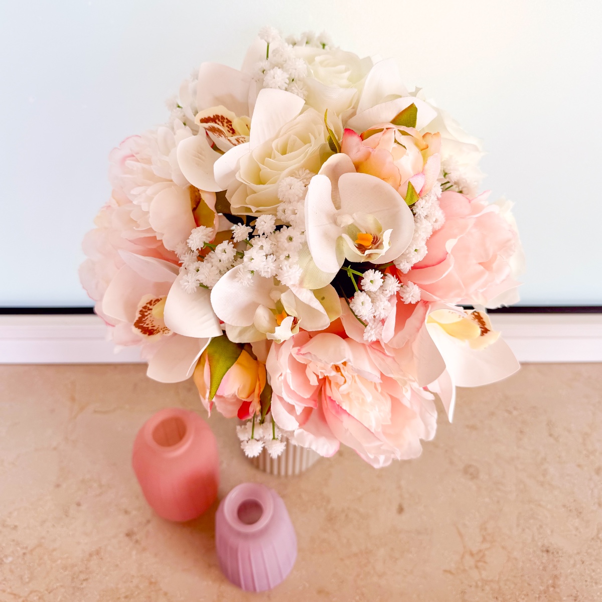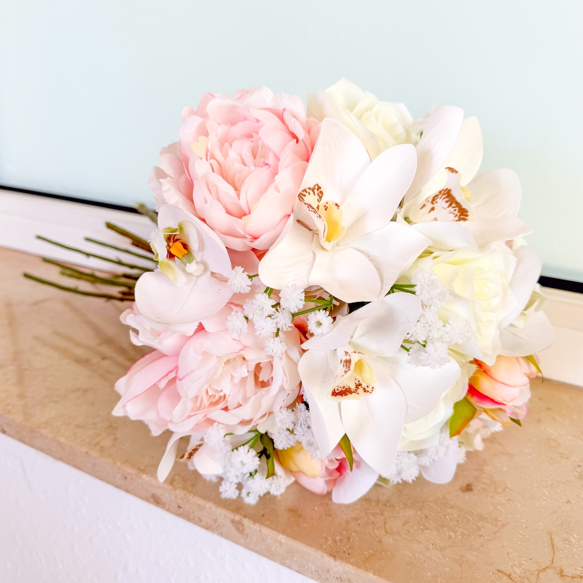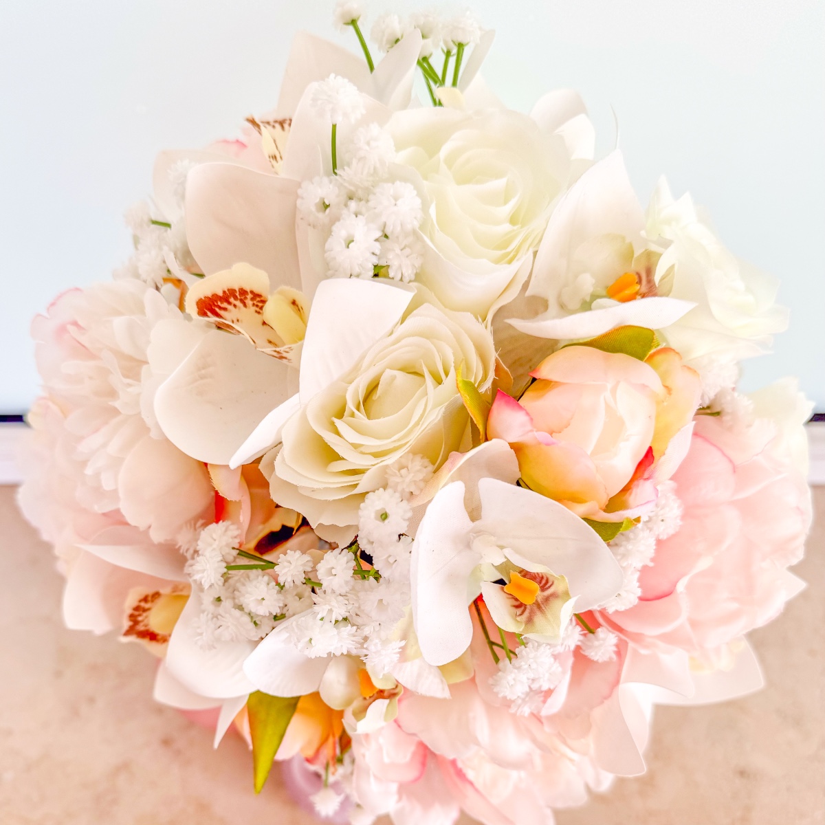La fleur de l'élégance – Le bouquet de tes rêves pour ce jour spécial ! Un bouquet de mariée raffiné qui allie élégance intemporelle et délicatesse romantique. Les magnifiques orchidées Cymbidium et Phalaenopsis blanches constituent le cœur de cette création et confèrent au bouquet un charme exclusif et luxueux. De délicates pivoines roses ajoutent une touche espiègle, tandis que les roses blanches classiques symbolisent la pureté. De la fine gypsophile complète l'arrangement et apporte légèreté et harmonie. Laissez-vous envoûter par ce bouquet de mariée et rendez votre journée inoubliable ! Shop the Look!